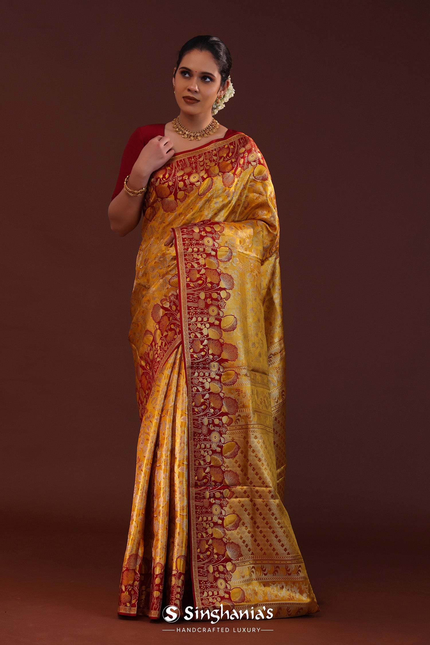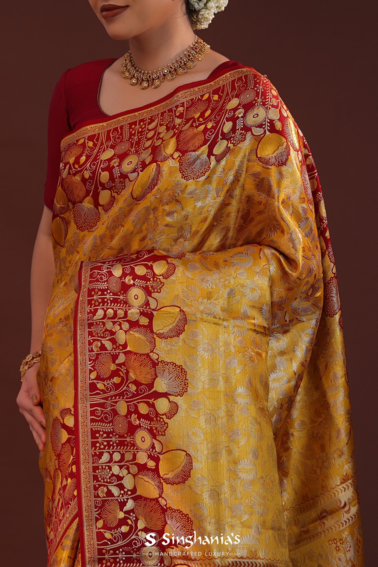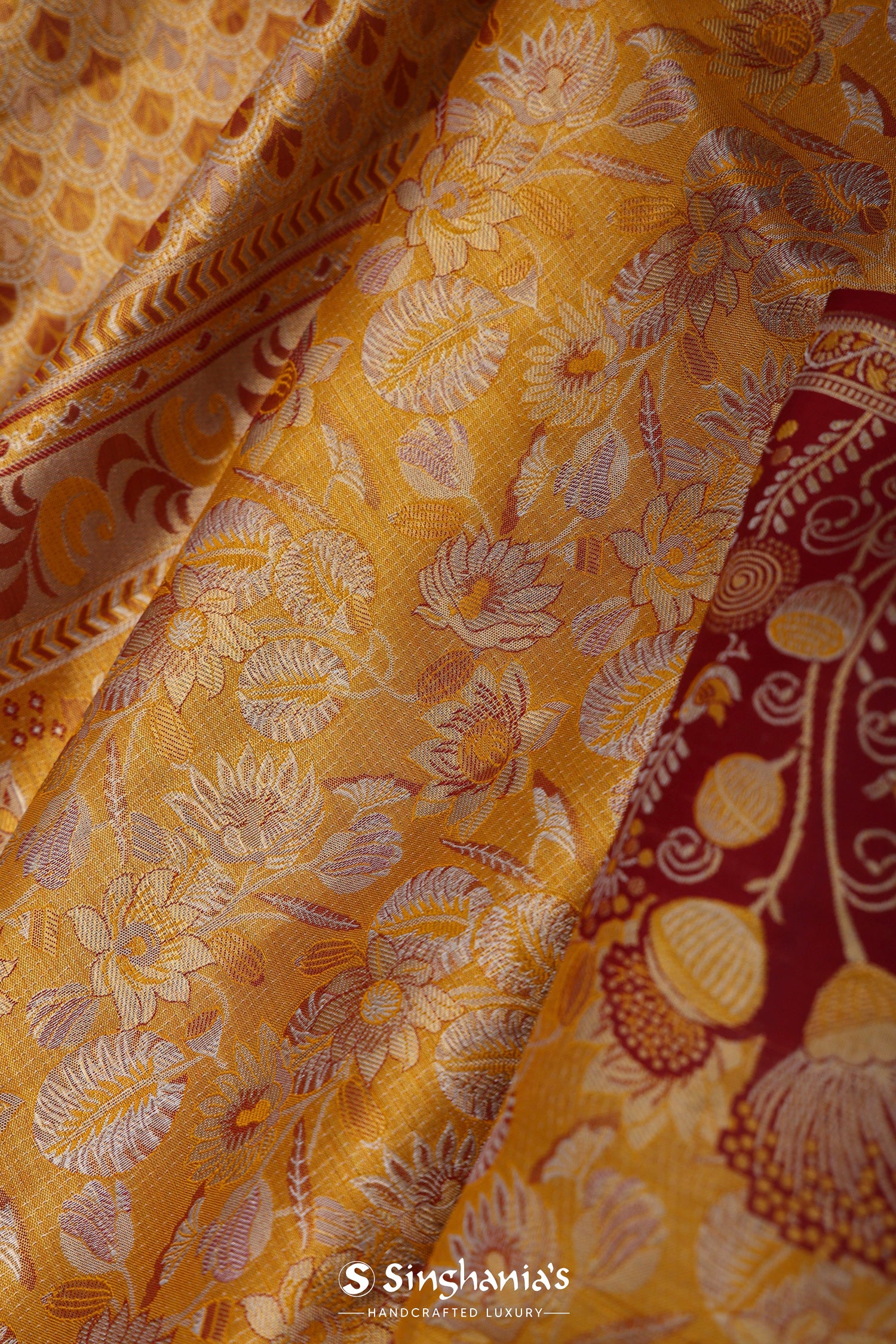 The floral jaal woven with gold and silver zari on body of the Golden kanjivaram tissue saree features contrast maroon design border and unstitched blouse