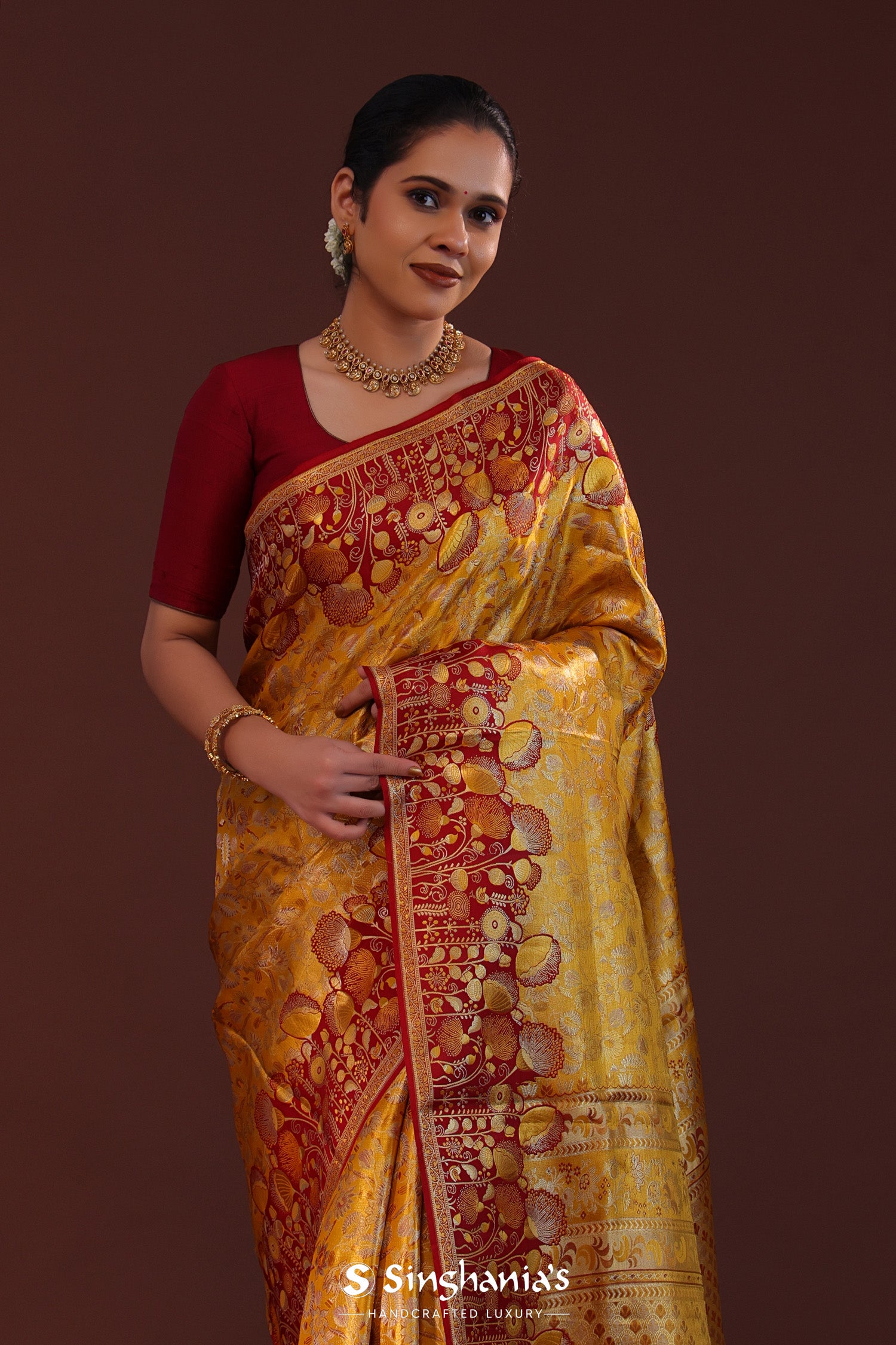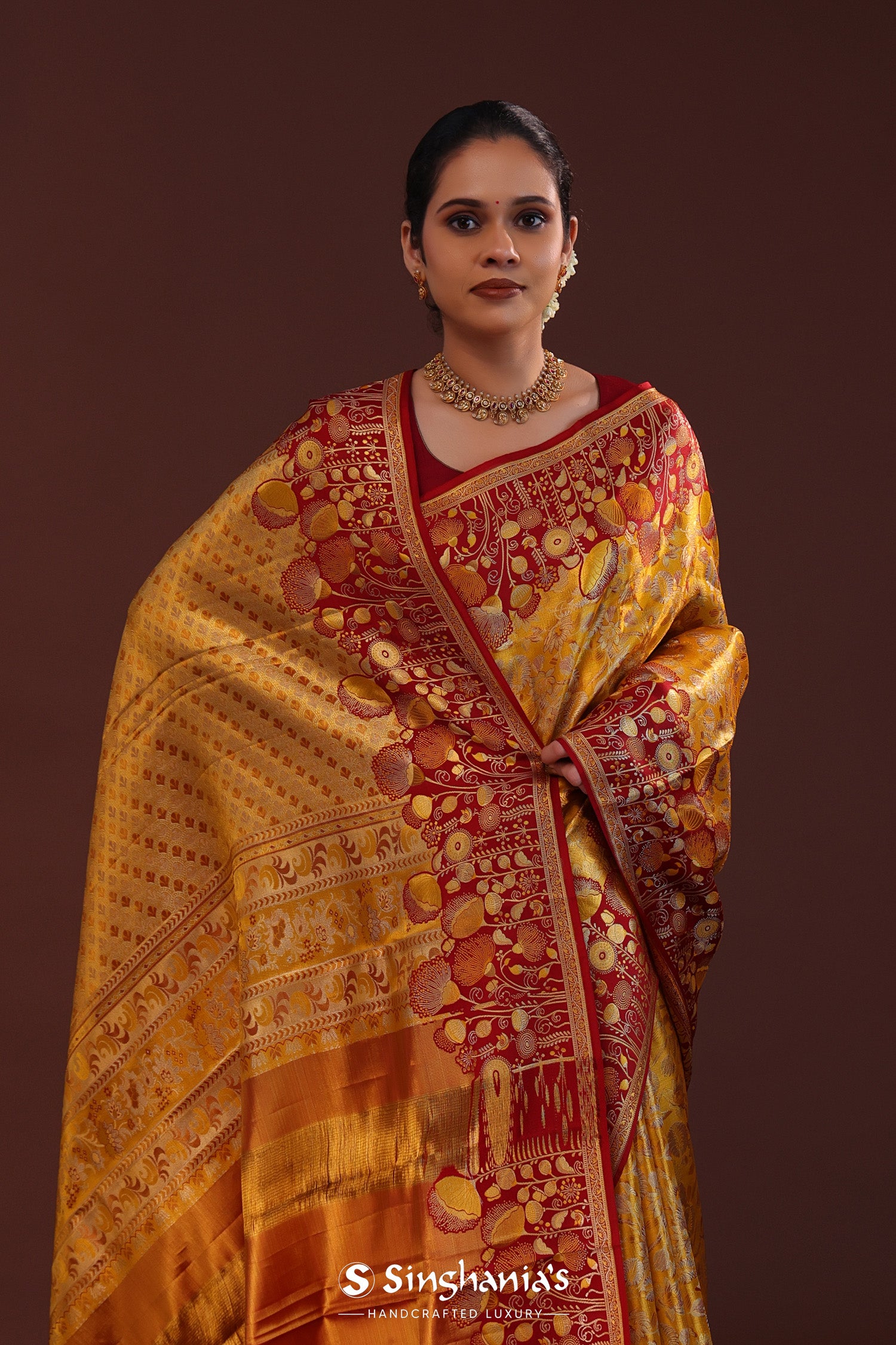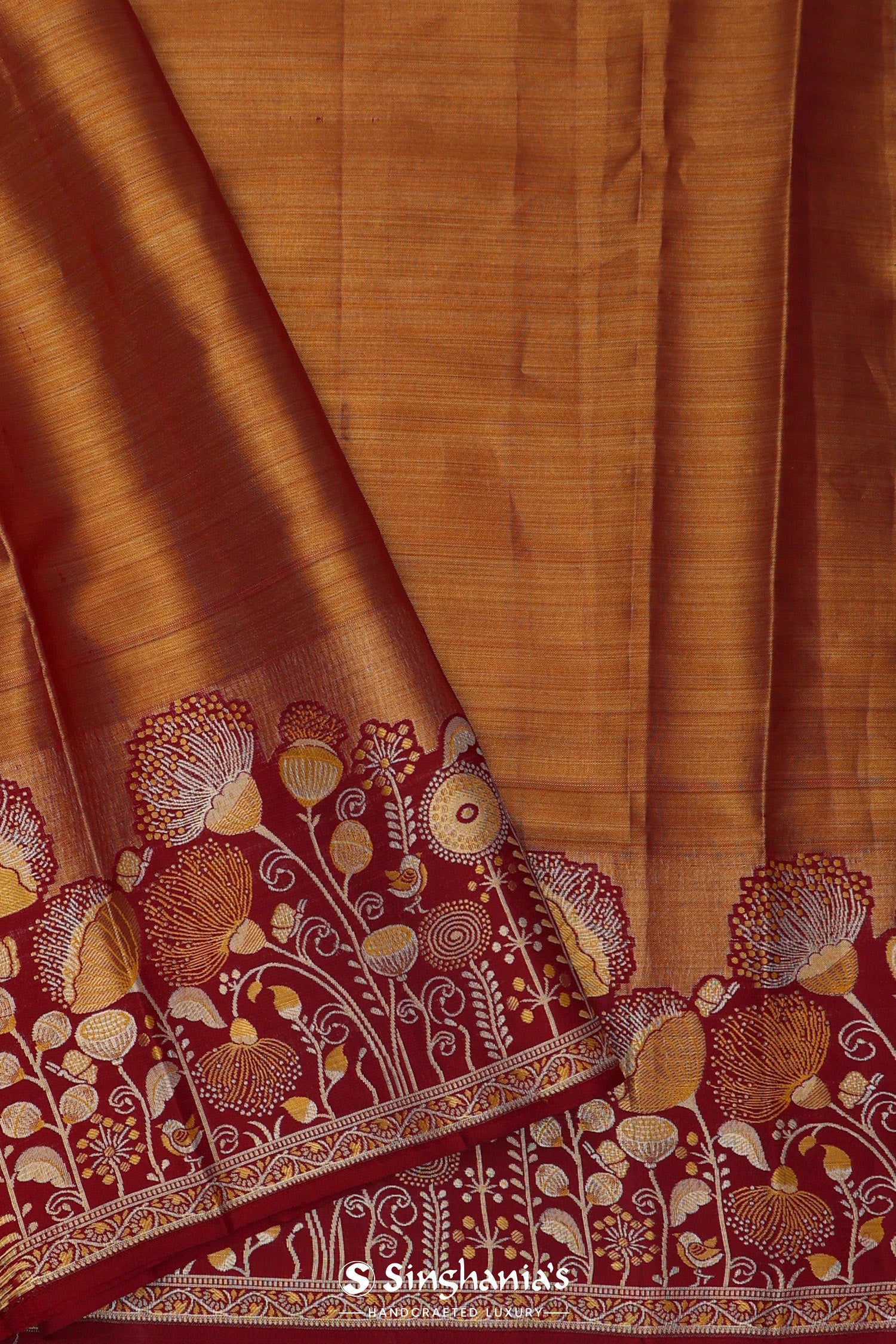 The floral jaal woven with gold and silver zari on body of the Golden kanjivaram tissue saree features contrast maroon design border and unstitched blouse