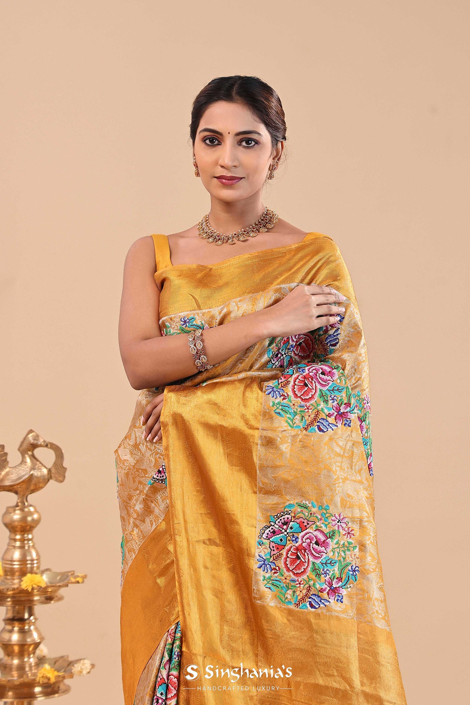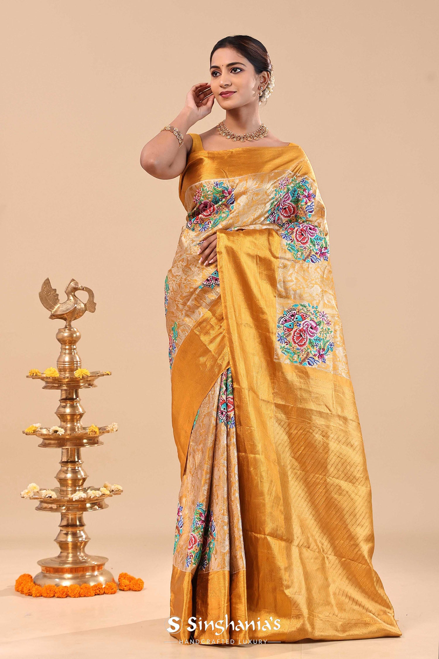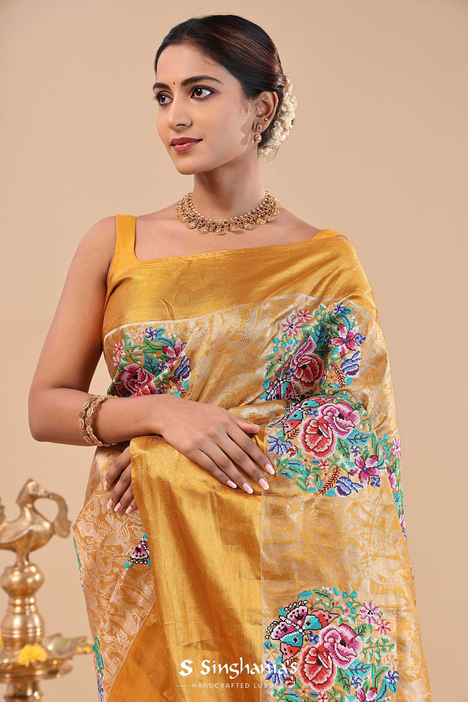 Golden Tissue Kanjivaram Saree With Petit Point Embroidery