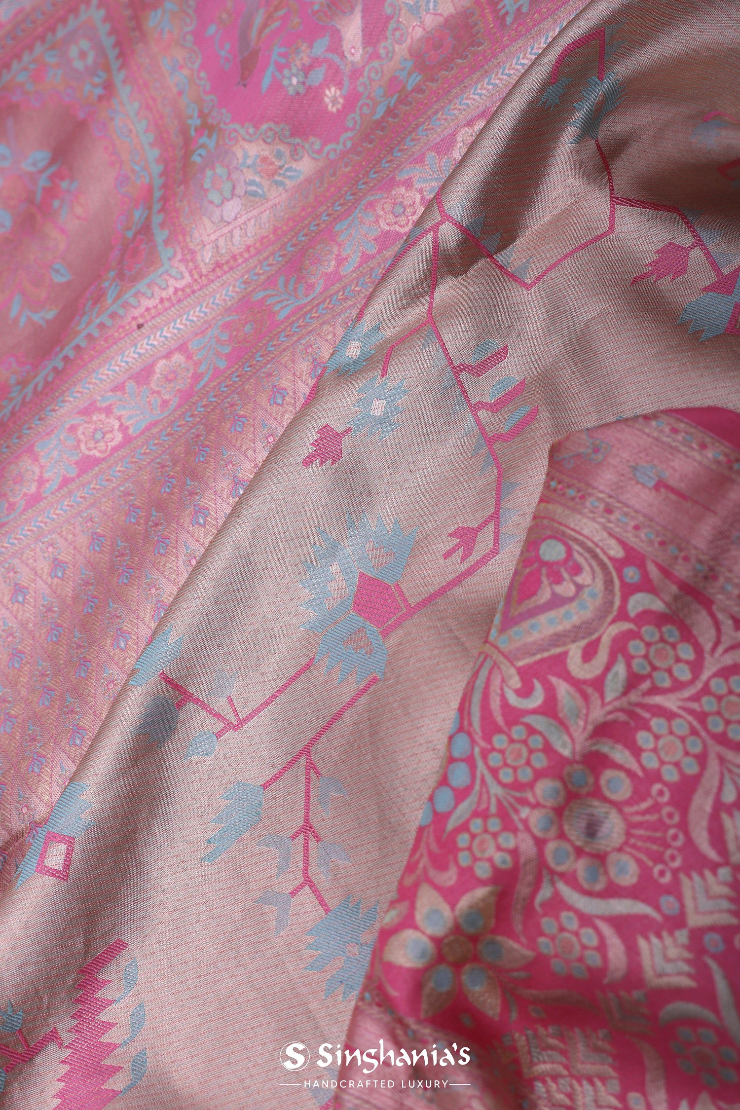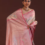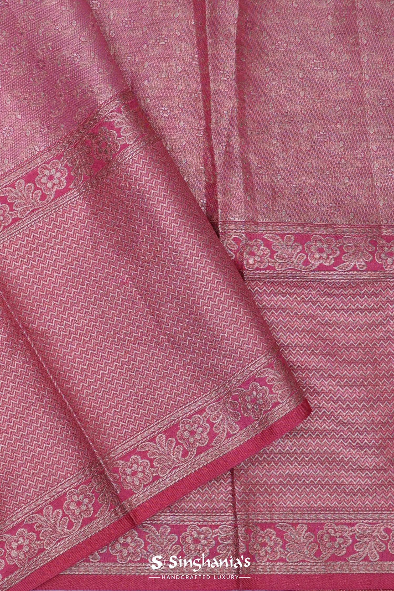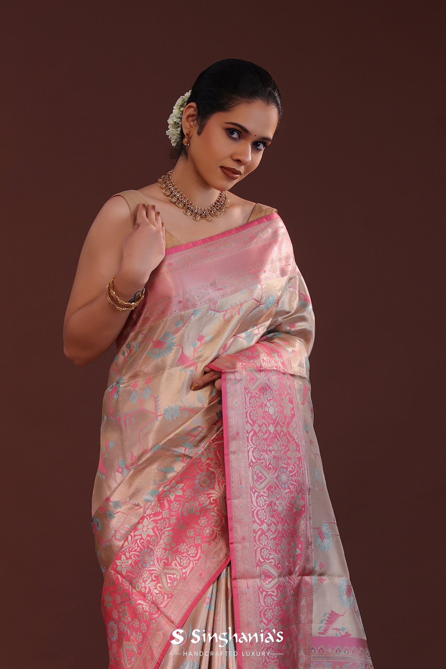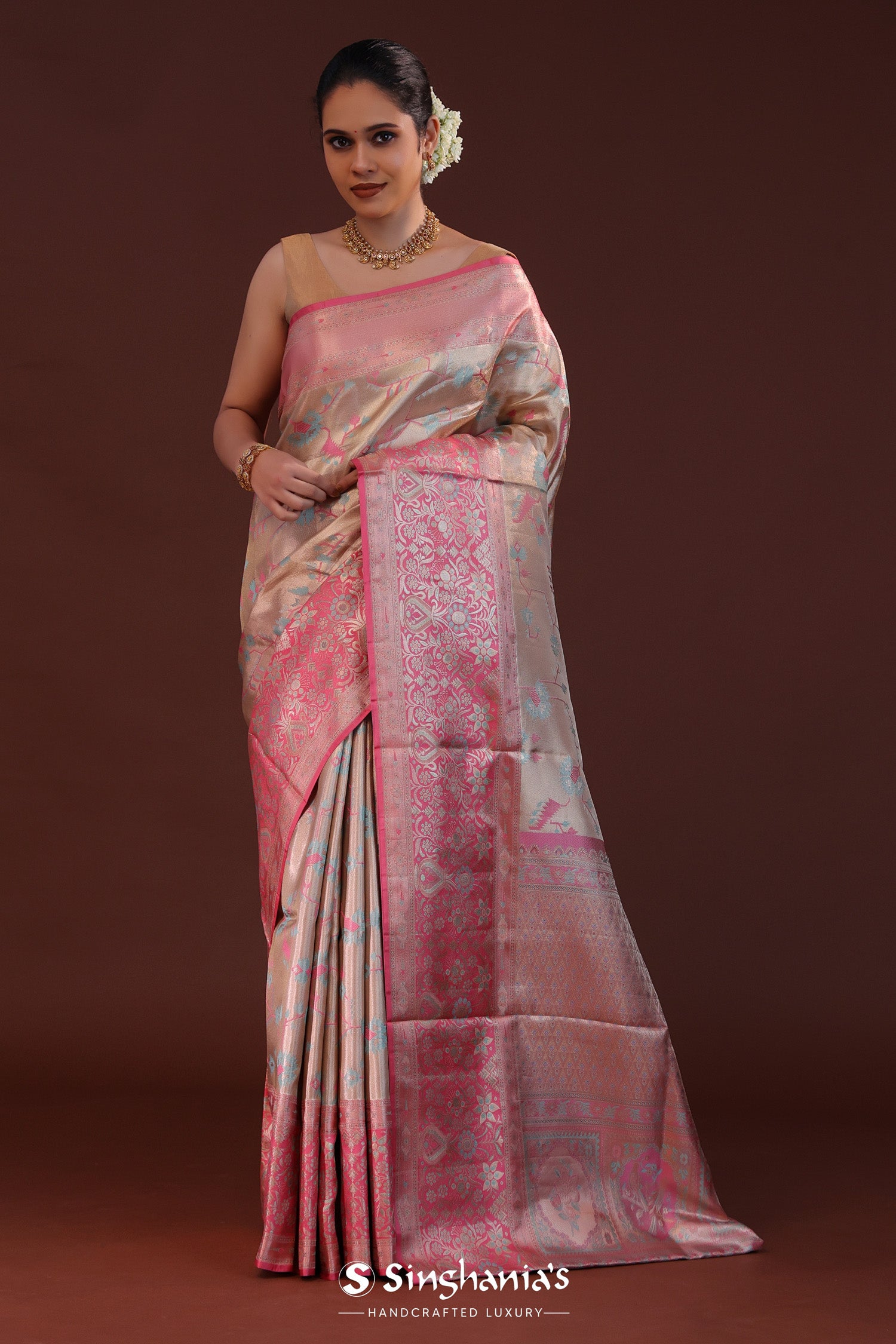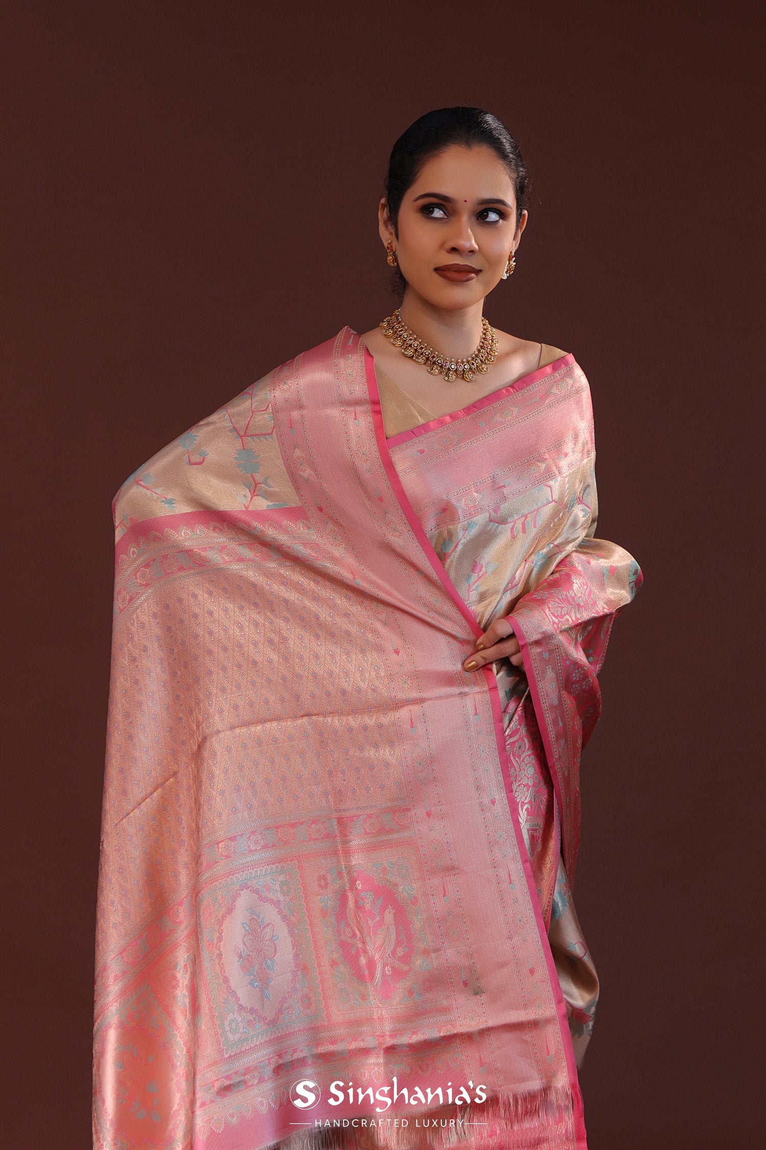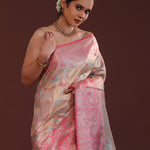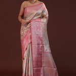 The unique abstract woven design on the body of the Gray kanjivaram tissue saree complemented with contrast pink border adorned with floral woven design with silver zari and contrast unstitched blouse