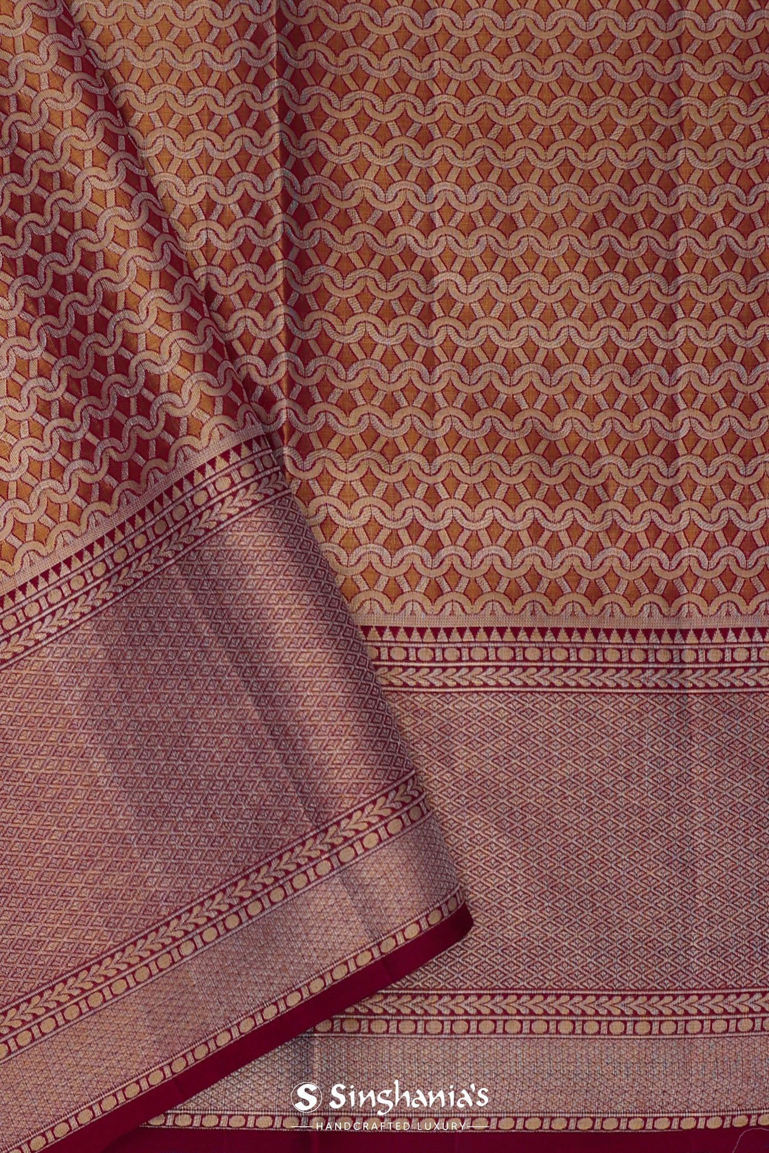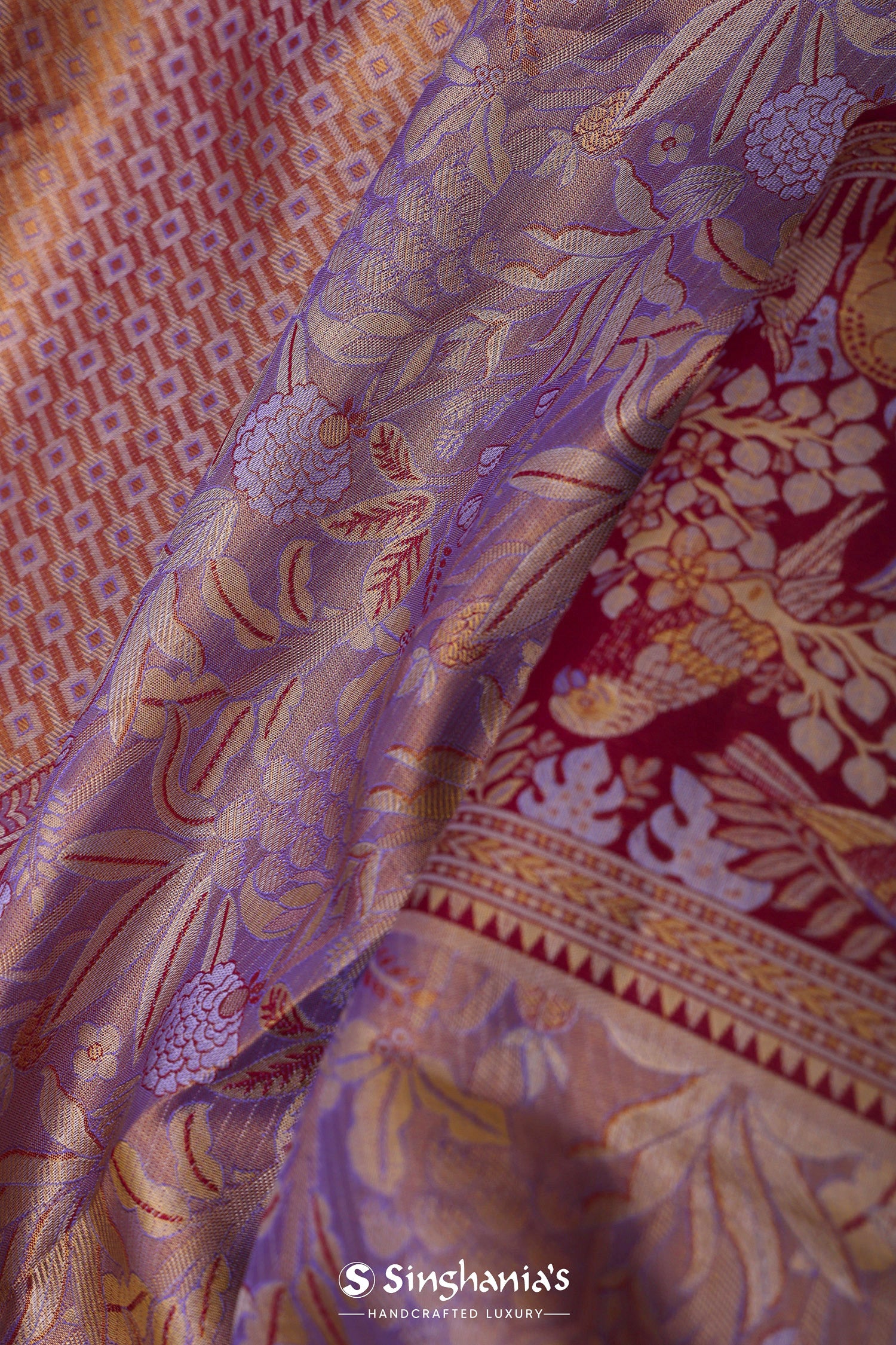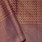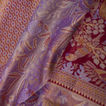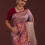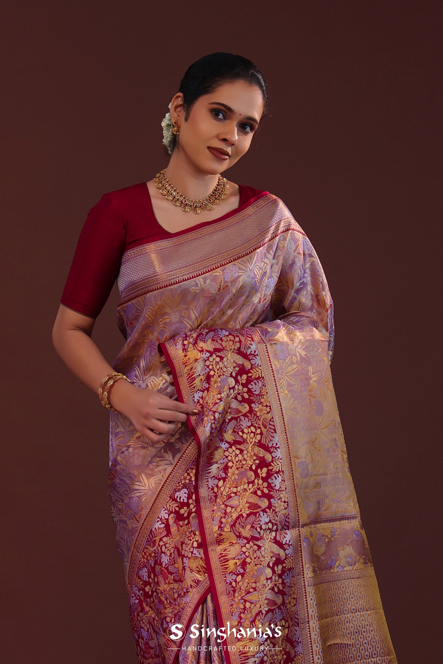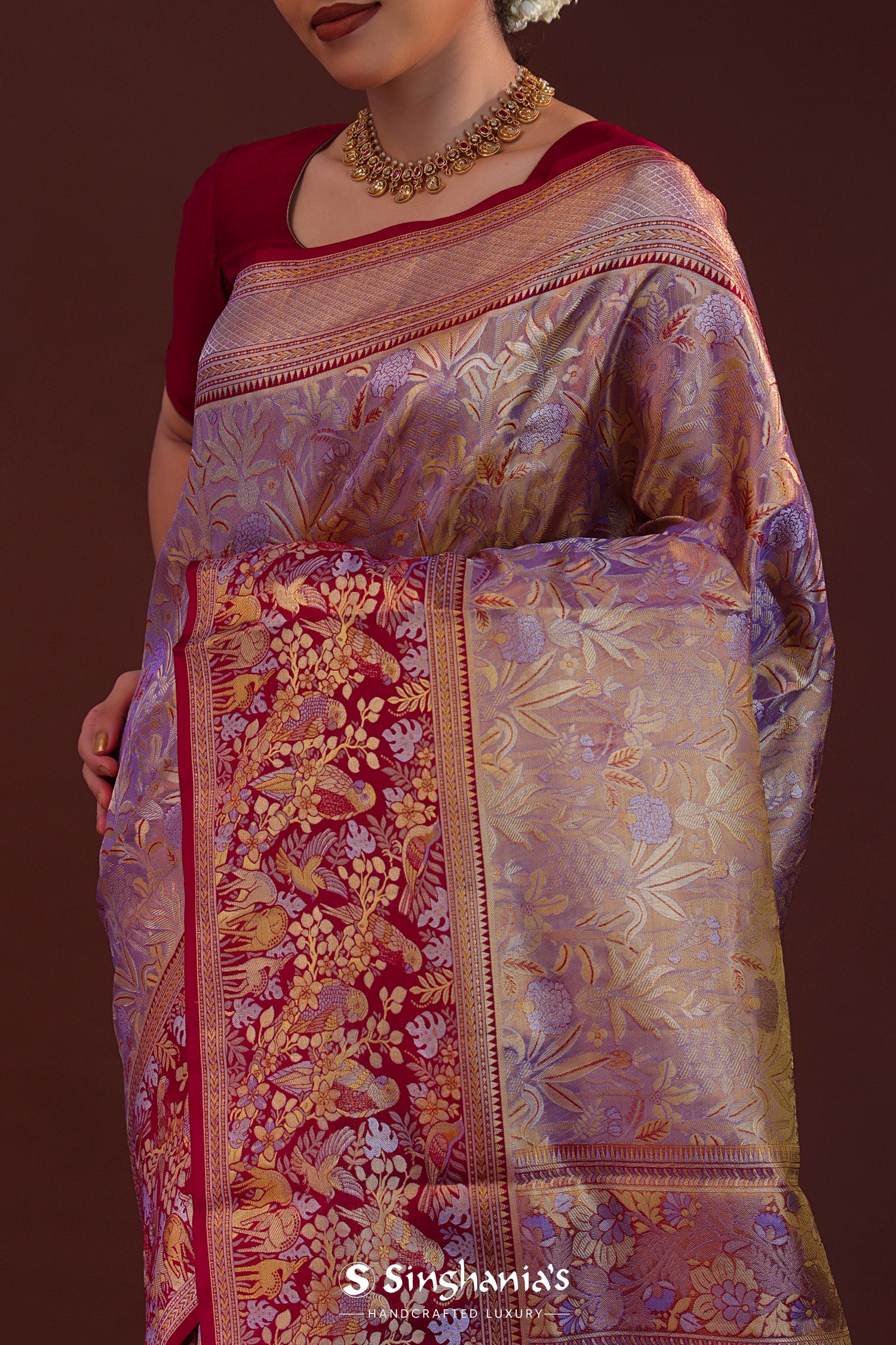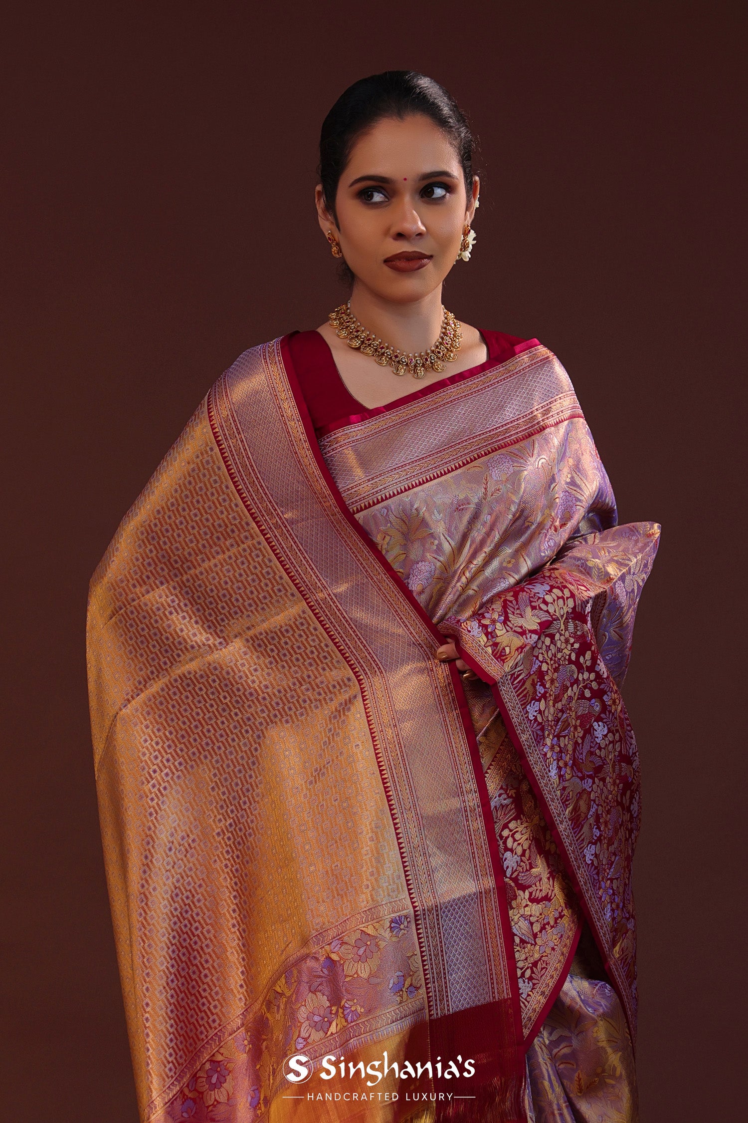The floral and leaf woven design spread all across the body of the Lilac kanjivaram tissue saree complemented with contrast maroon border adorned with meenakari design and unstitched blouse