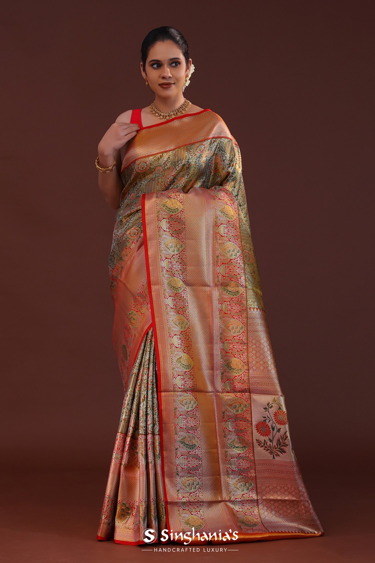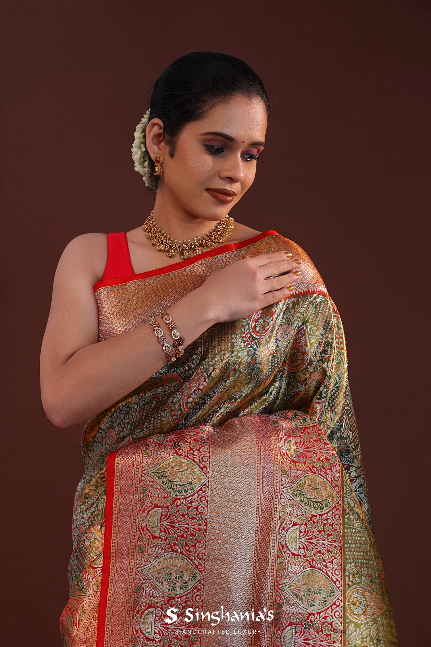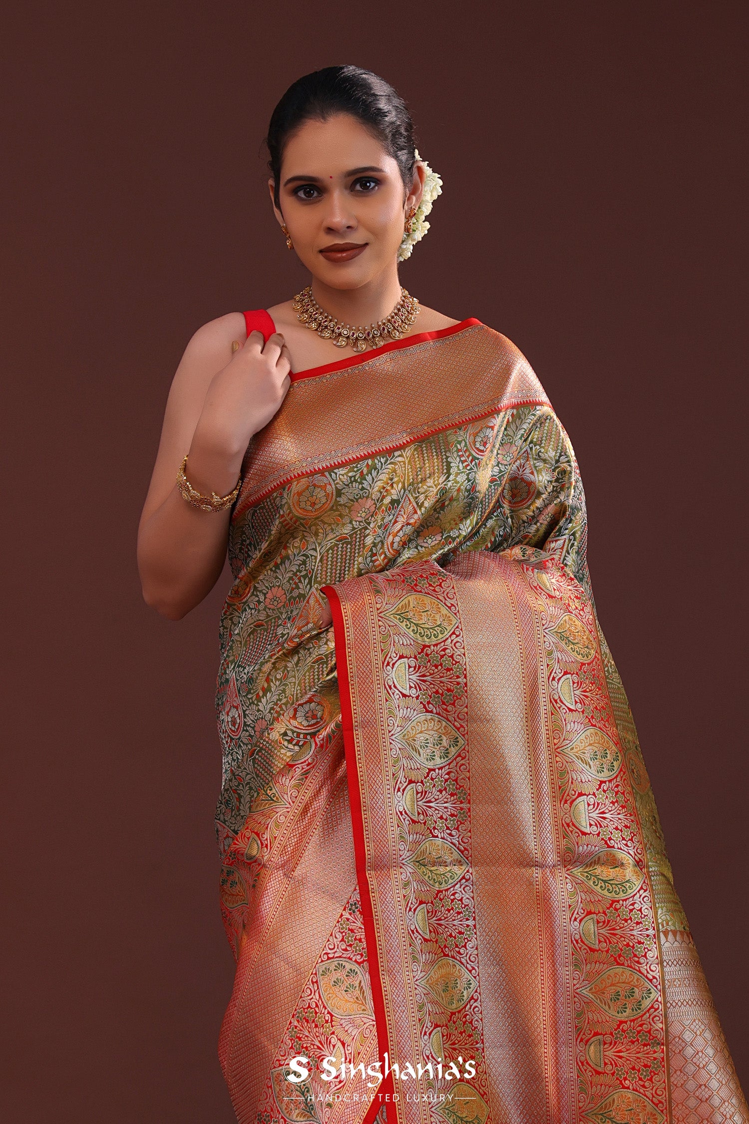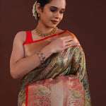 The floral jaal woven with silver zari on Mahendi green kanjivaram tissue saree complemented with red contrast border complemented with red unstitched blouse