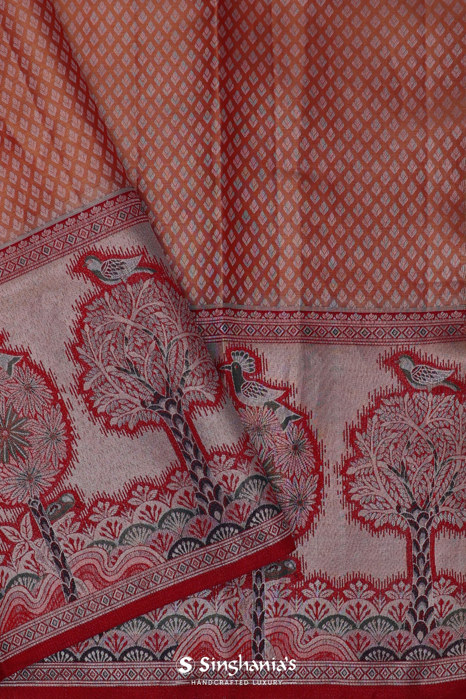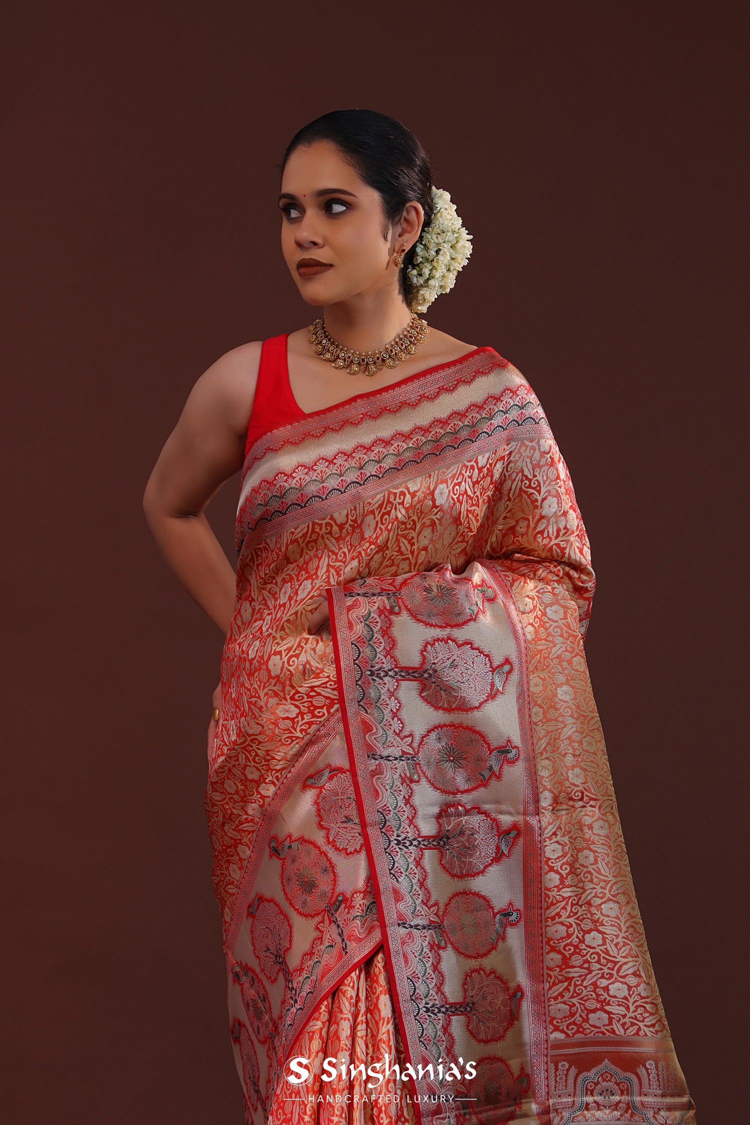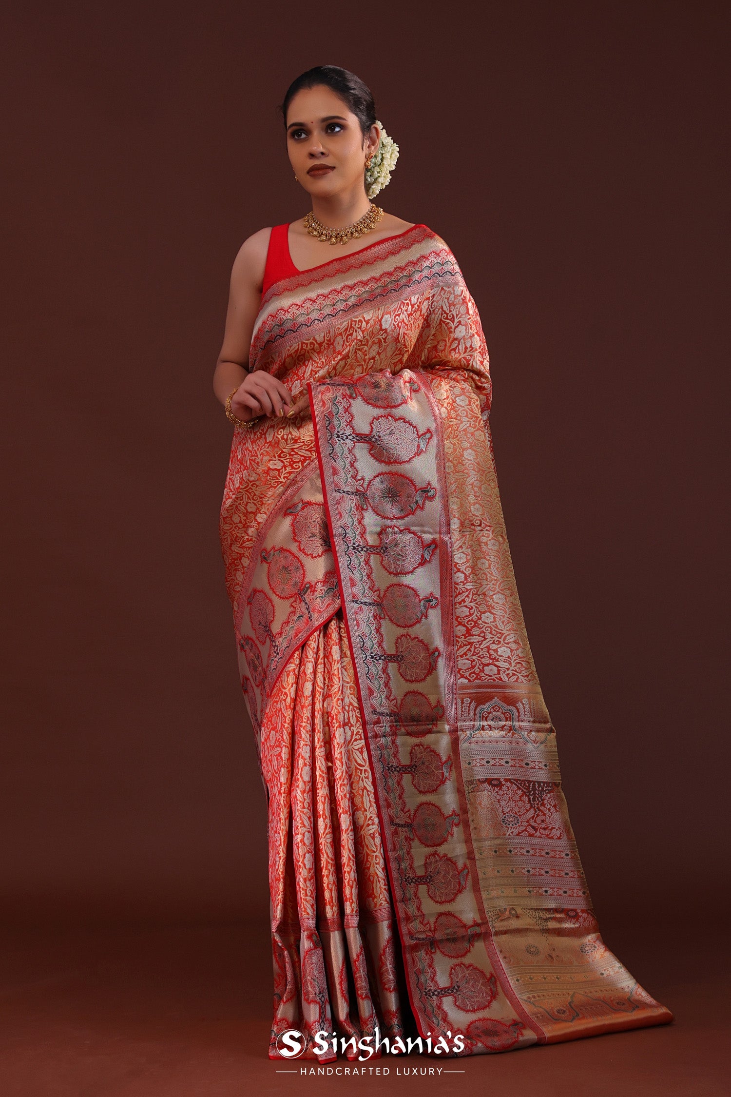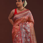 The floral jaal woven with zari spread all across the body of Orange kanjivaram tissue saree complemented with contrast designer border and unstitched blouse