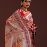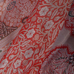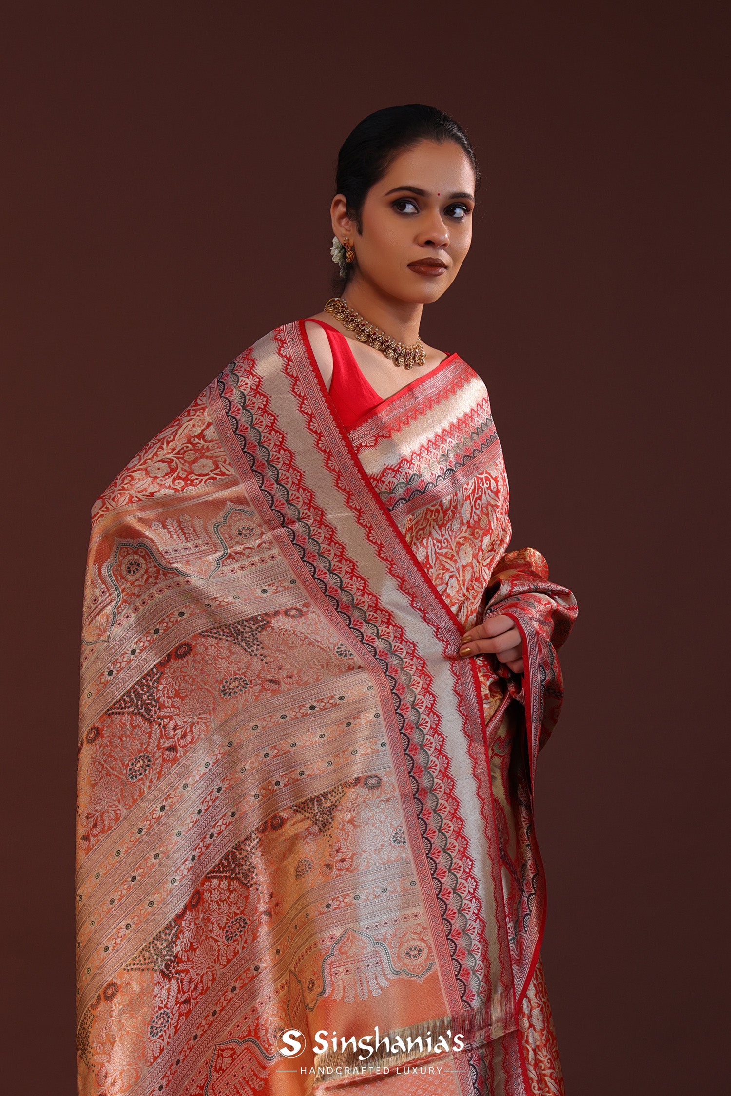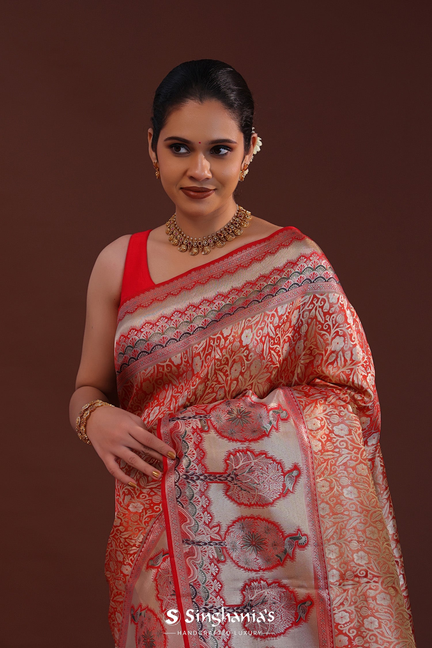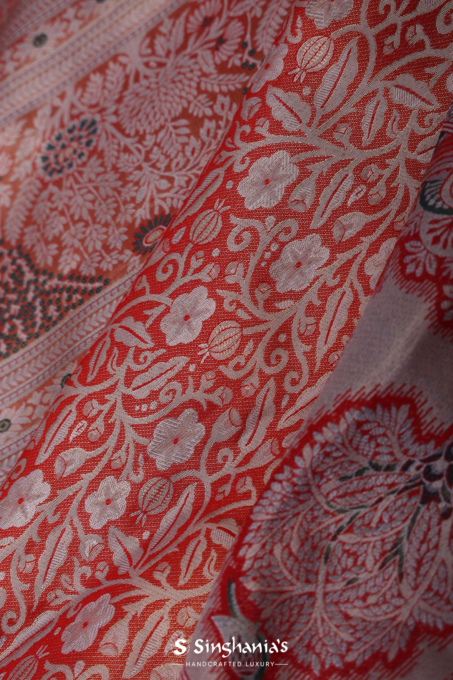 The floral jaal woven with zari spread all across the body of Orange kanjivaram tissue saree complemented with contrast designer border and unstitched blouse