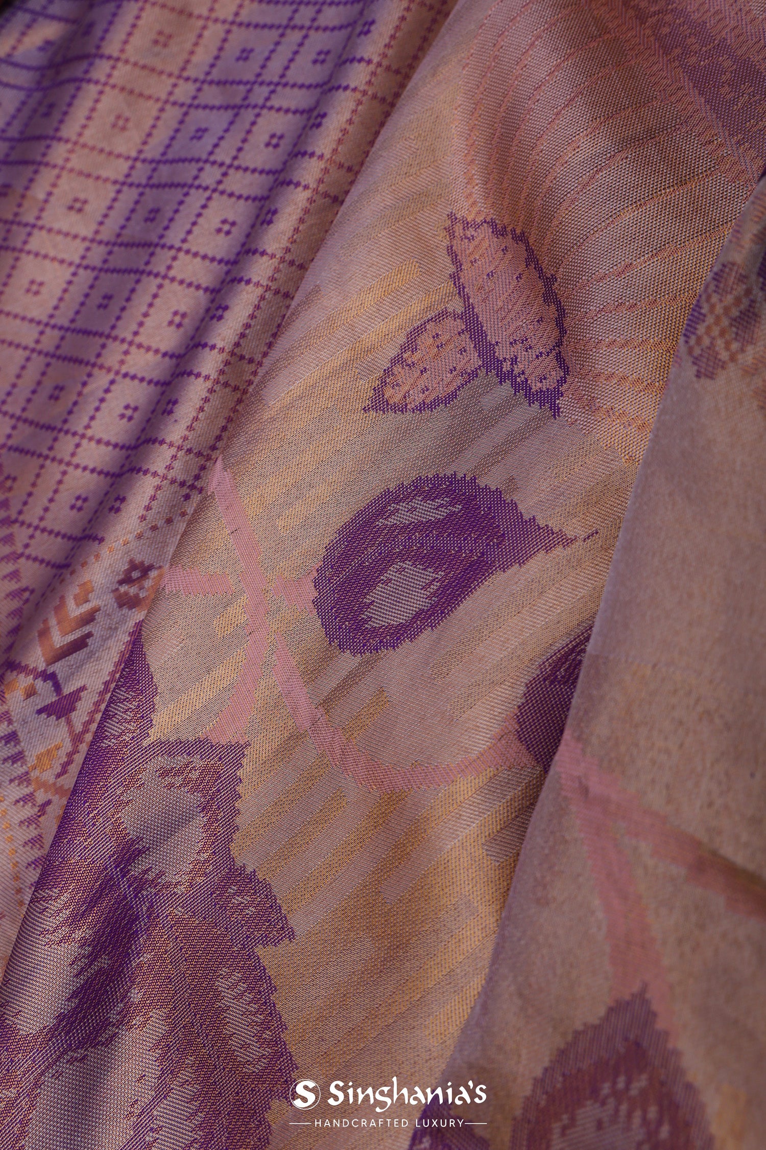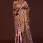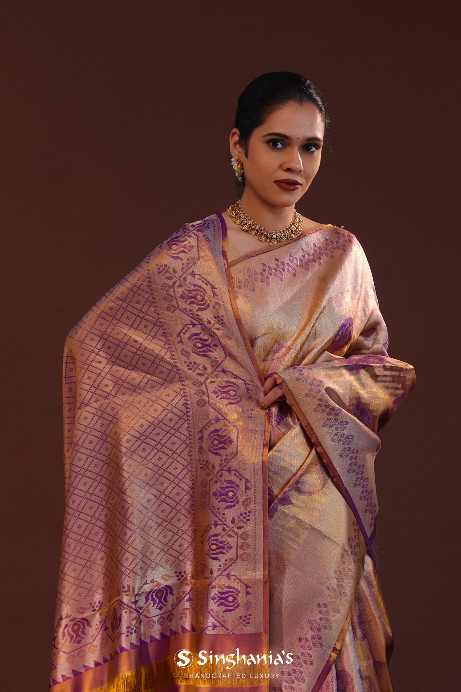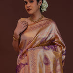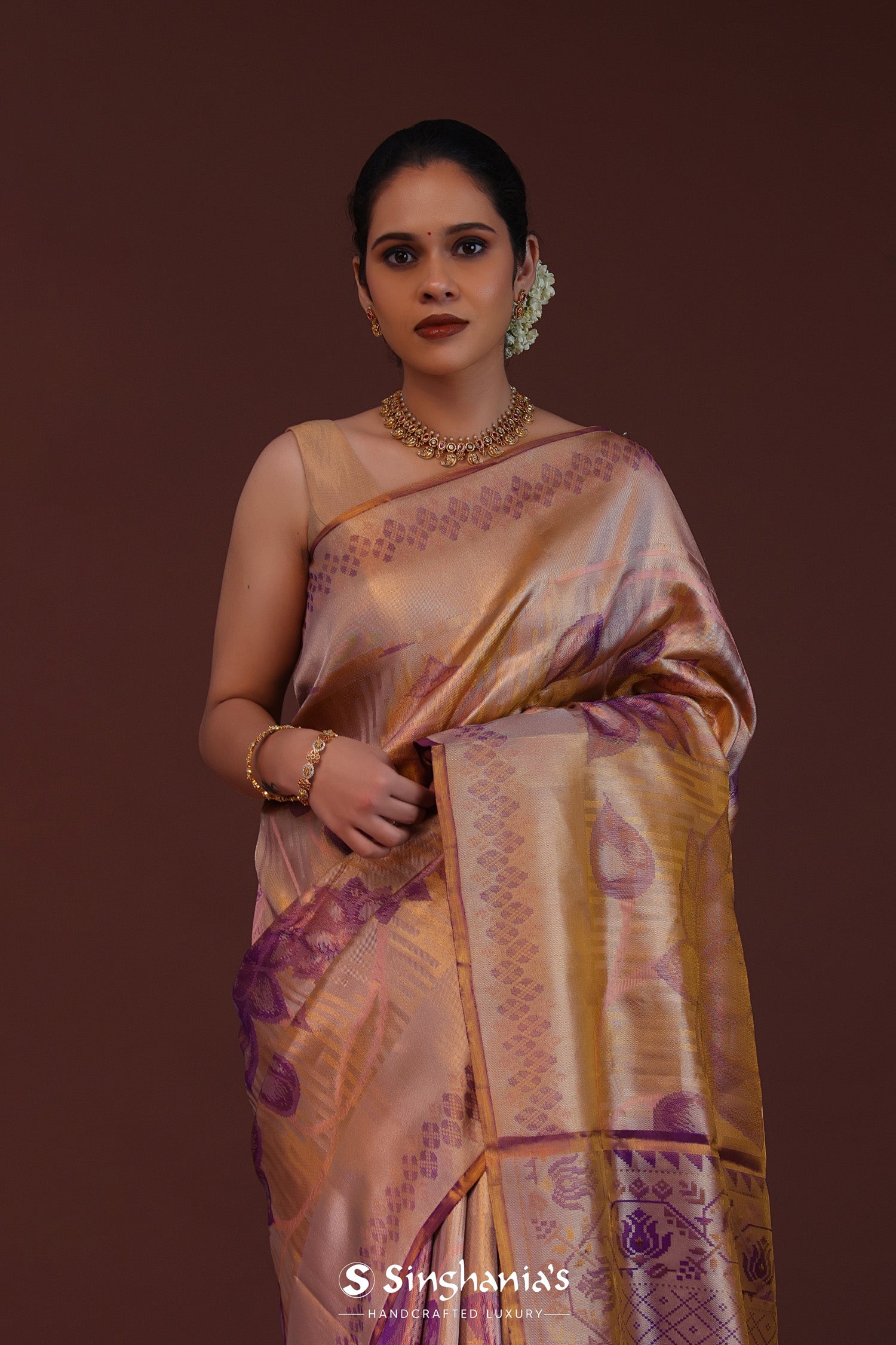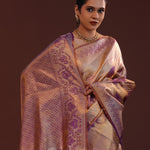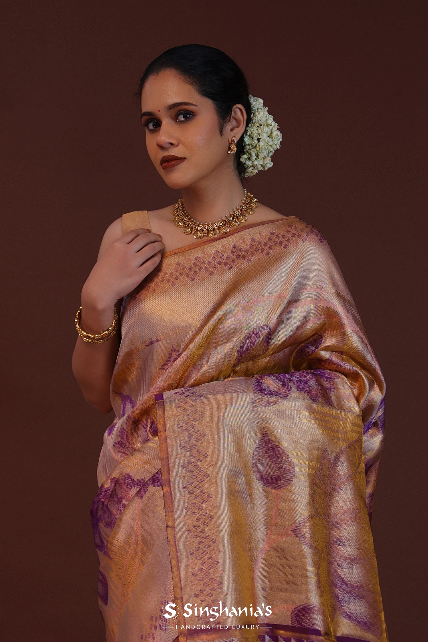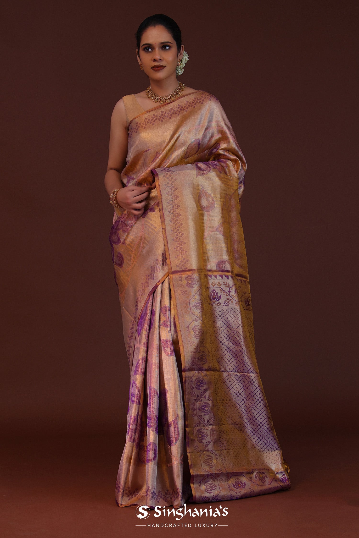 The floral woven design in contrast colors on body of this beautiful Purple kanjivaram tissue designer saree complemented with designer border and unstitched blouse