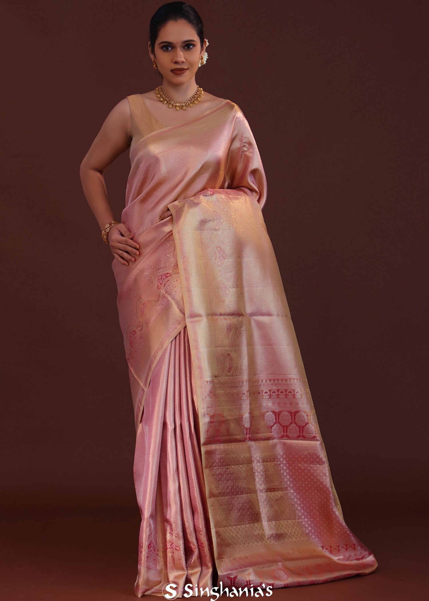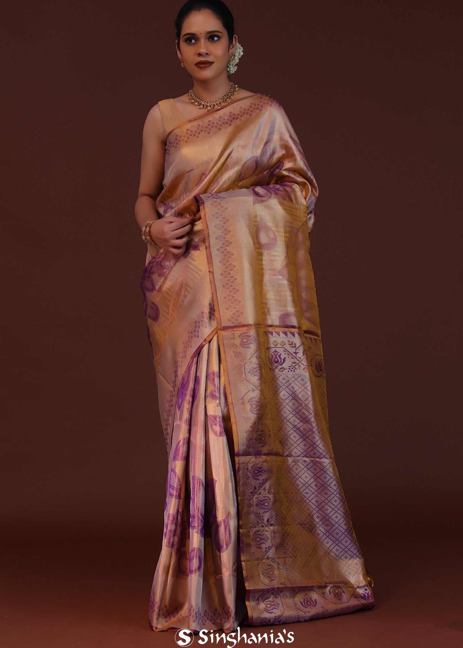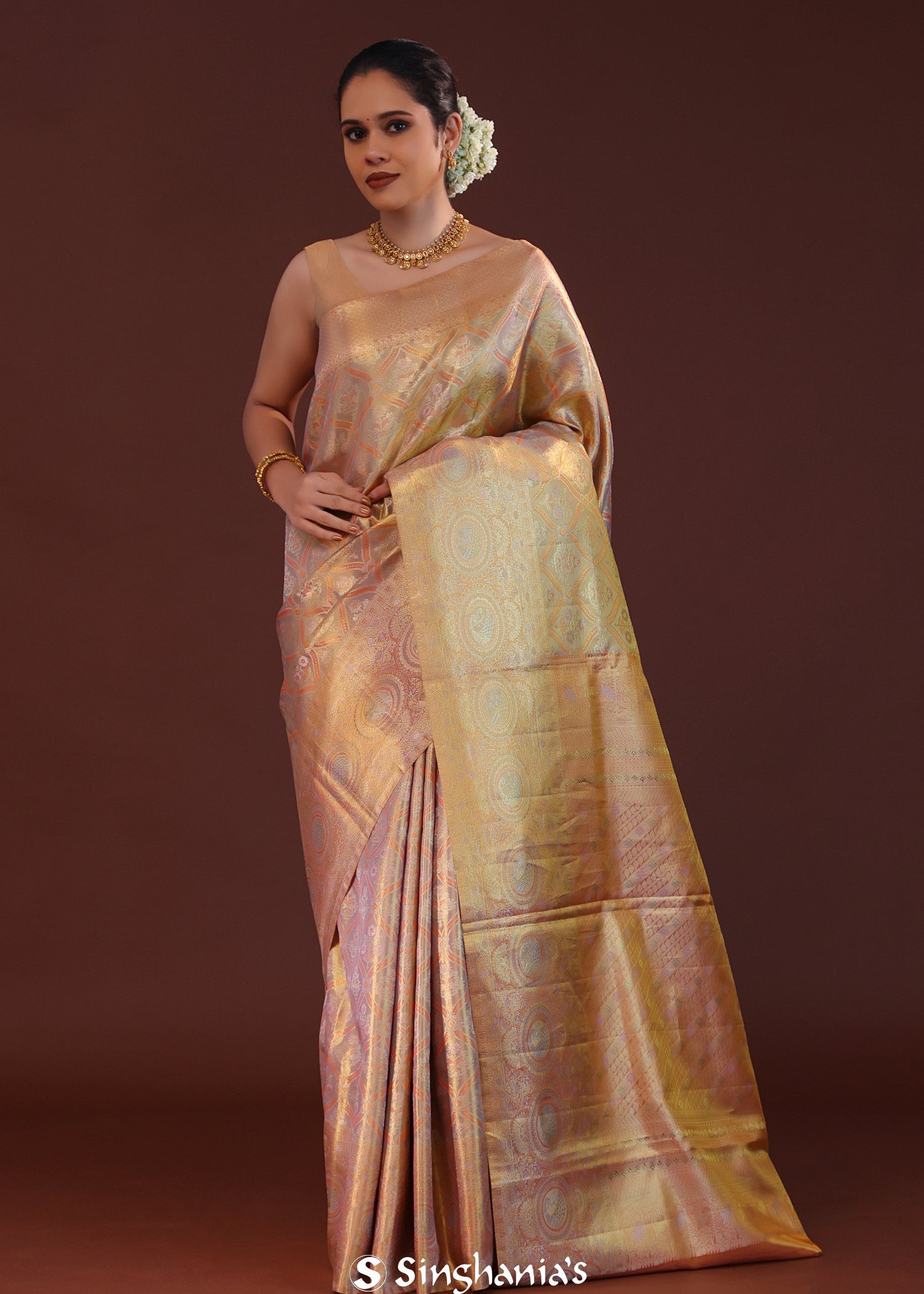 Experience the delicacy and purity of Tissue Kanjivaram Sarees. Woven with love and adorned with a zari border, these sarees encapsulate the emotions and eternal bond between a bride and her mother. A symbol of luxury, Kanjivaram tissue silk sarees offer a truly feminine experience for Indian women. The super fine silk threads used in weaving this fabric create a texture and sheen reminiscent of tissue paper. With its ode to Indian textiles, this exquisite saree is a testament to the believers of luxury.