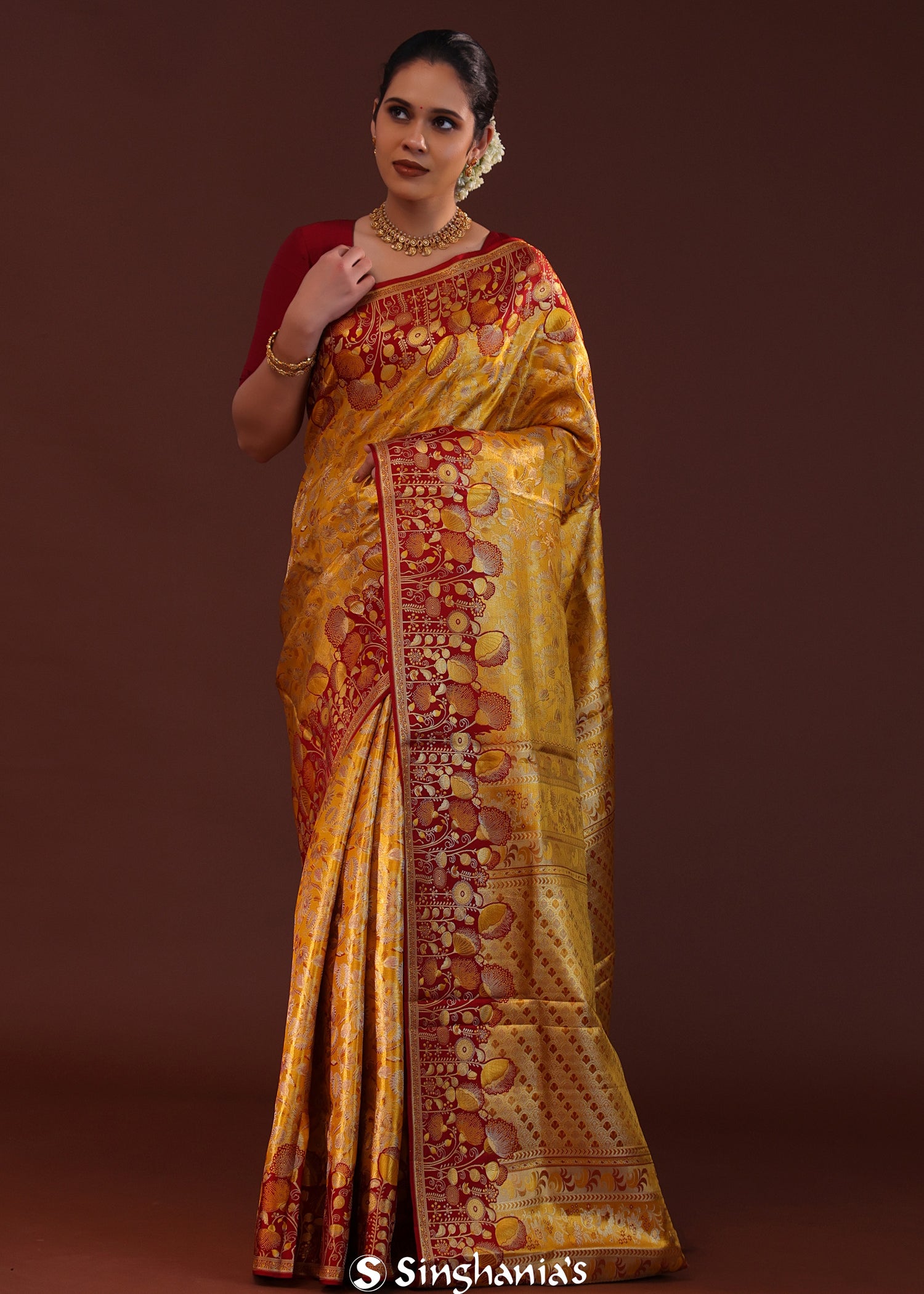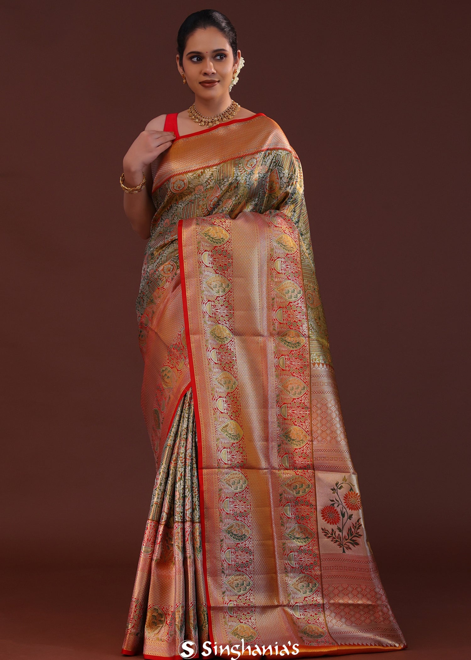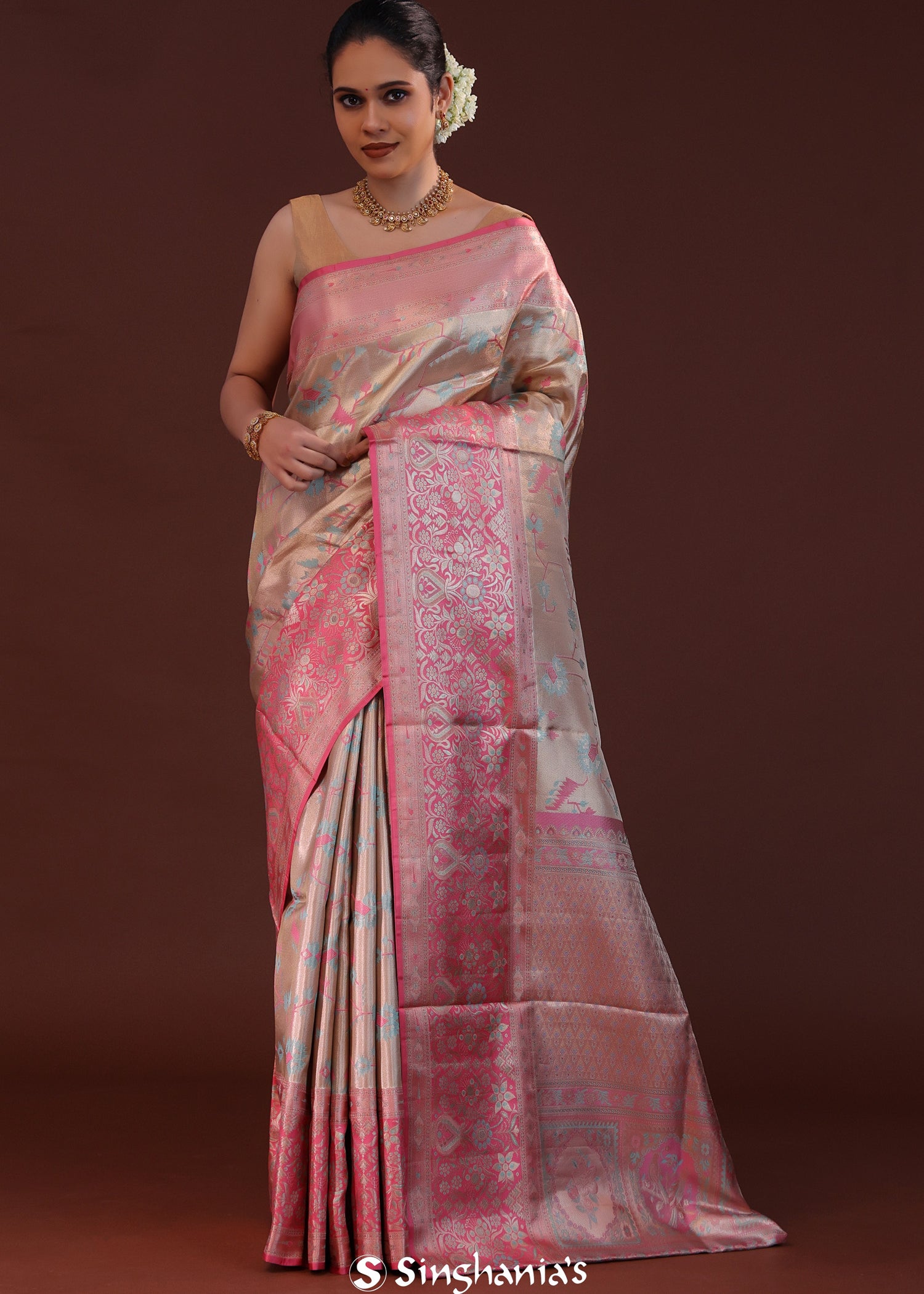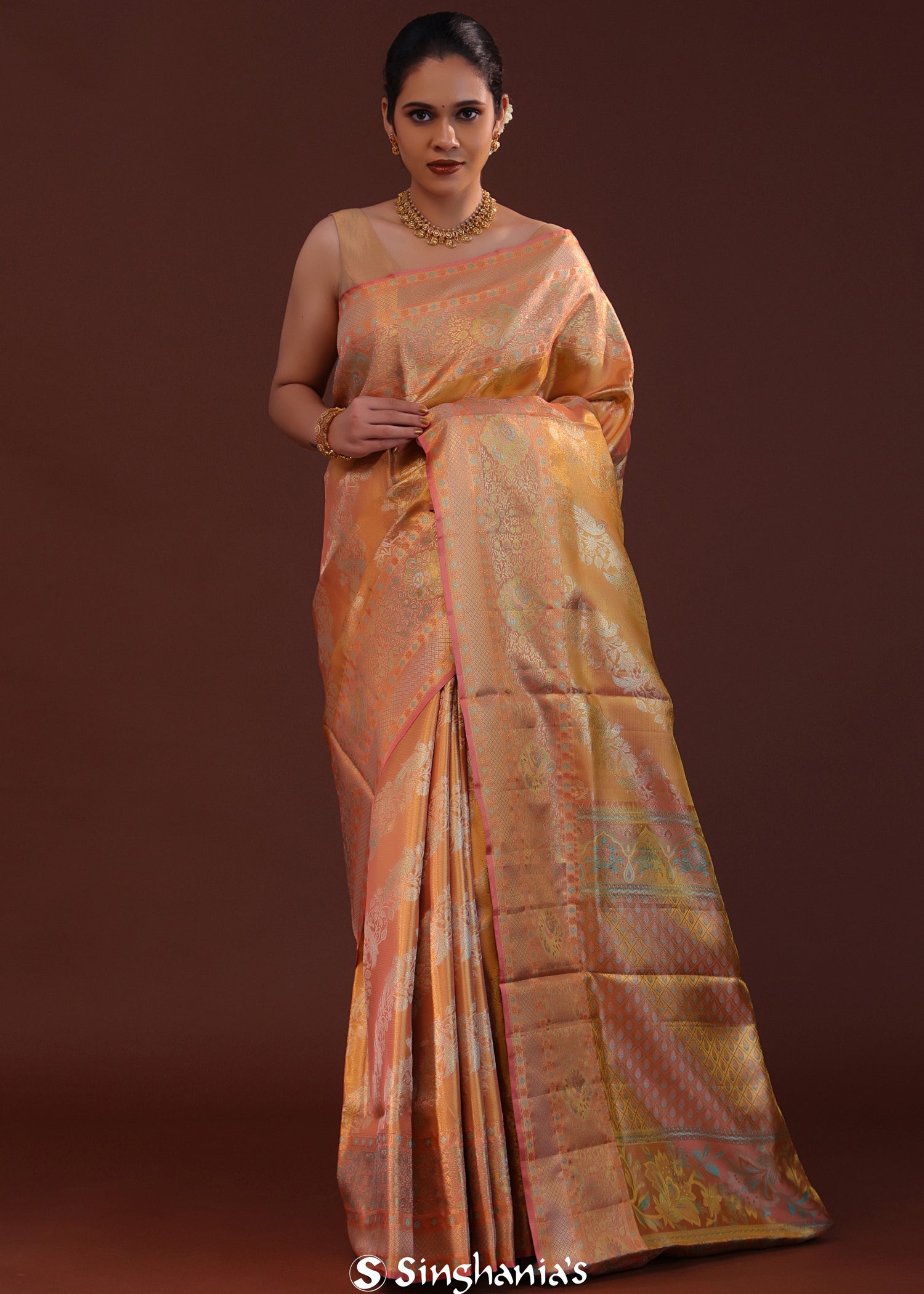 Experience the delicacy and purity of Tissue Kanjivaram Sarees. Woven with love and adorned with a zari border, these sarees encapsulate the emotions and eternal bond between a bride and her mother. A symbol of luxury, Kanjivaram tissue silk sarees offer a truly feminine experience for Indian women. The super fine silk threads used in weaving this fabric create a texture and sheen reminiscent of tissue paper. With its ode to Indian textiles, this exquisite saree is a testament to the believers of luxury.