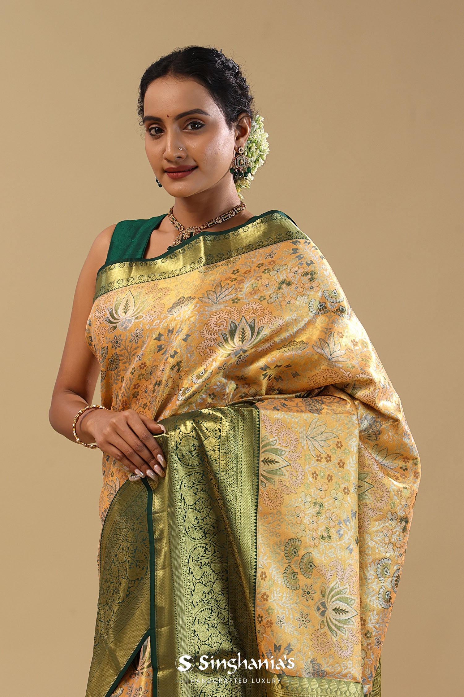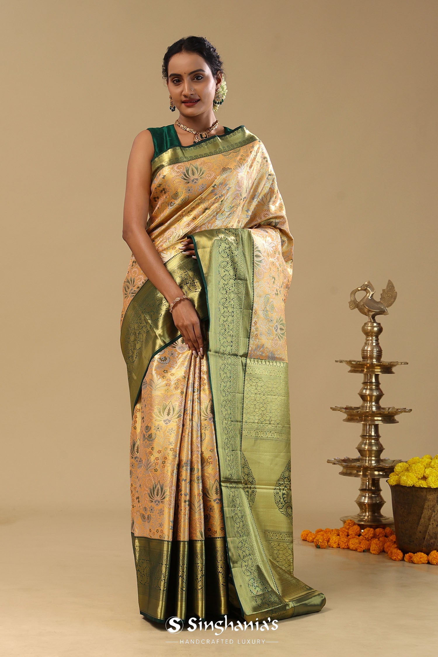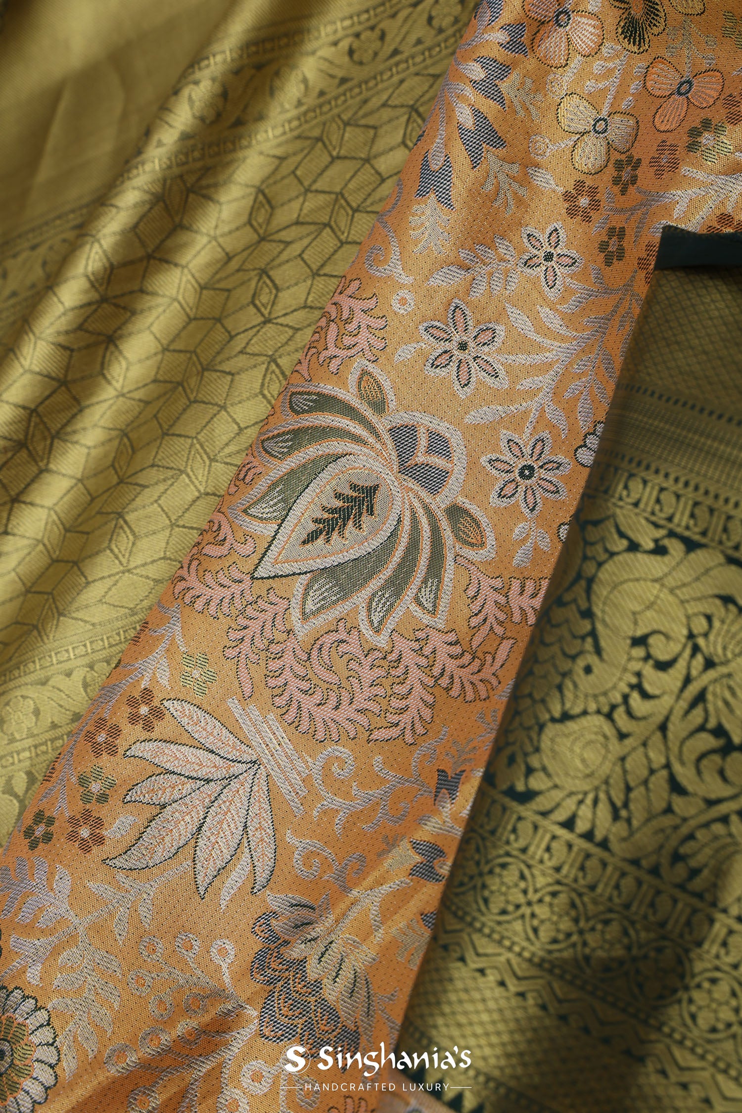 Antique Brass Orange Kanjivaram Tissue Saree With Green Border