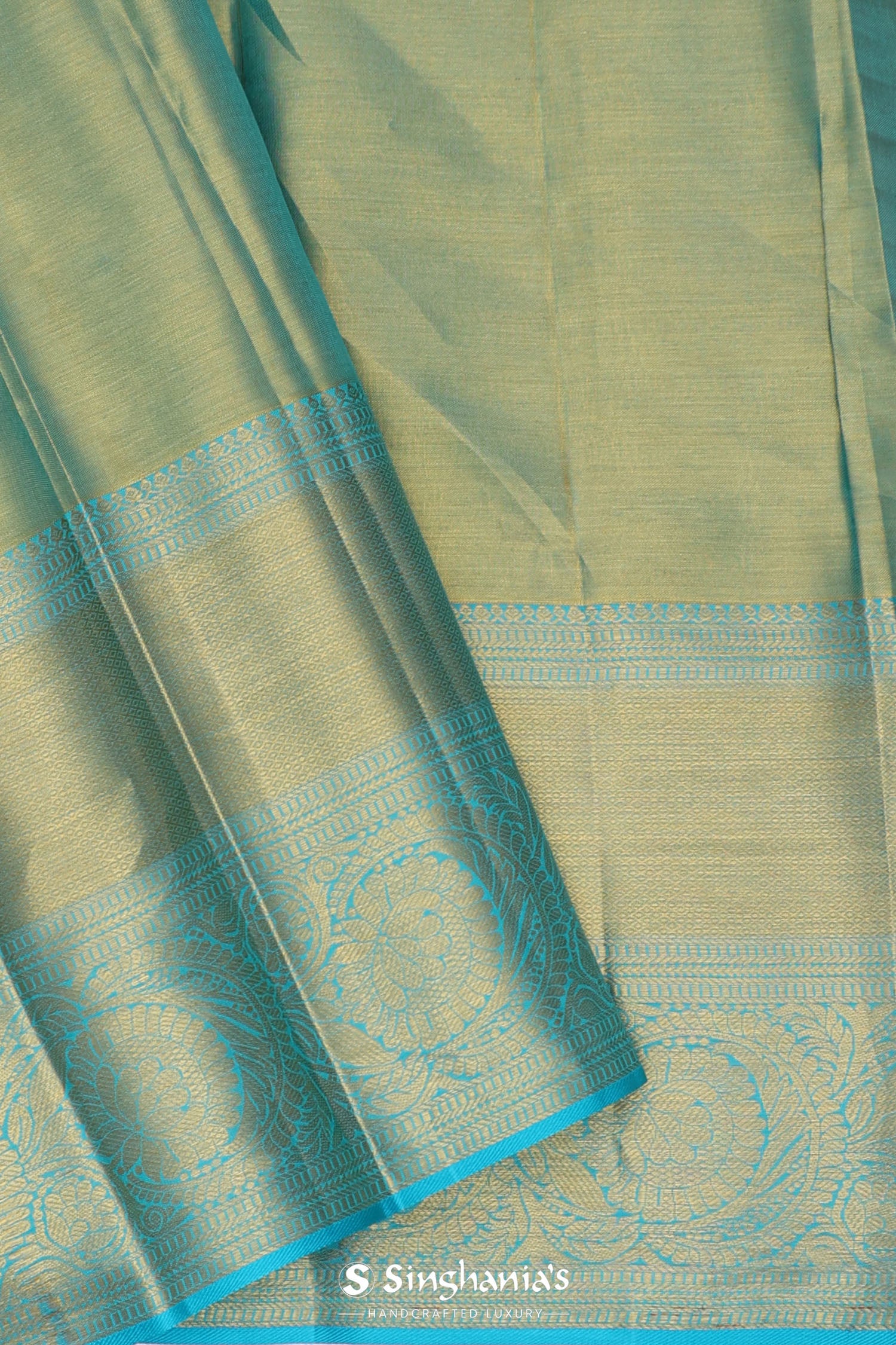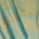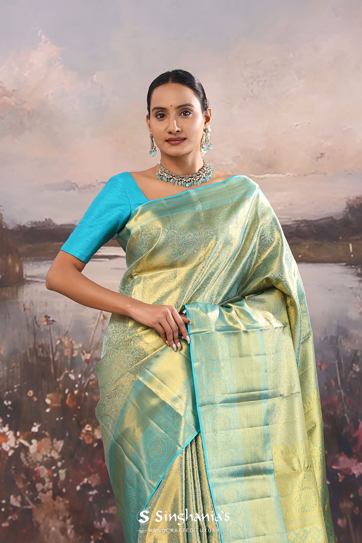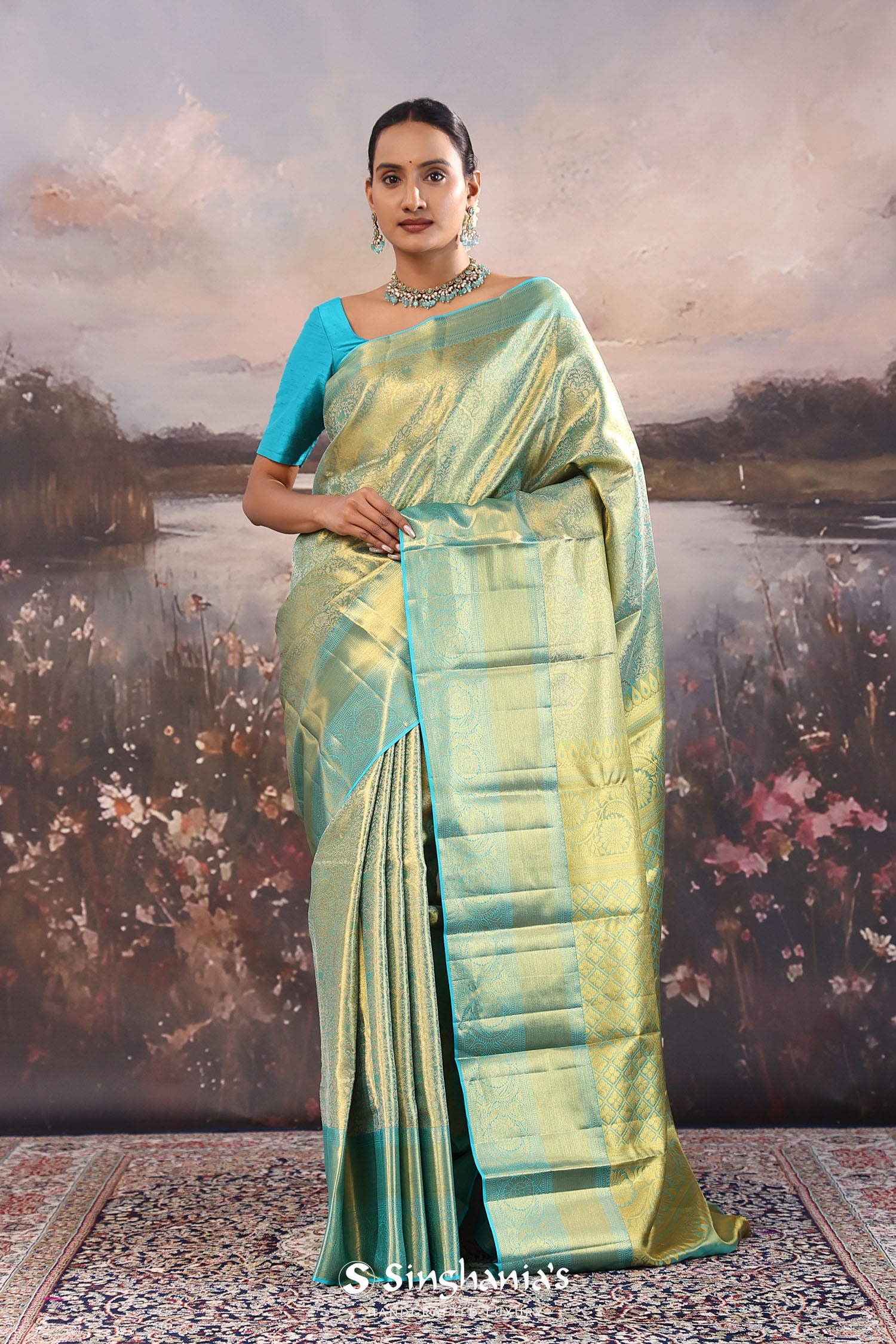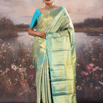 The brocade woven with silver zari on the body of Blue kanjivaram tissue saree complemented with self border ,which would light up every moment when you drape yourself with this .
