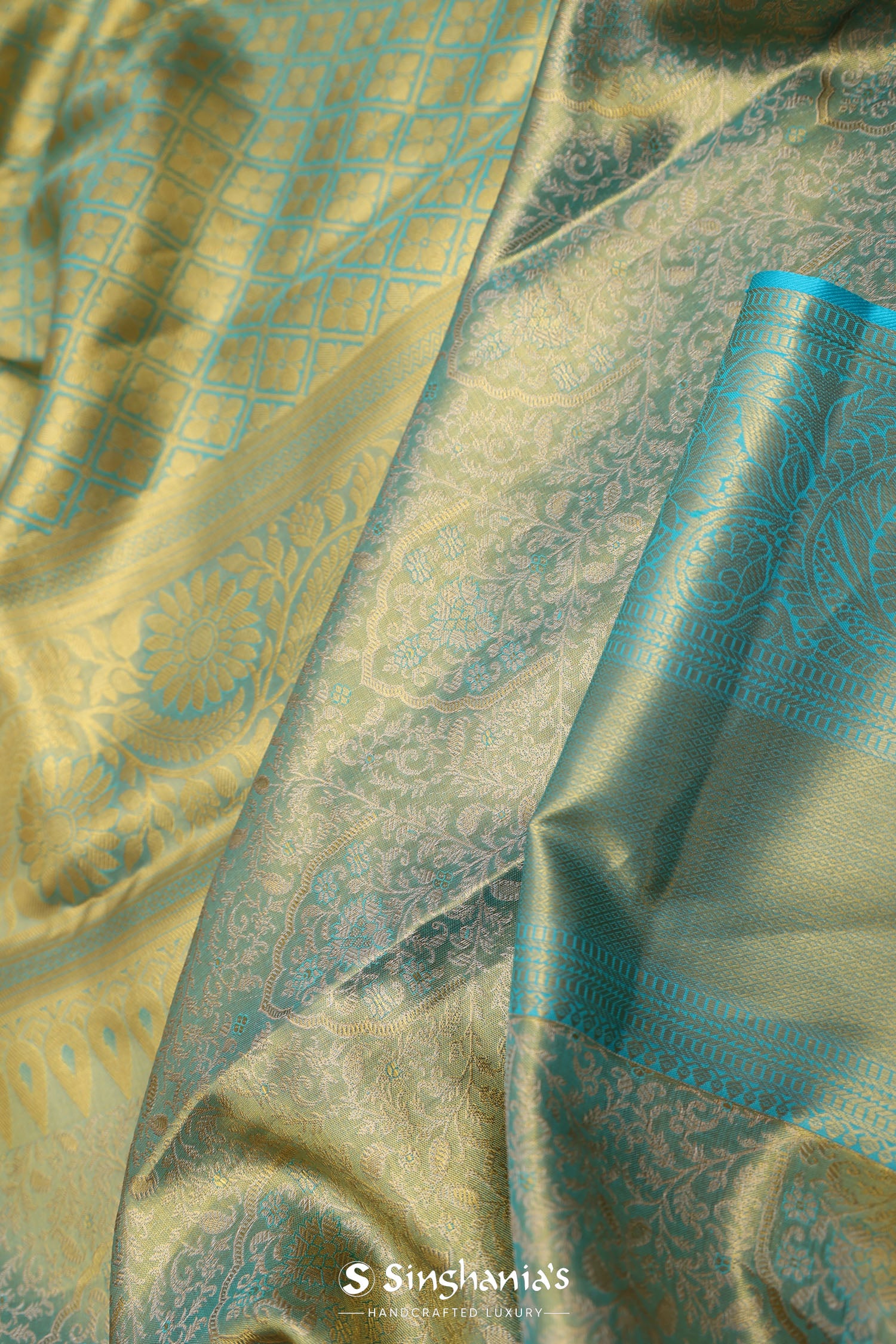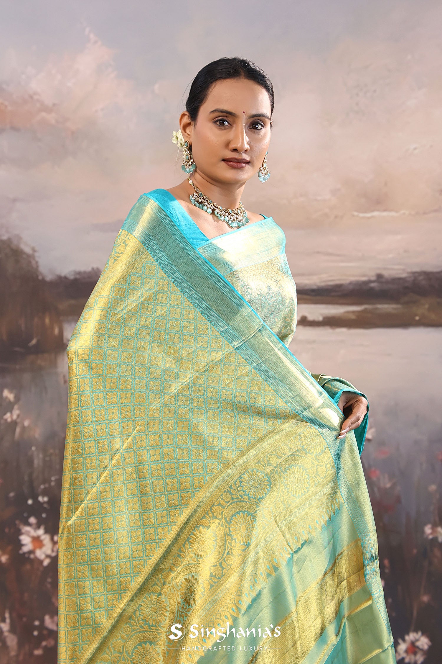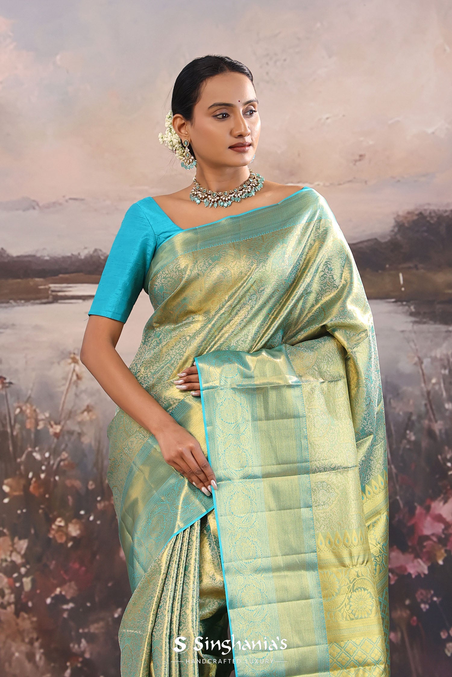 The brocade woven with silver zari on the body of Blue kanjivaram tissue saree complemented with self border ,which would light up every moment when you drape yourself with this .