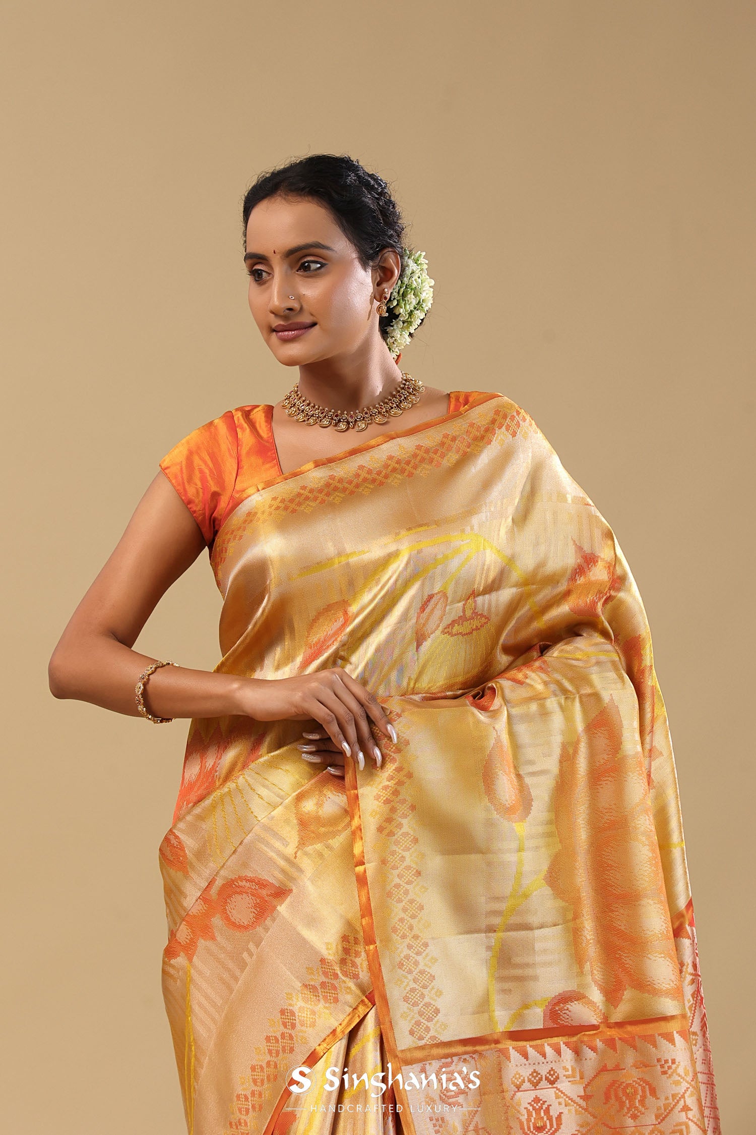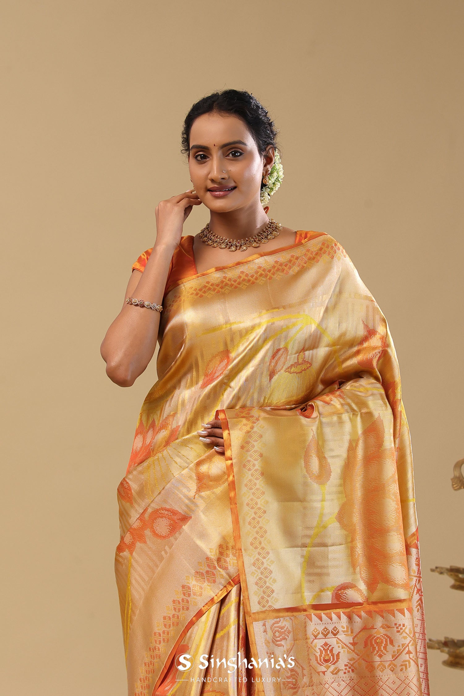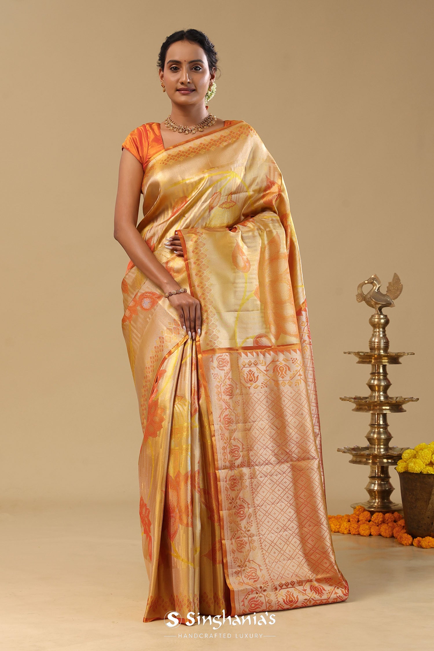 The gold kanjivaram tissue designer saree features floral weave in orange color on entire body along with open border making it ideal choice for traditional and fancy occasions