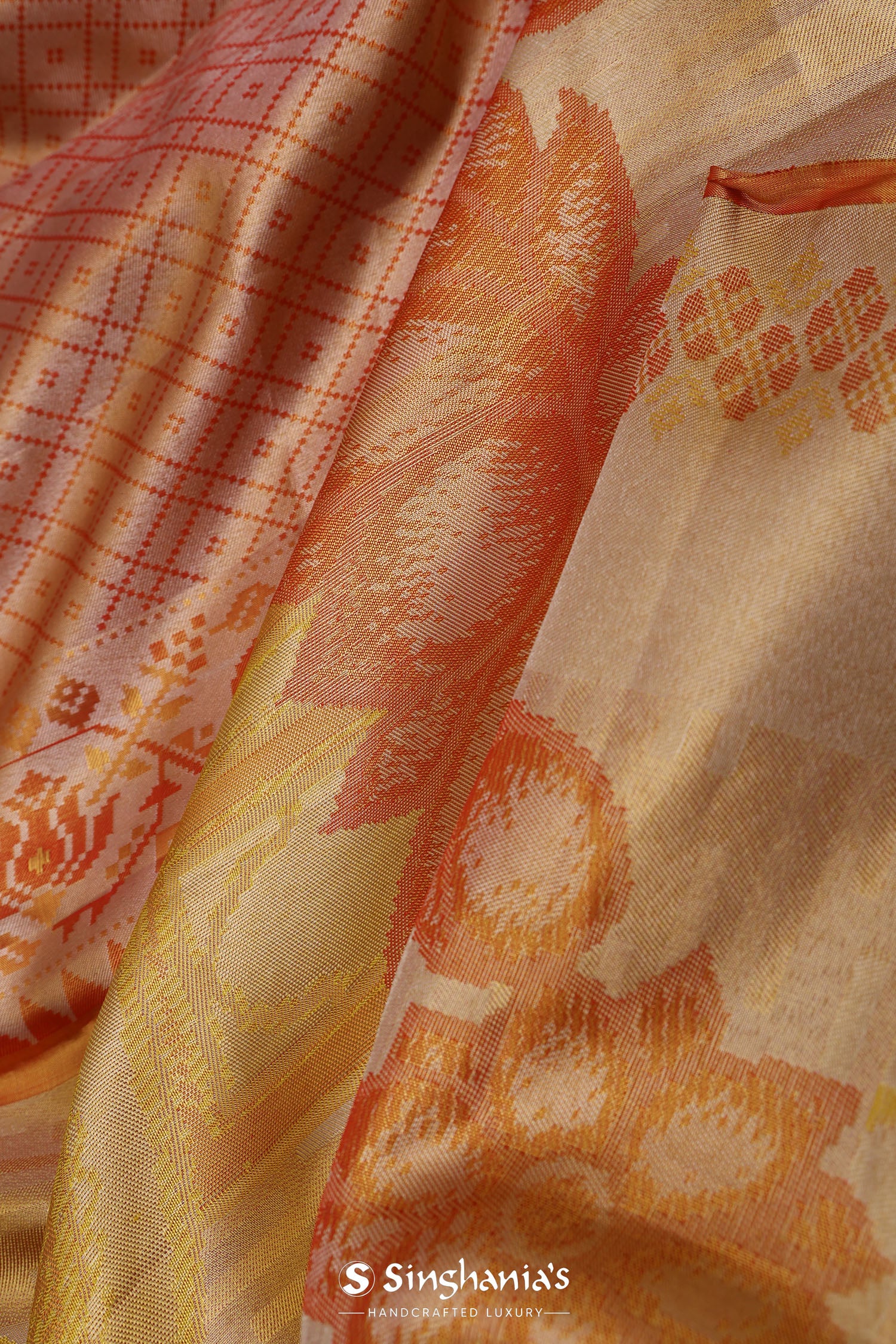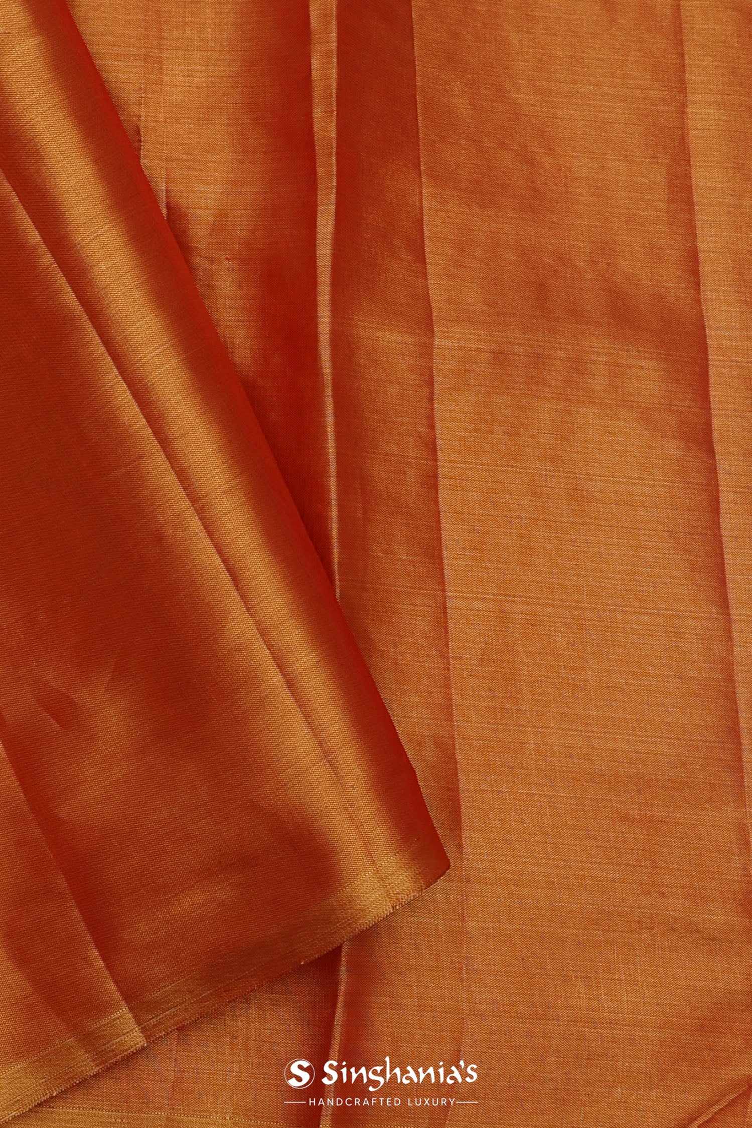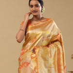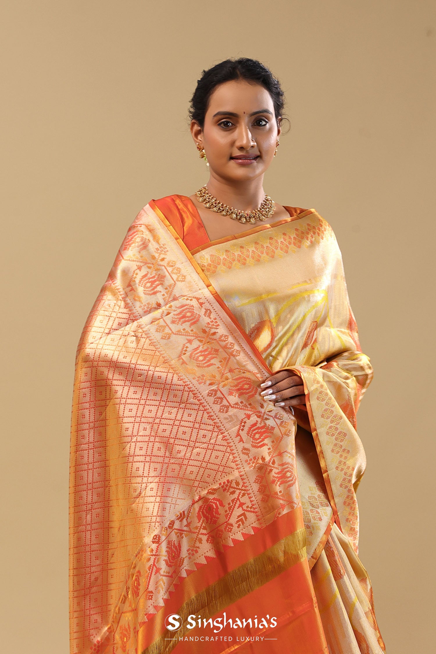 The gold kanjivaram tissue designer saree features floral weave in orange color on entire body along with open border making it ideal choice for traditional and fancy occasions
