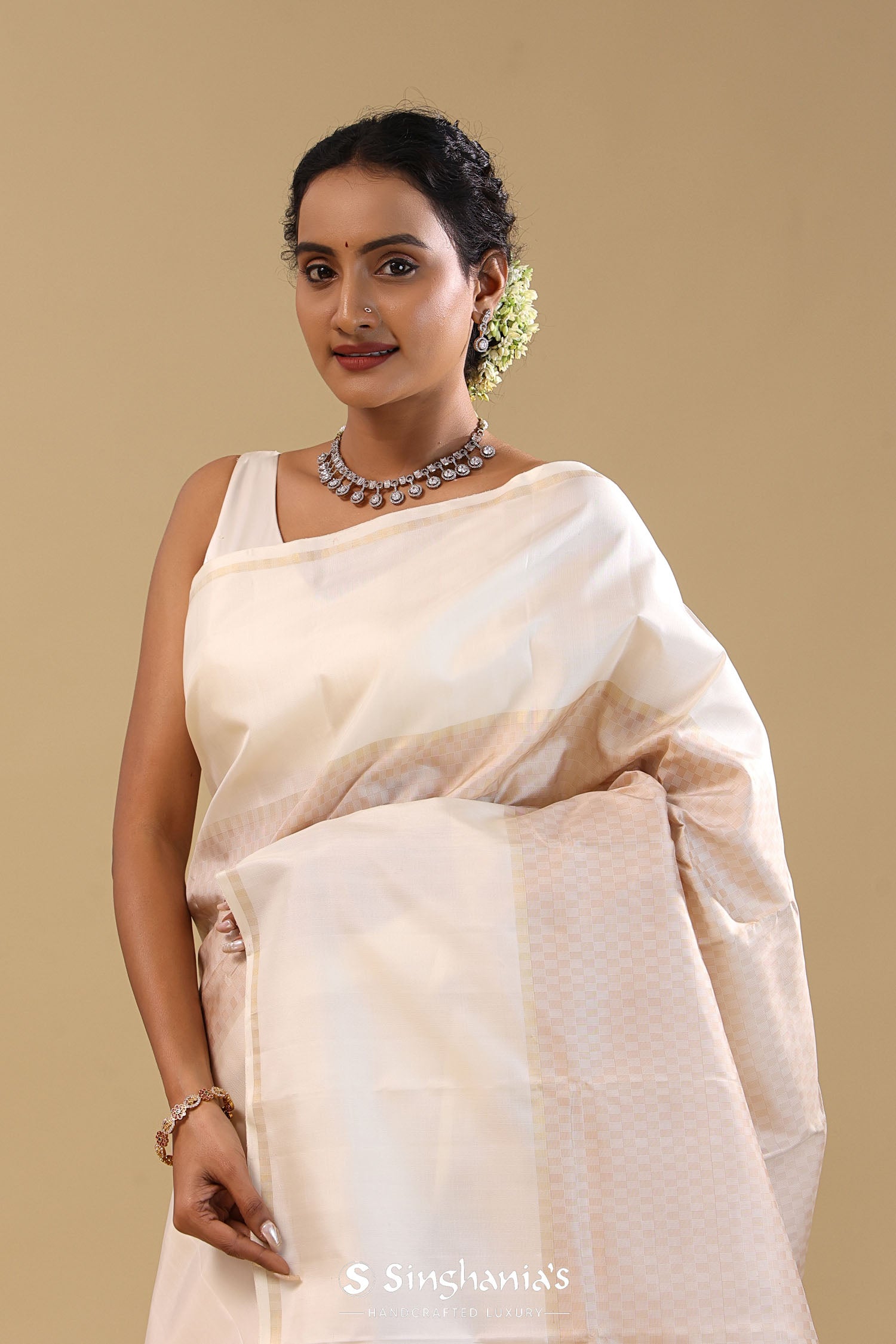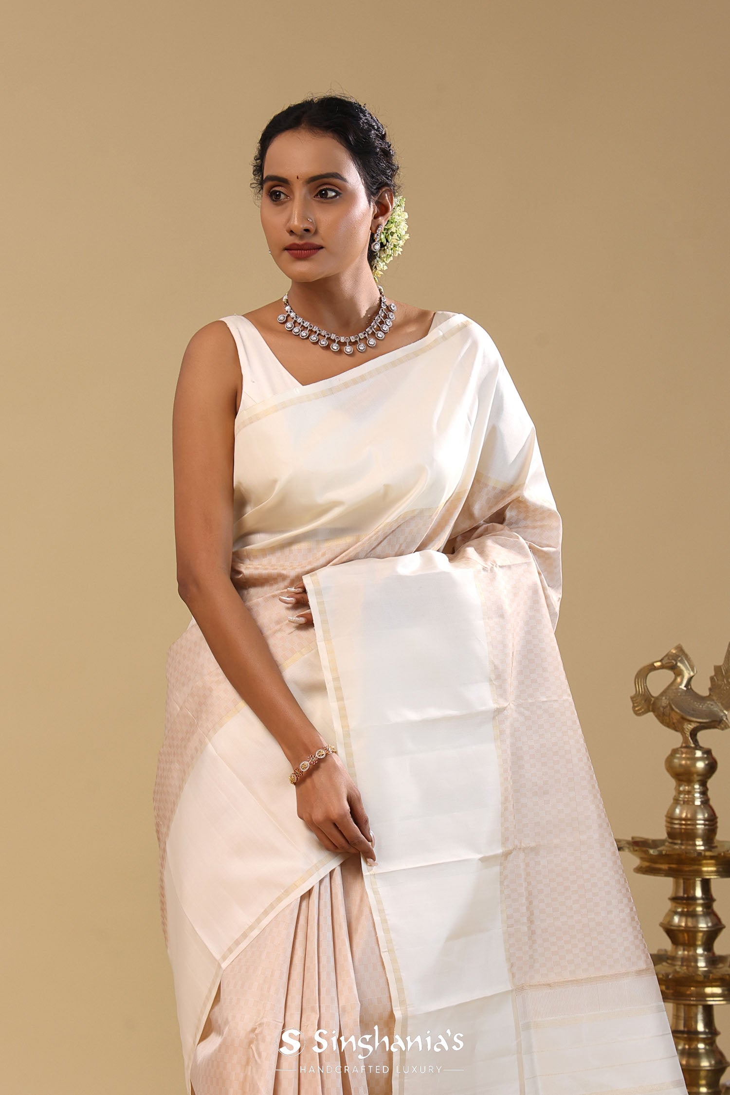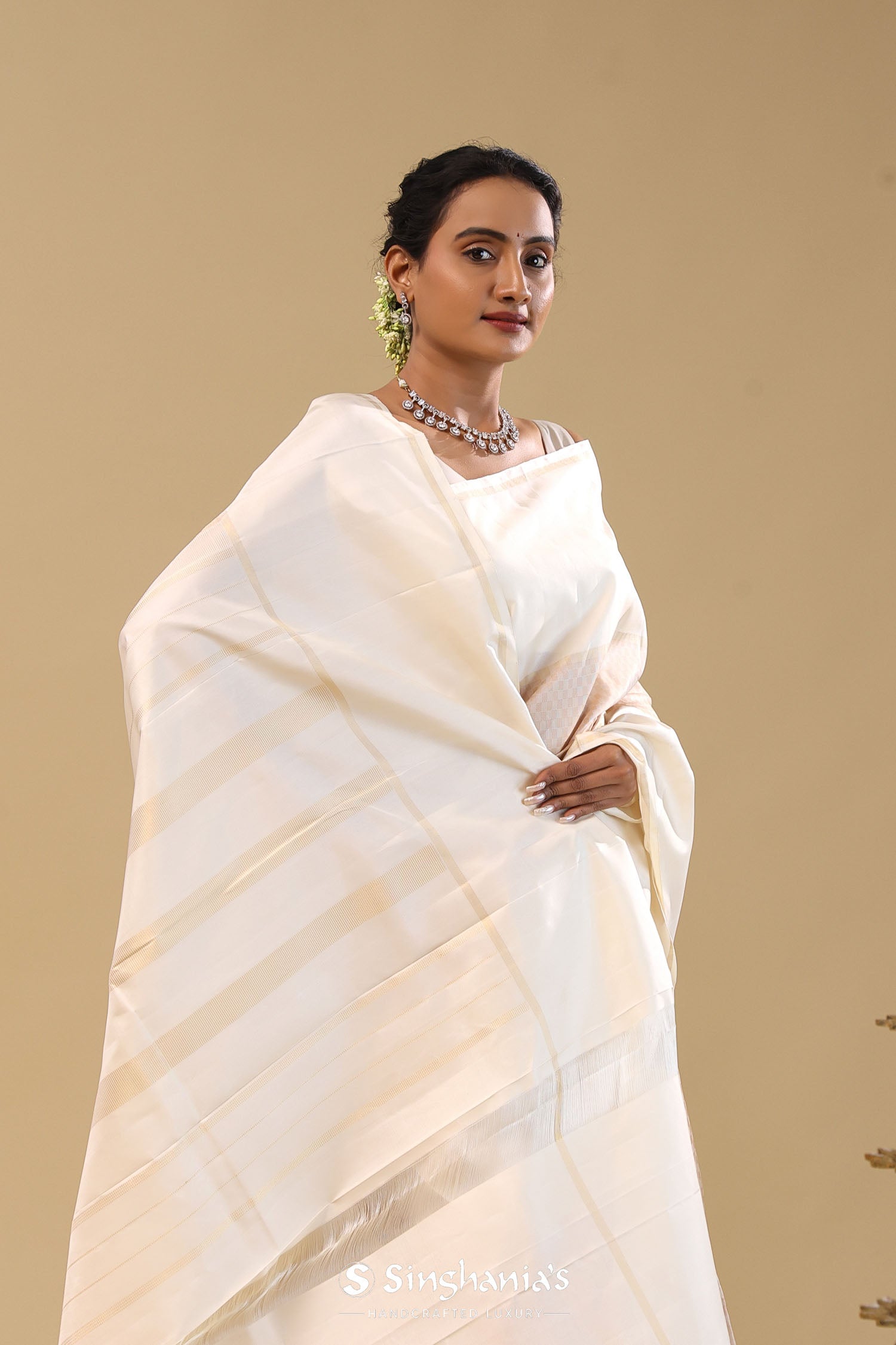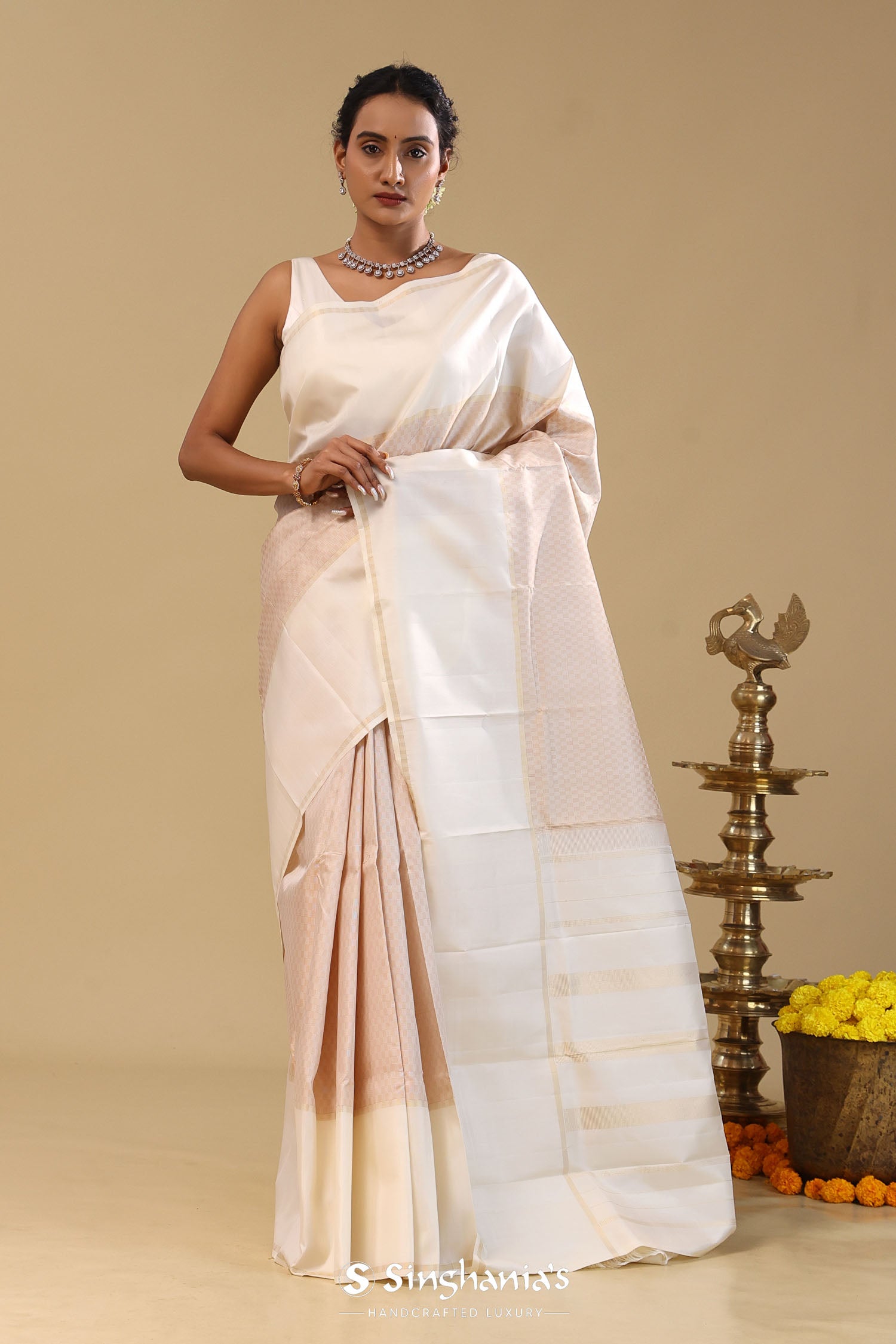 Pair with minimal jewellery and soft makeup to highlight the timeless elegance Singhania’s is known for.