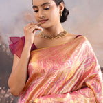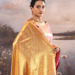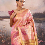 The Pink kanjivaram tissue designer saree features abstract weave in pastel colors on entire body along with open border and golden edge making it ideal choice for traditional and fancy occasions