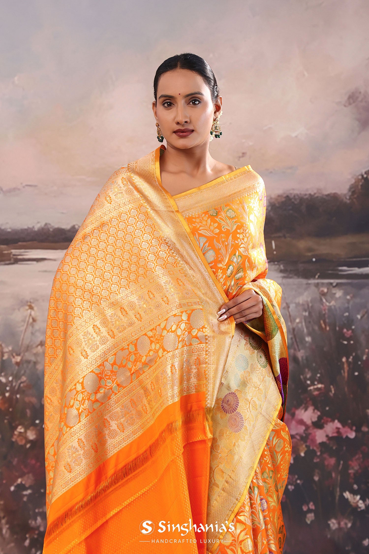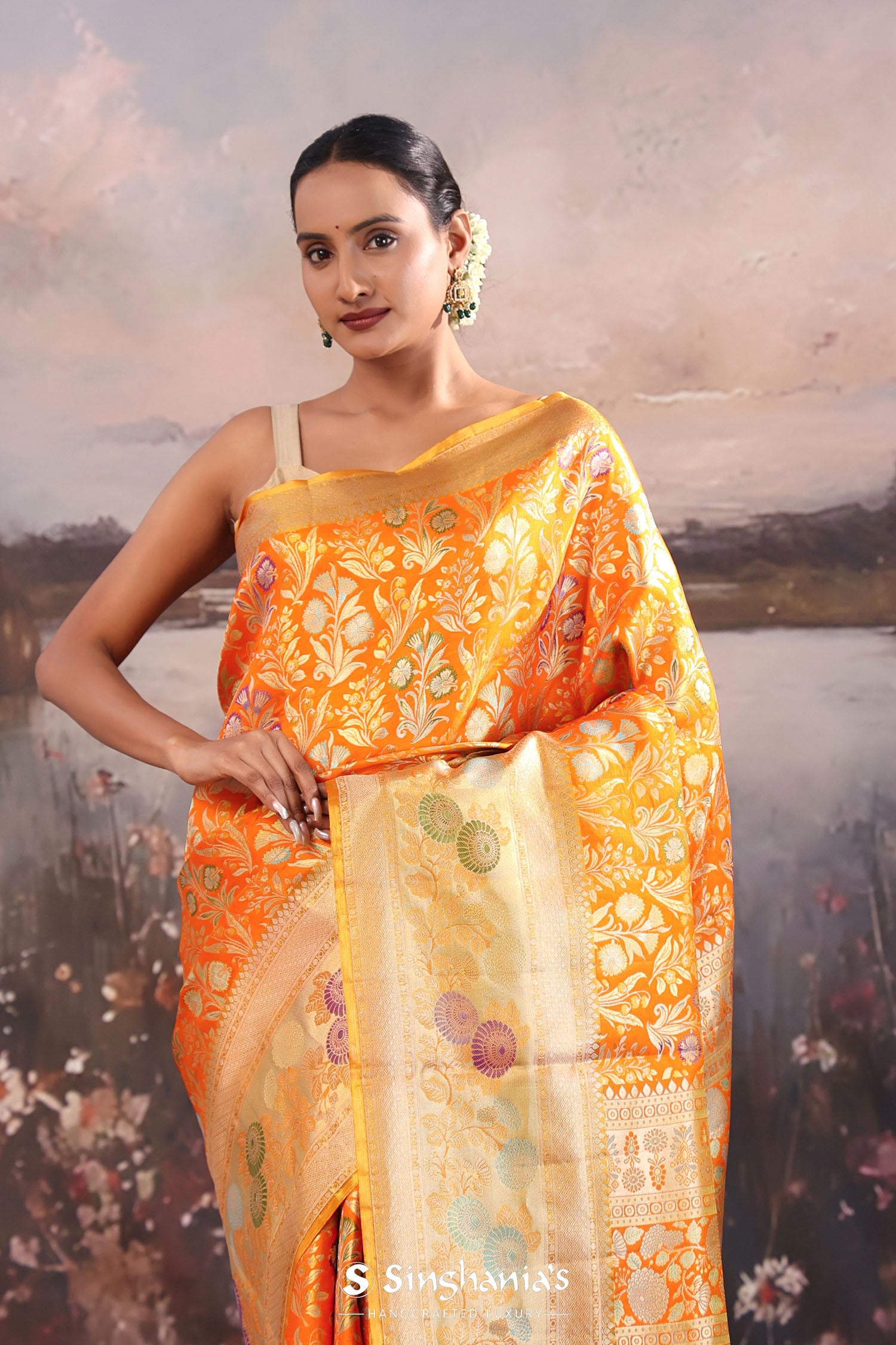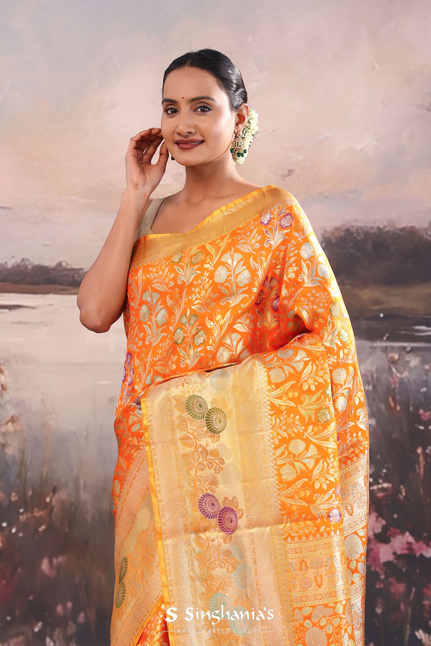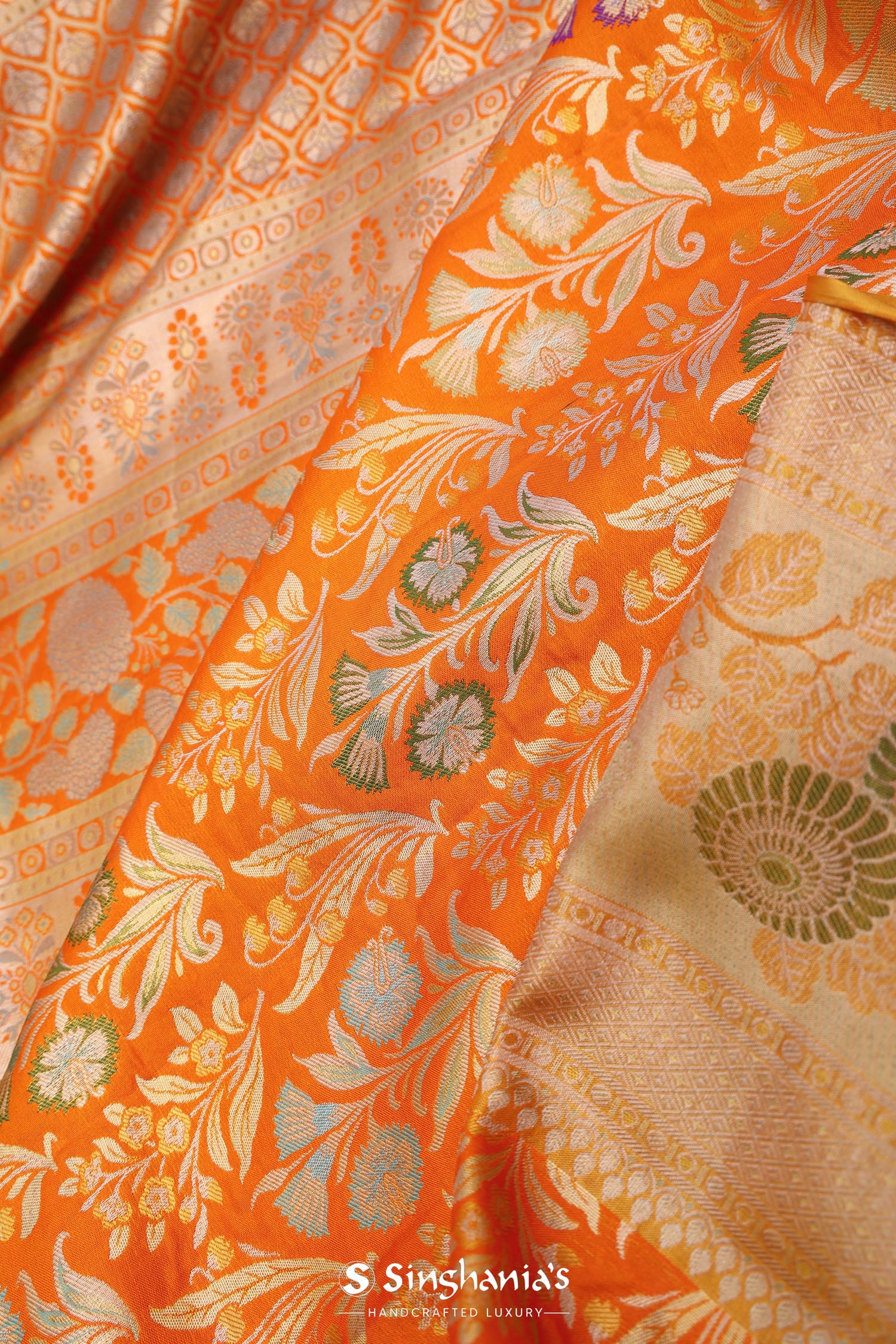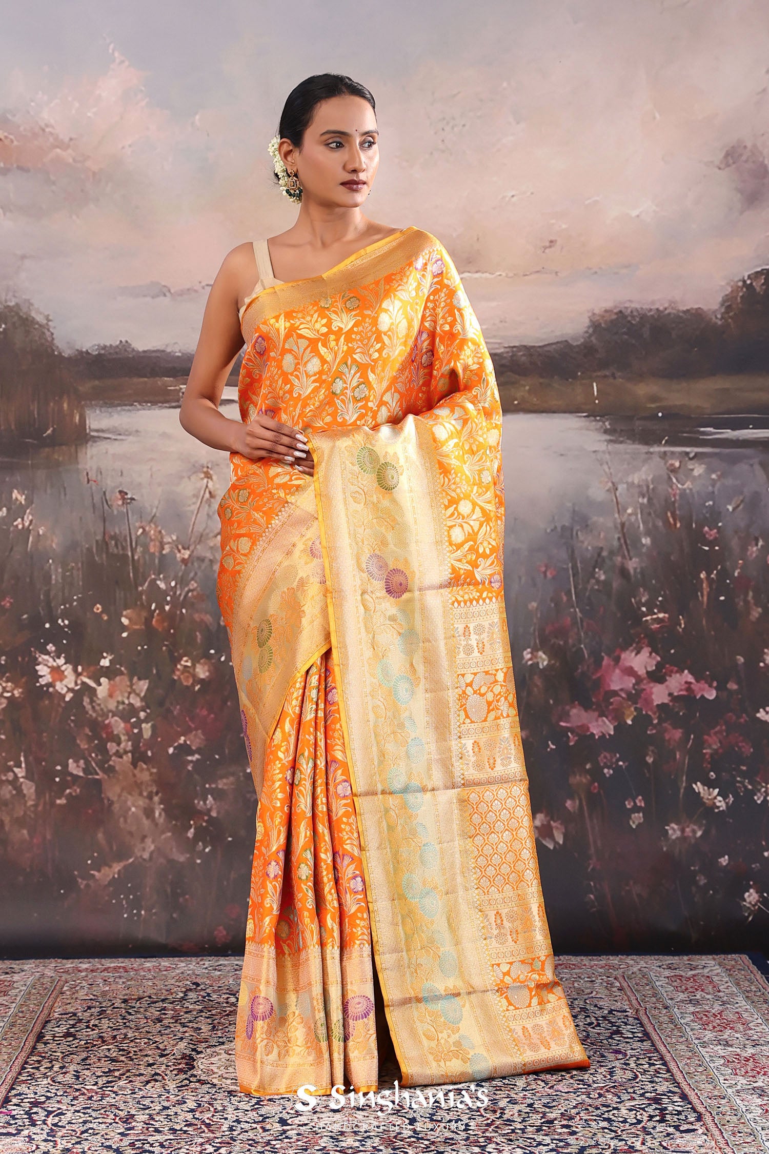 The floral and leaf woven design spread all across the body of the Pumpkin orange kanjivaram tissue saree complemented with meenakari border