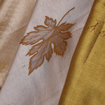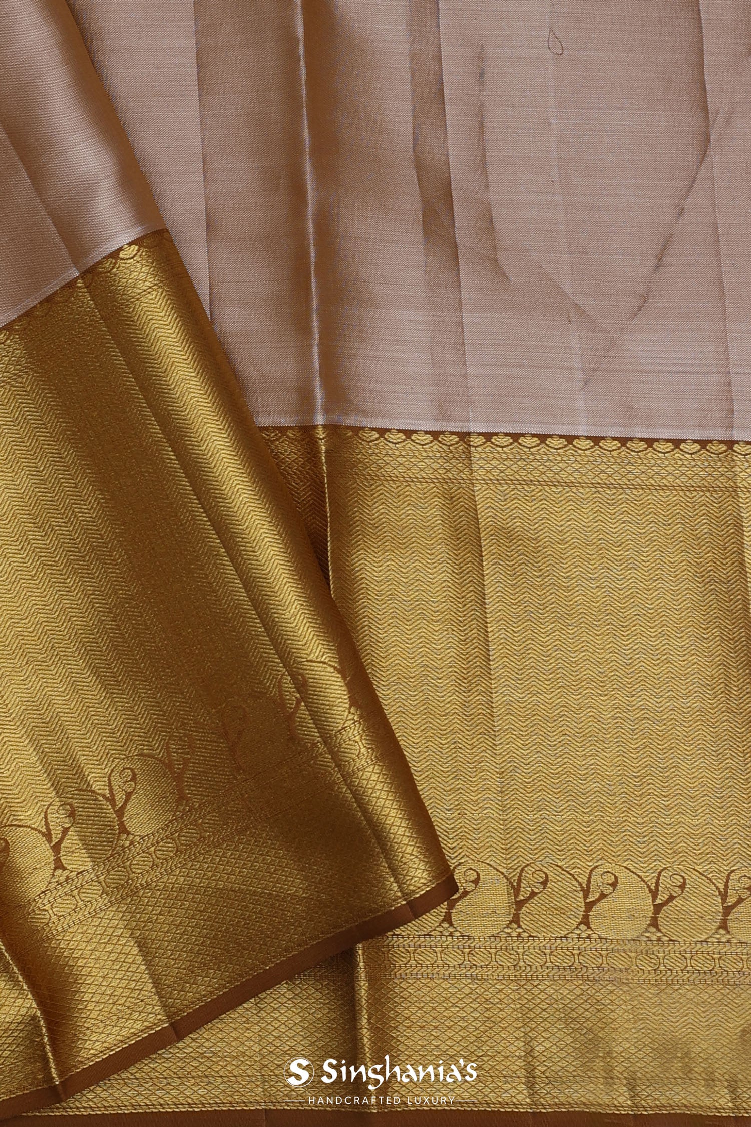 The Silver kanjivaram tissue saree features maple leaf design woven which is scattered on the body complemented with coffee brown border adorned with gold zari