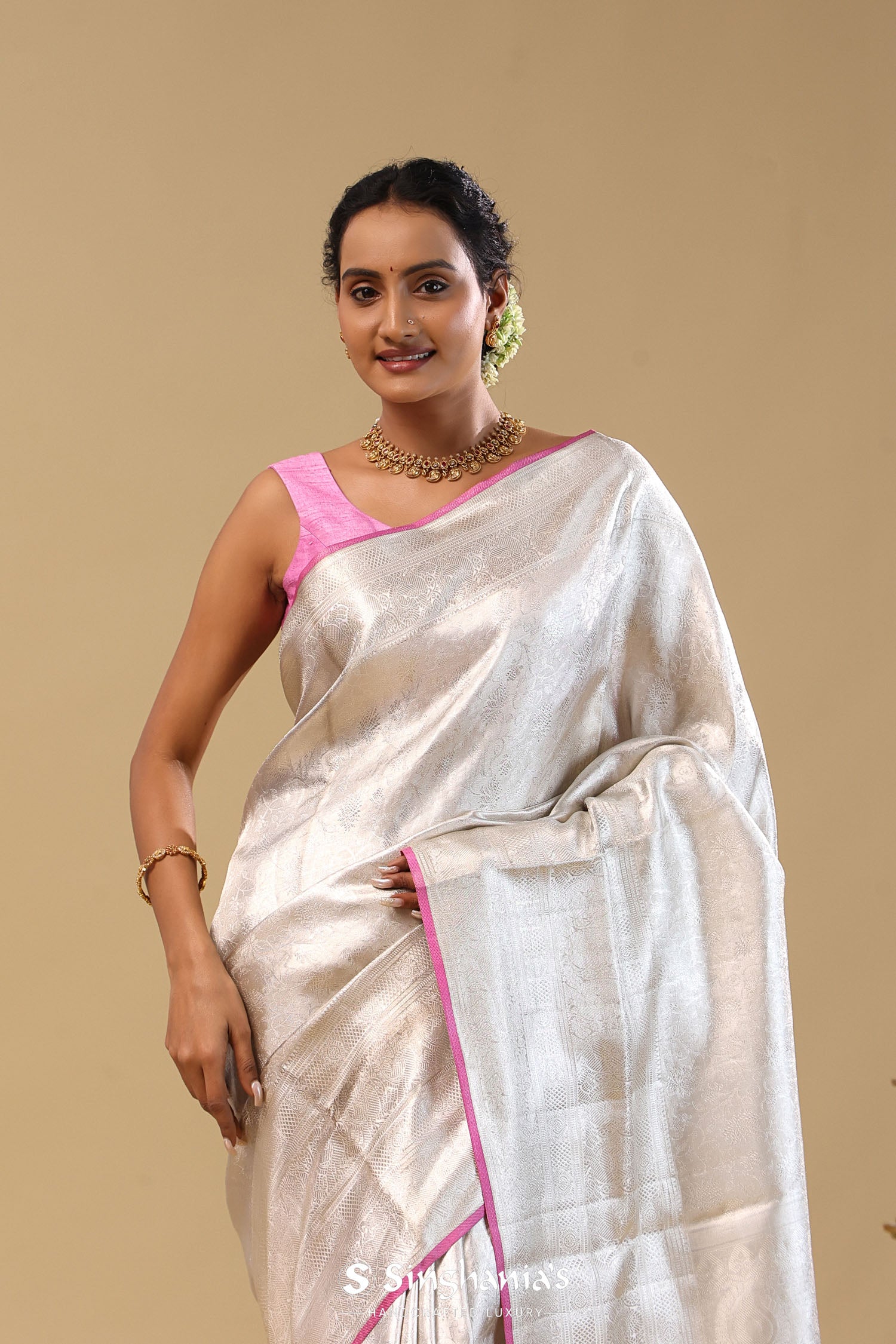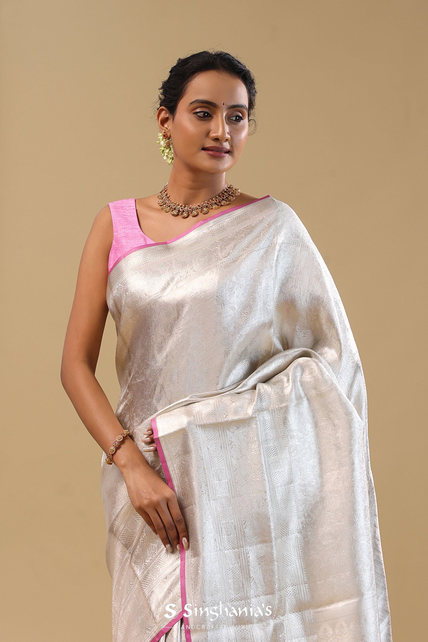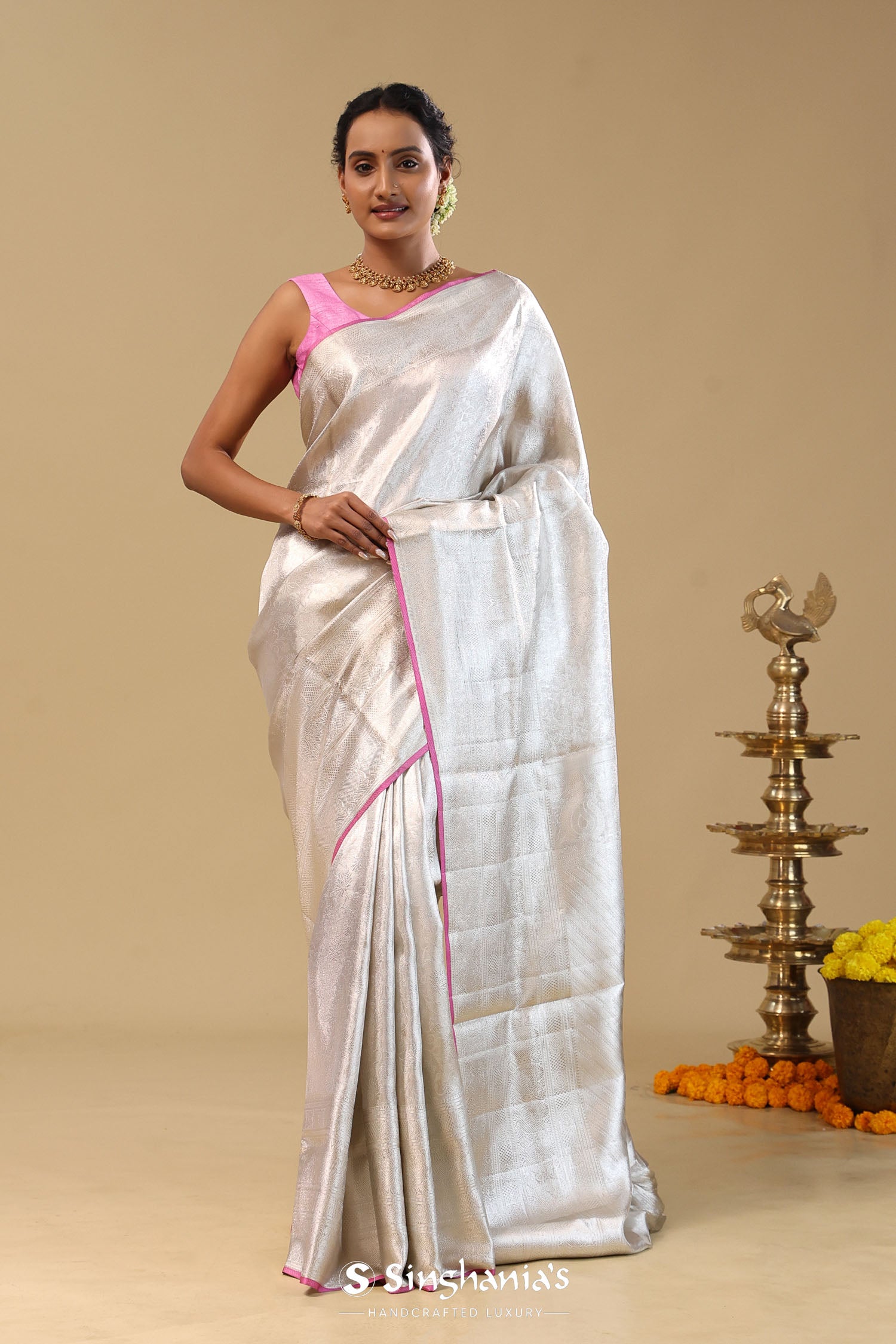Silver Kanjivaram Tissue Saree With Pink Edge