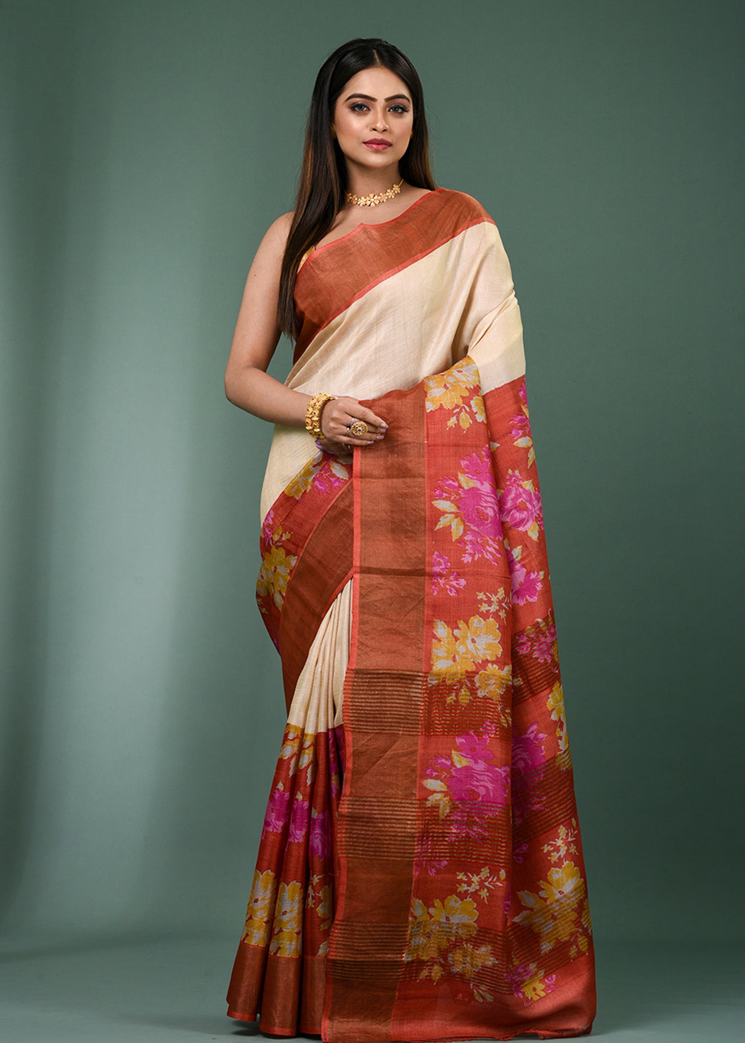 Cream Tussar Silk Saree With Vibrant Floral Prints