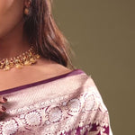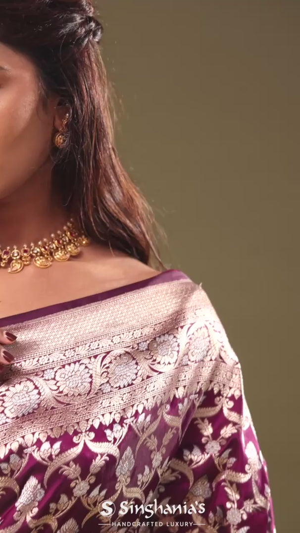 A luxurious blackberry Banarasi saree with jaal design accompanied by gold and silver zari meena embellished with flower designs and its regal beauty is enhanced by the border's elaborate gold and silver zari embroidery.