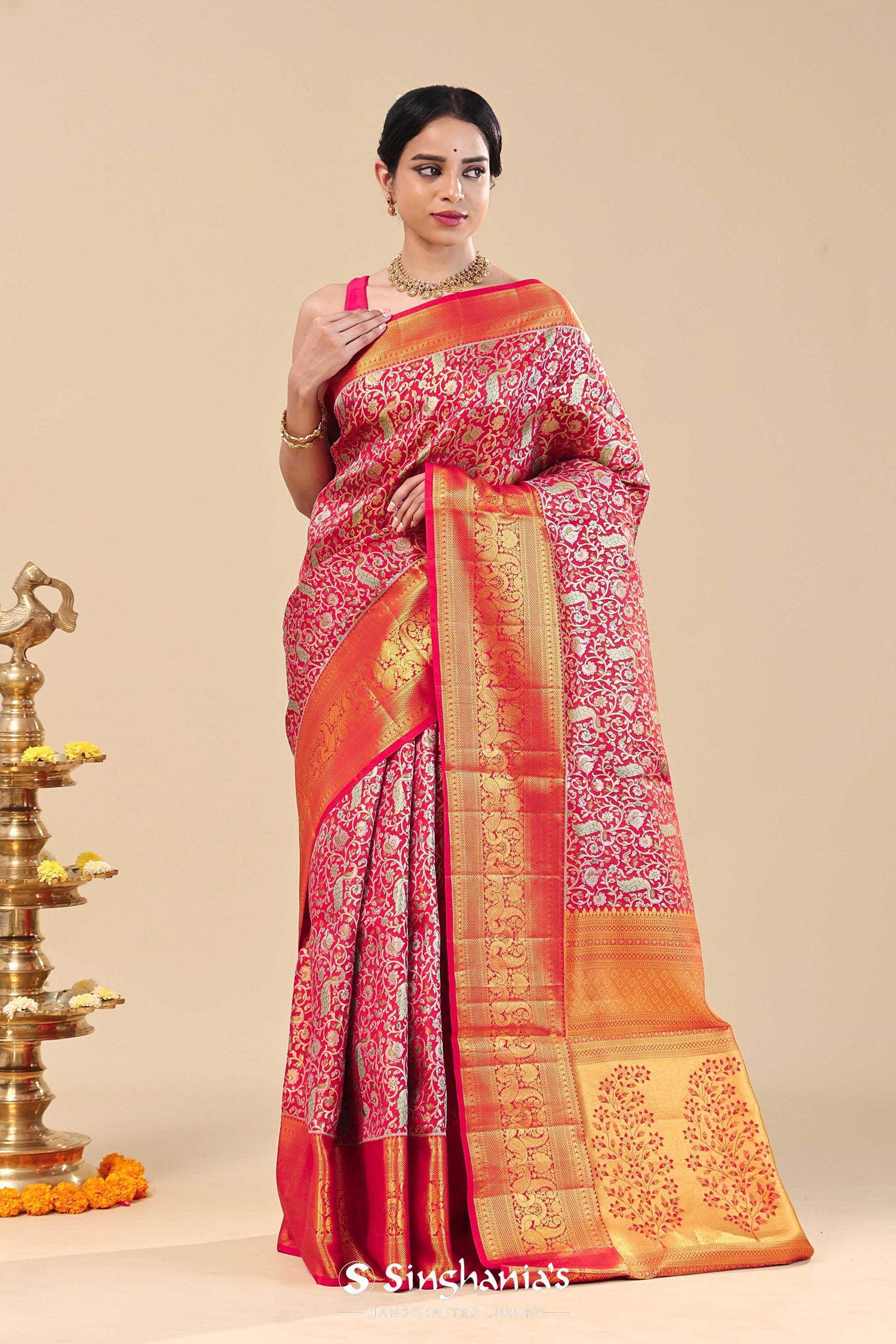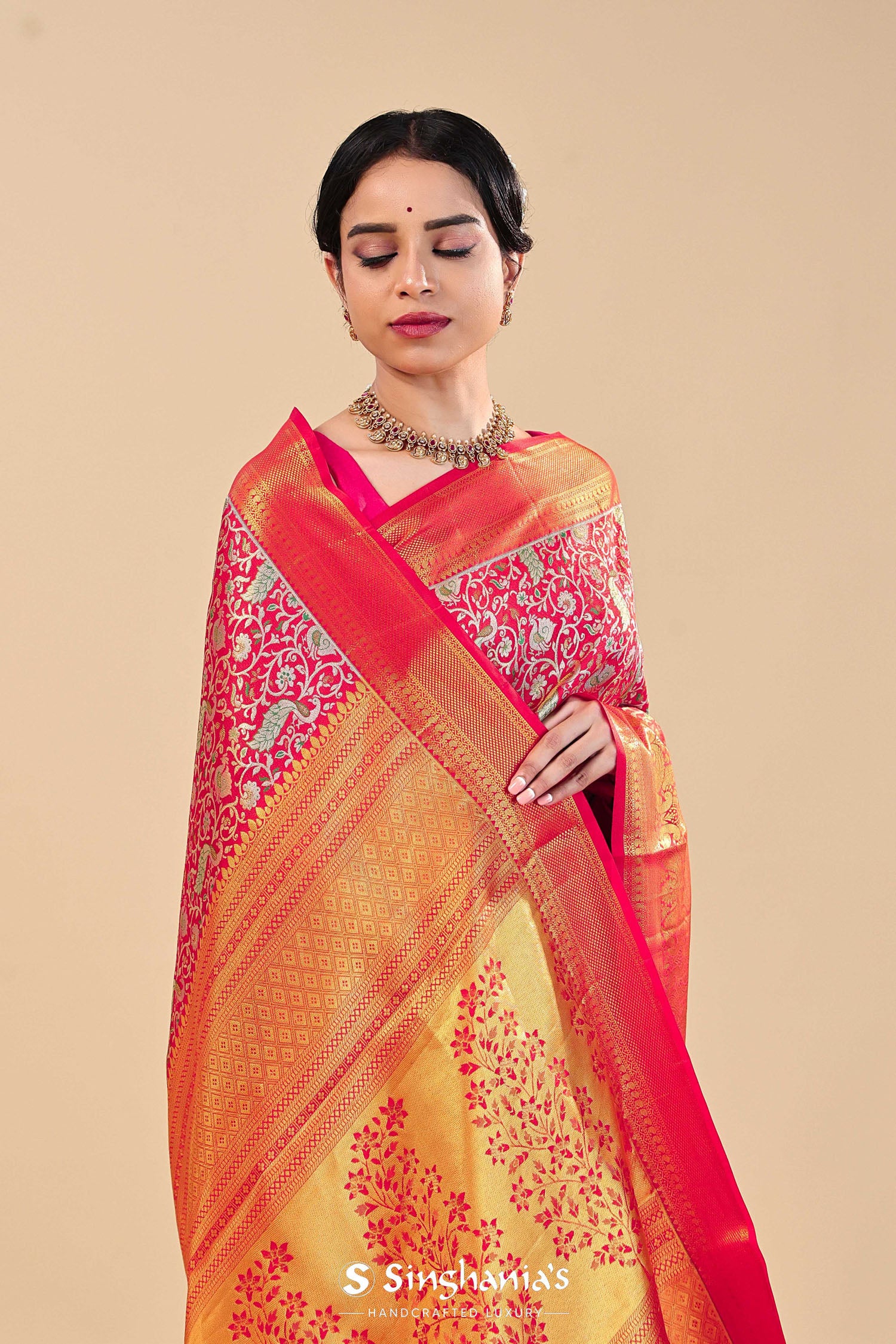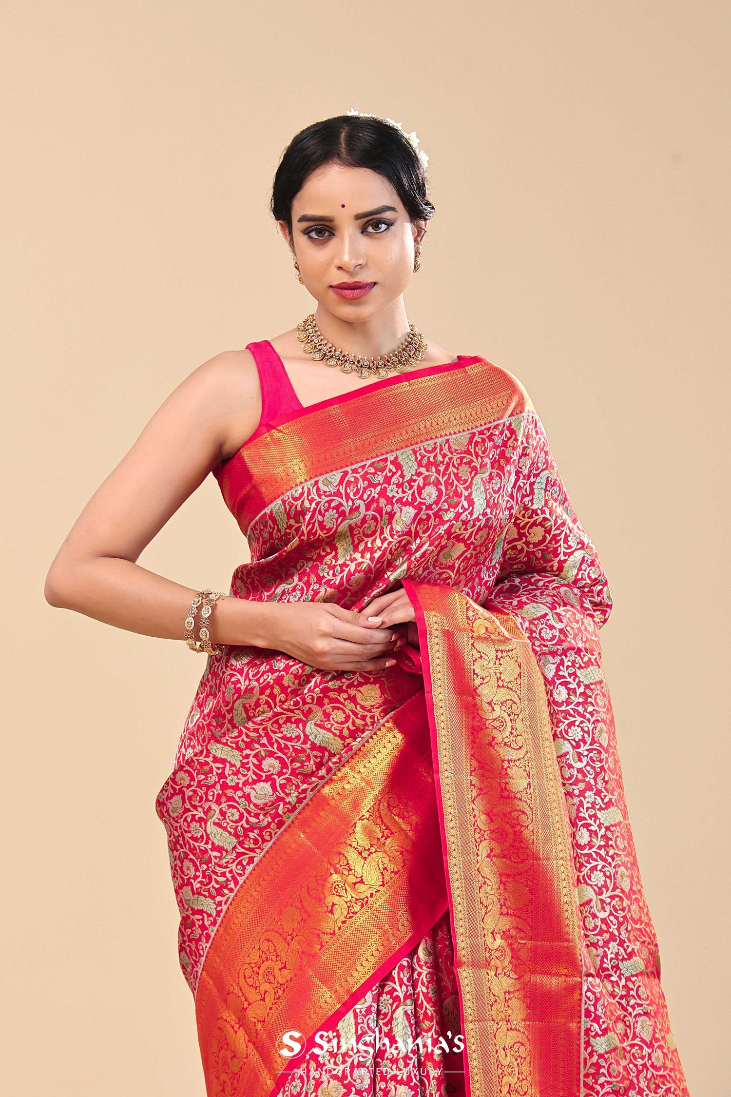 Crimson Red Kanjivaram Silk Saree With Leaf And Peacock Jaal