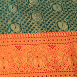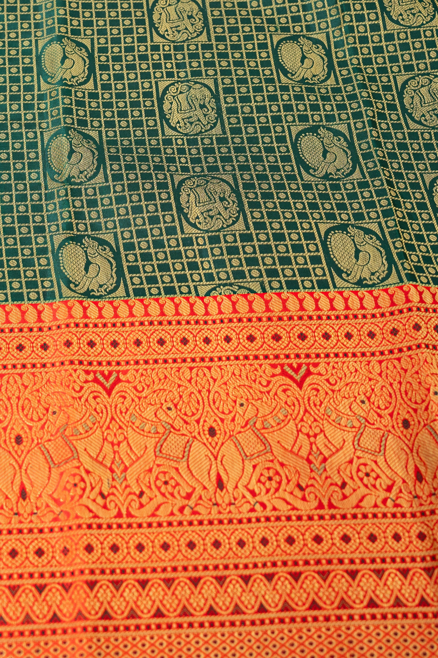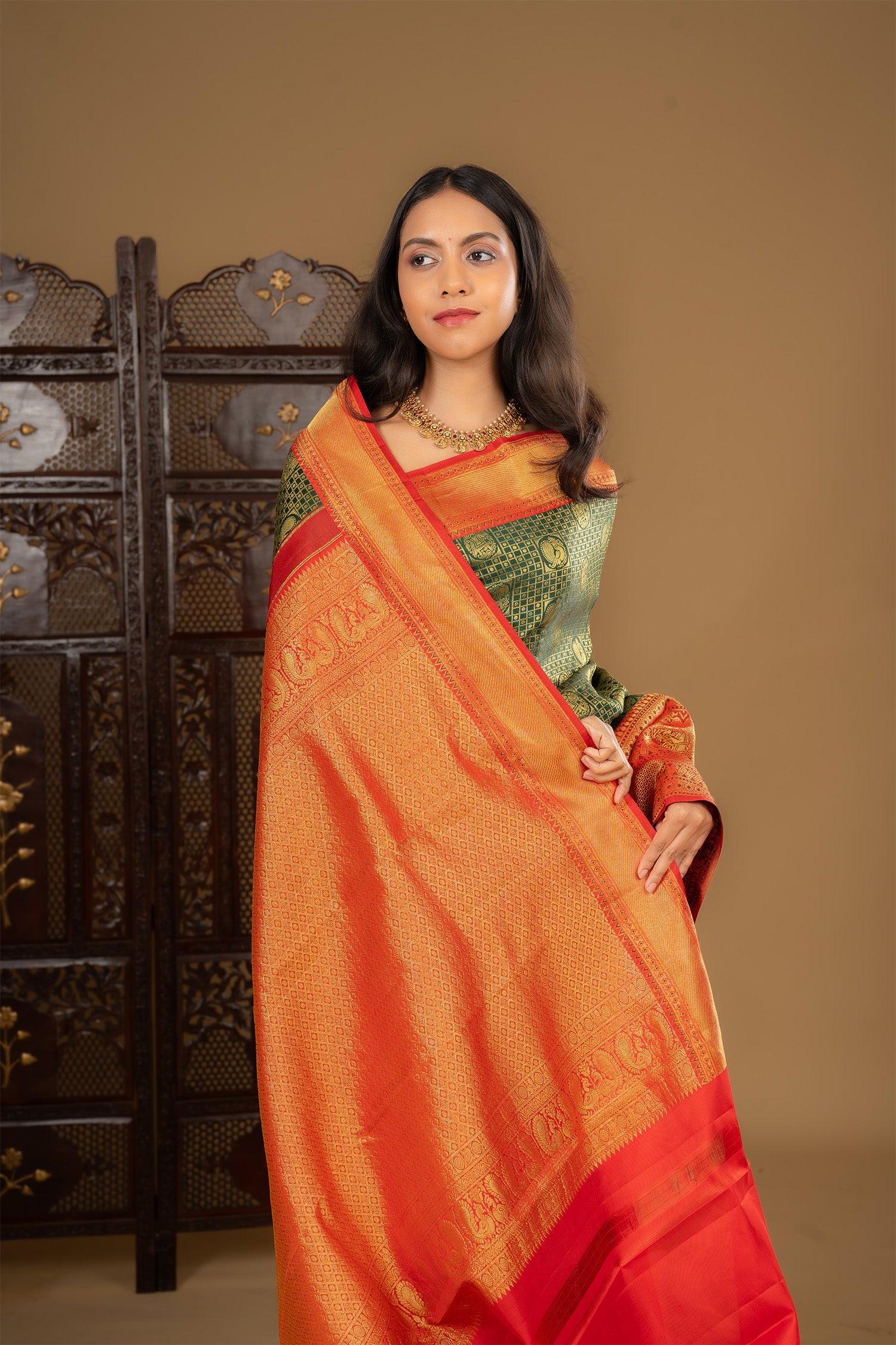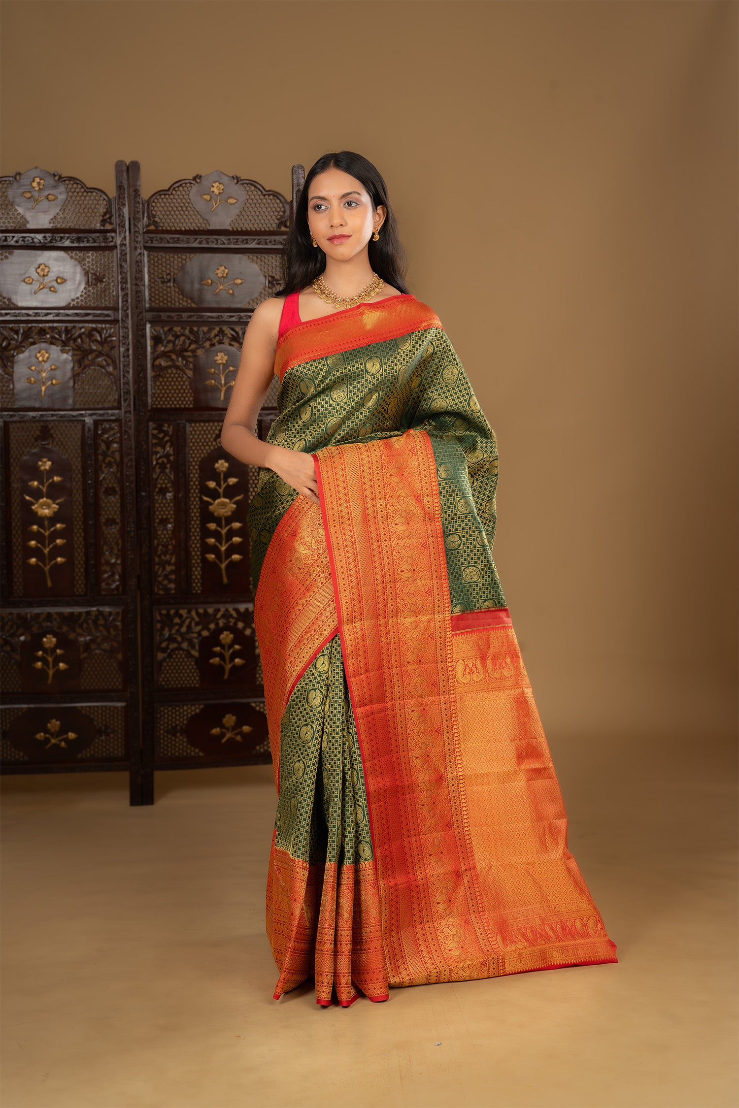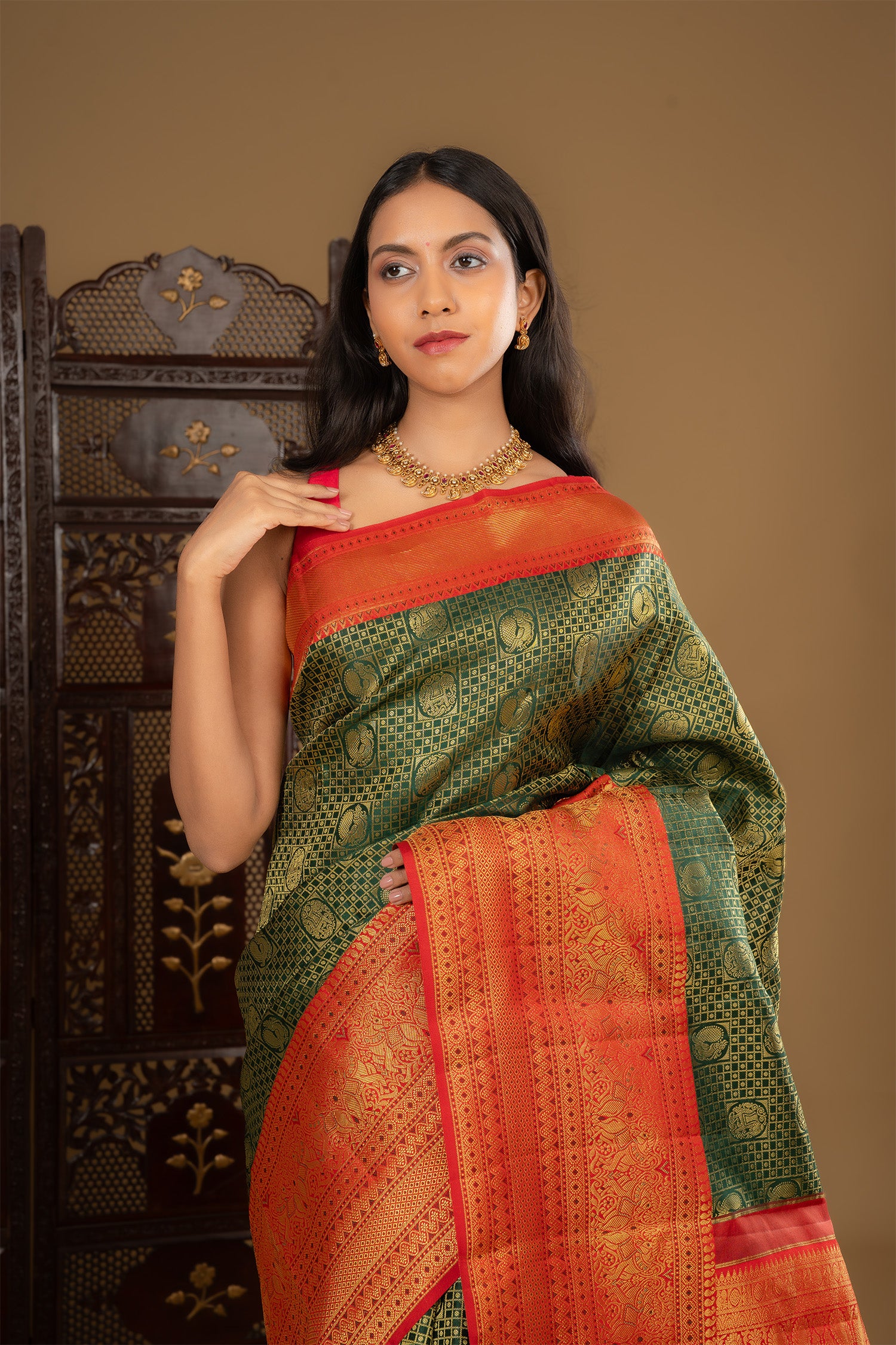 The dark bottle green kanjivaram silk saree with golden zari checks and buttis along with contrast red border for a rich traditional look with classy elegance.
