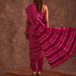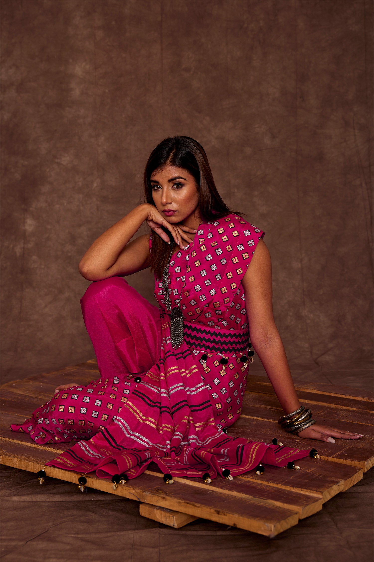 The fuchsia pink blue pure chinon drape saree that consists of one shoulder top with pre stitched dhoti and a dupatta for a majestic look with comfortable feel combined with style and elegance.