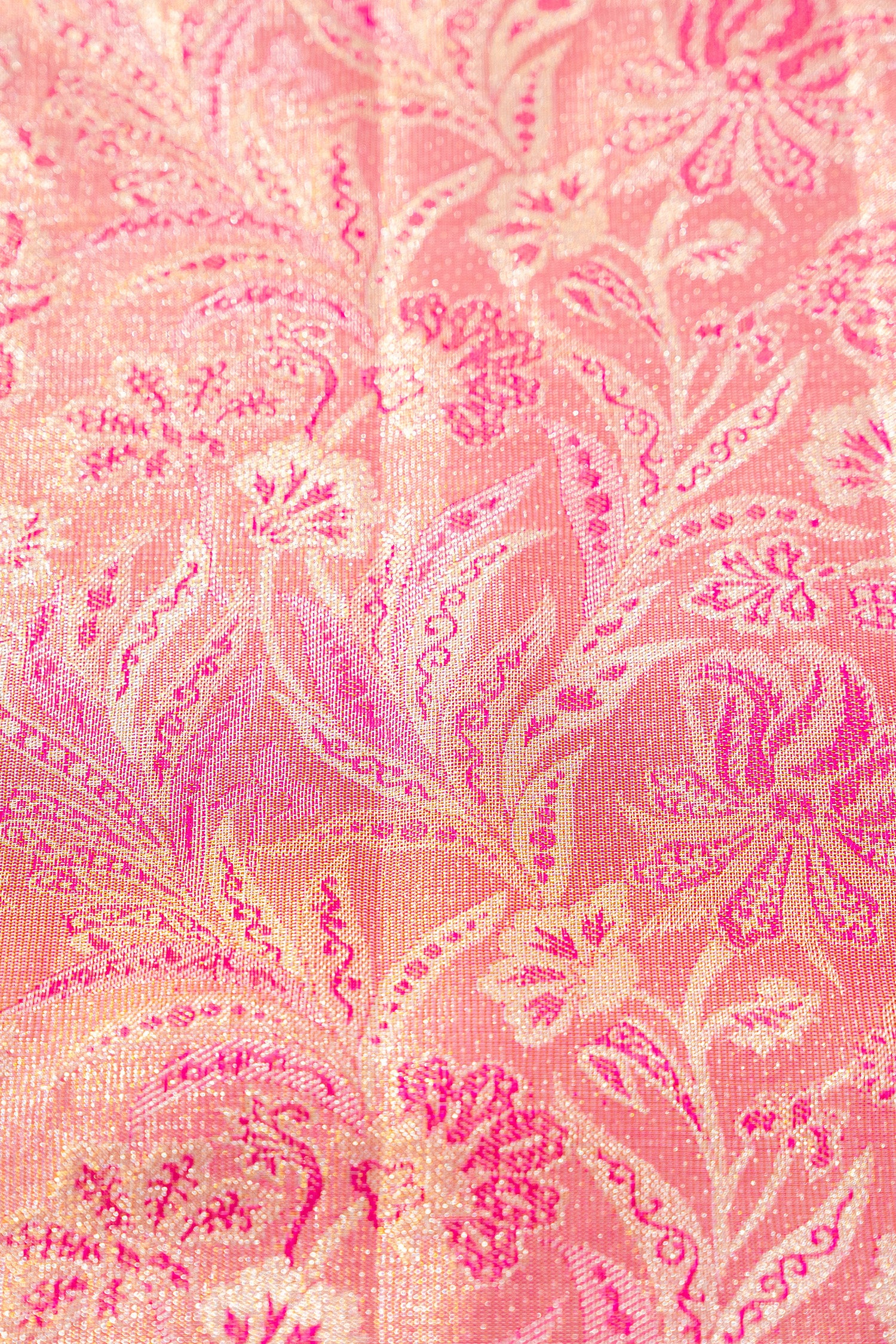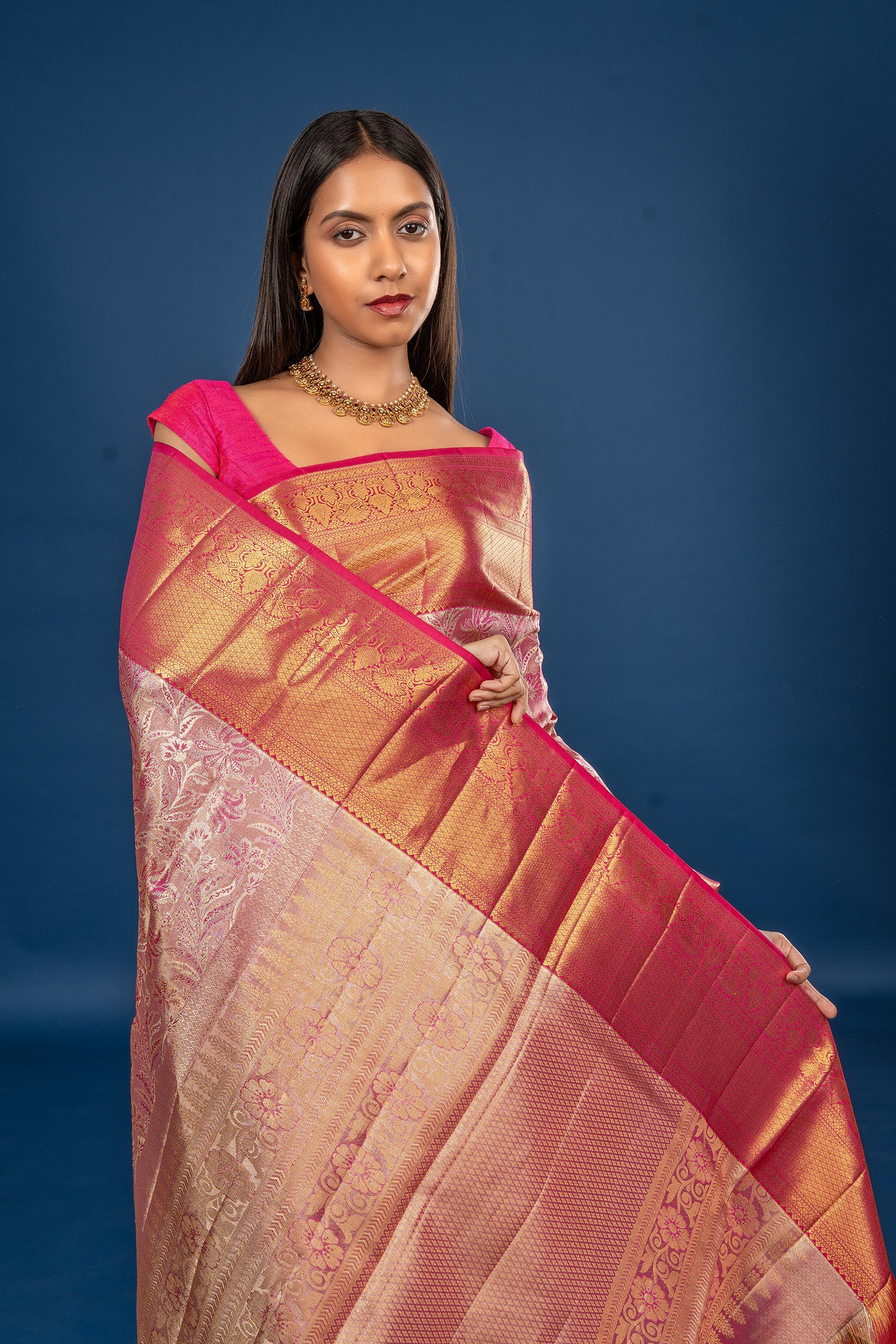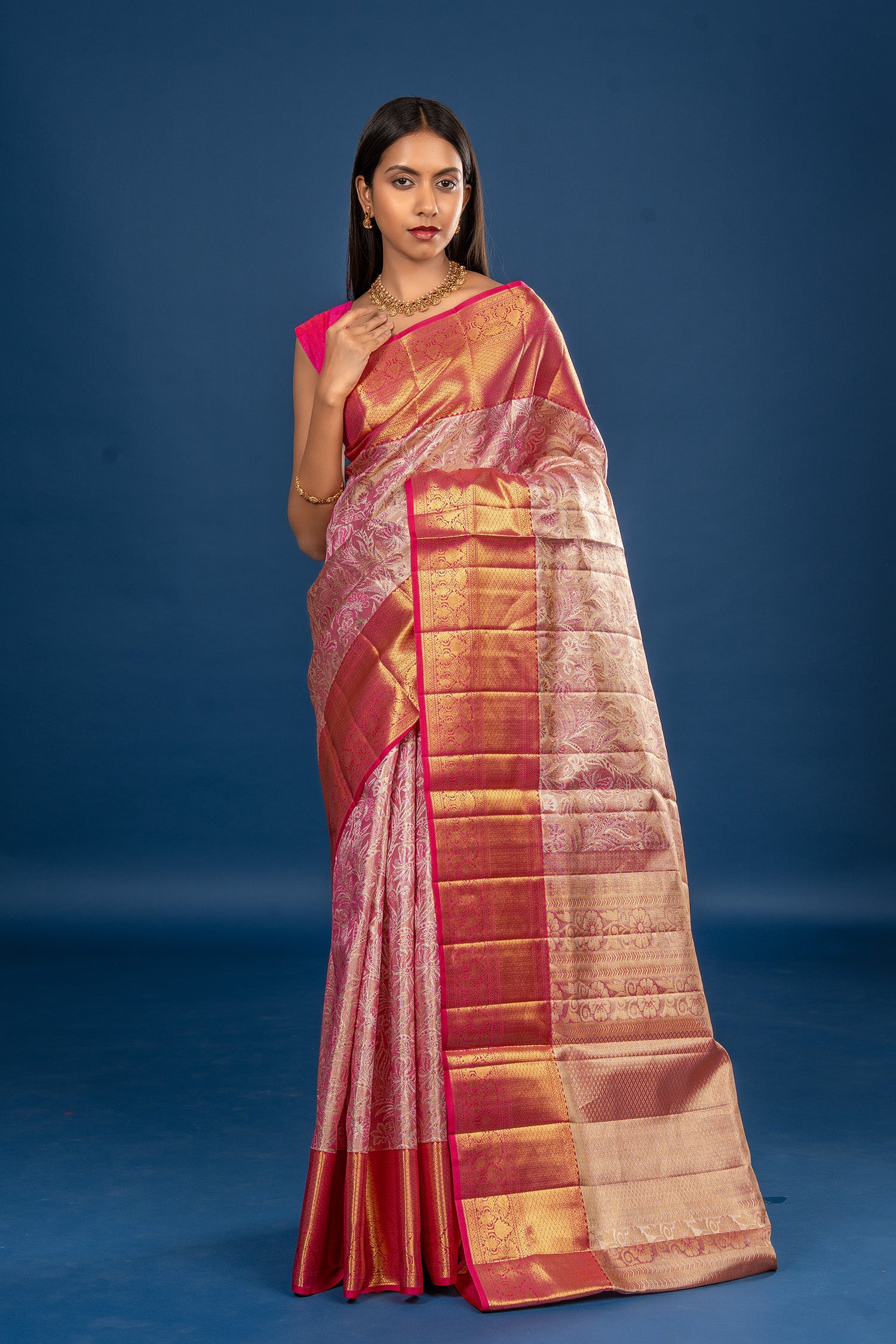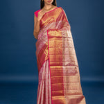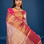 The golden pink kanjivaram silk saree with golden zari design and contrast dark pink border for a rich traditional look with cultural elegance.