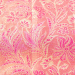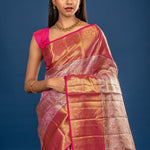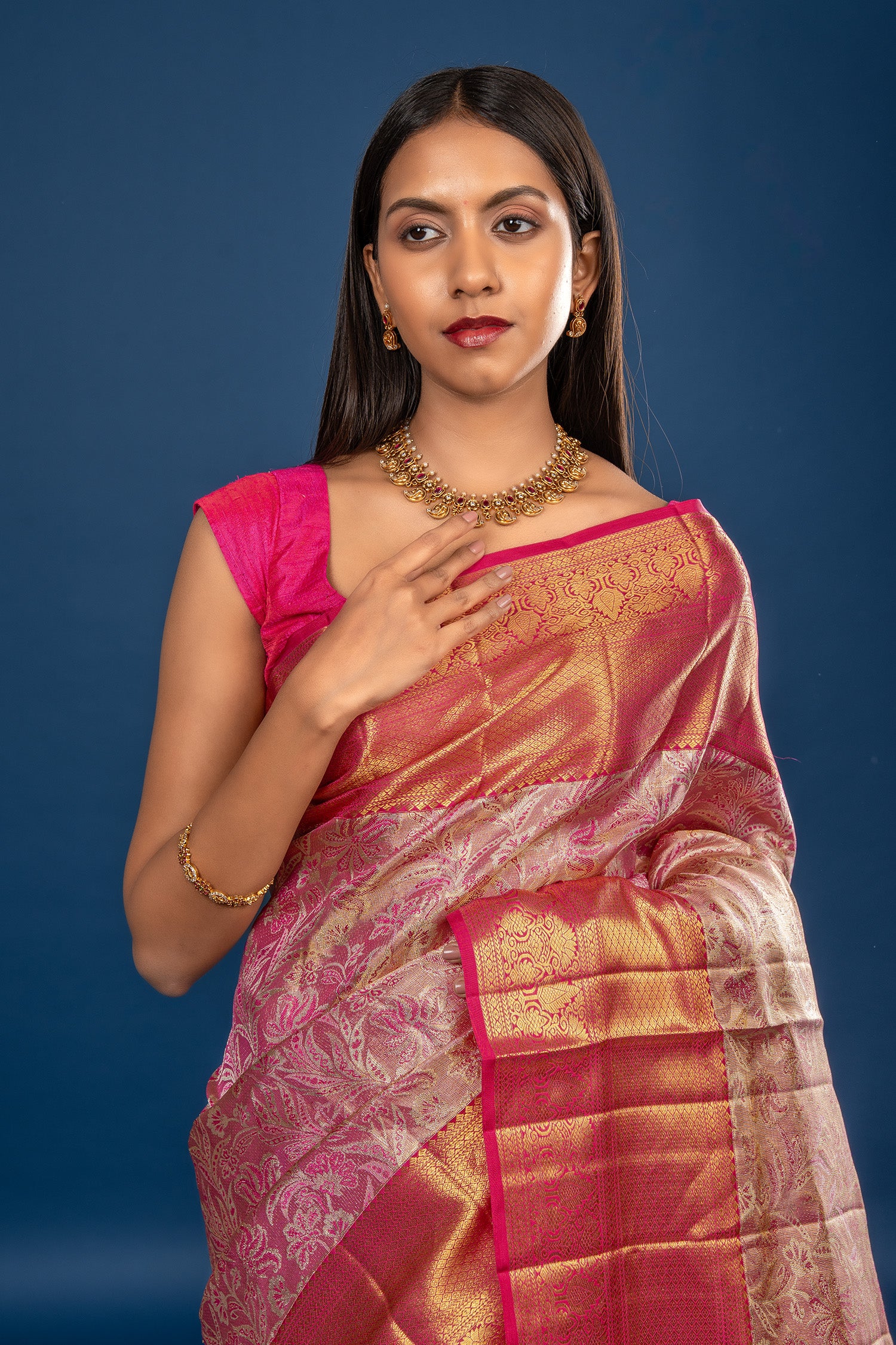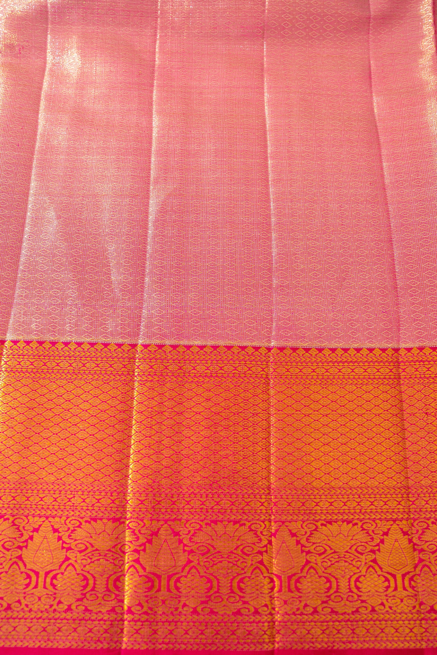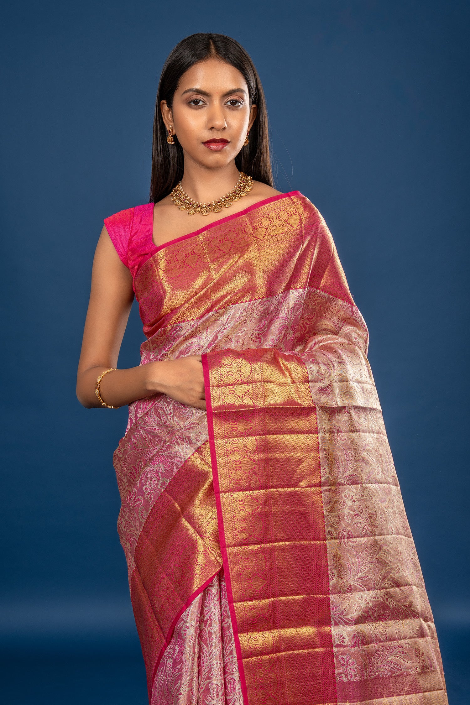 The golden pink kanjivaram silk saree with golden zari design and contrast dark pink border for a rich traditional look with cultural elegance.