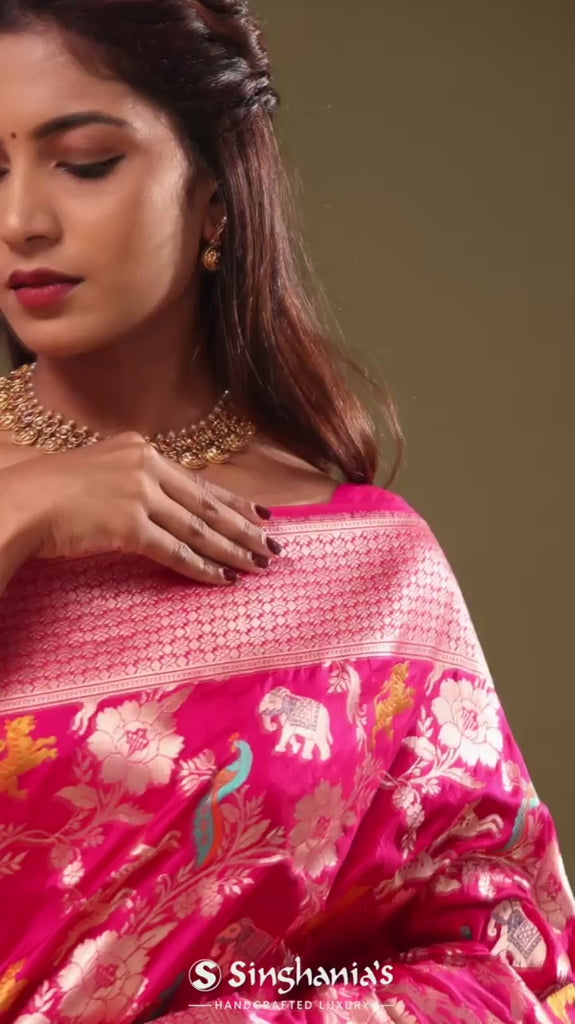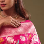 Hot Pink Banarasi Saree With Floral Jaal And Shikargah Design