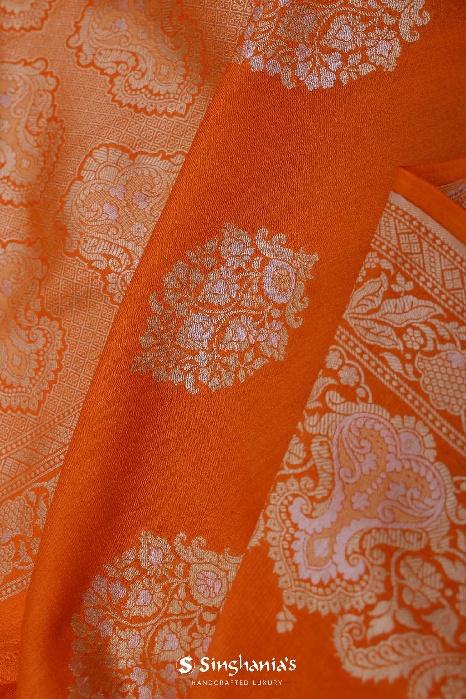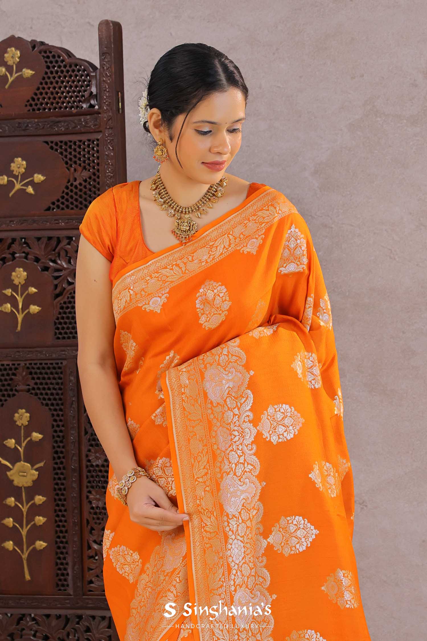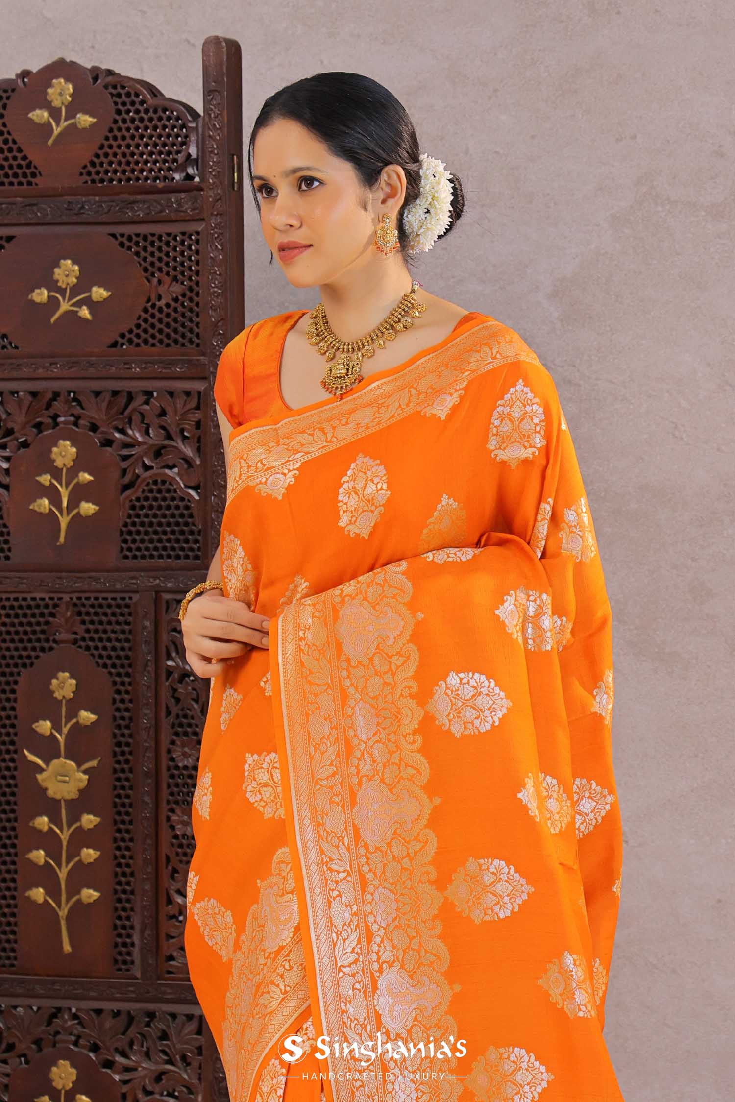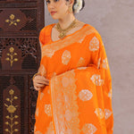 This elegant International orange munga tussar saree reflects grace and sophistication by the colours and the woven work on fabric by gold zari , adds extra charm to the overall look of the saree .Which is the perfect blend of traditional and contemporary style.