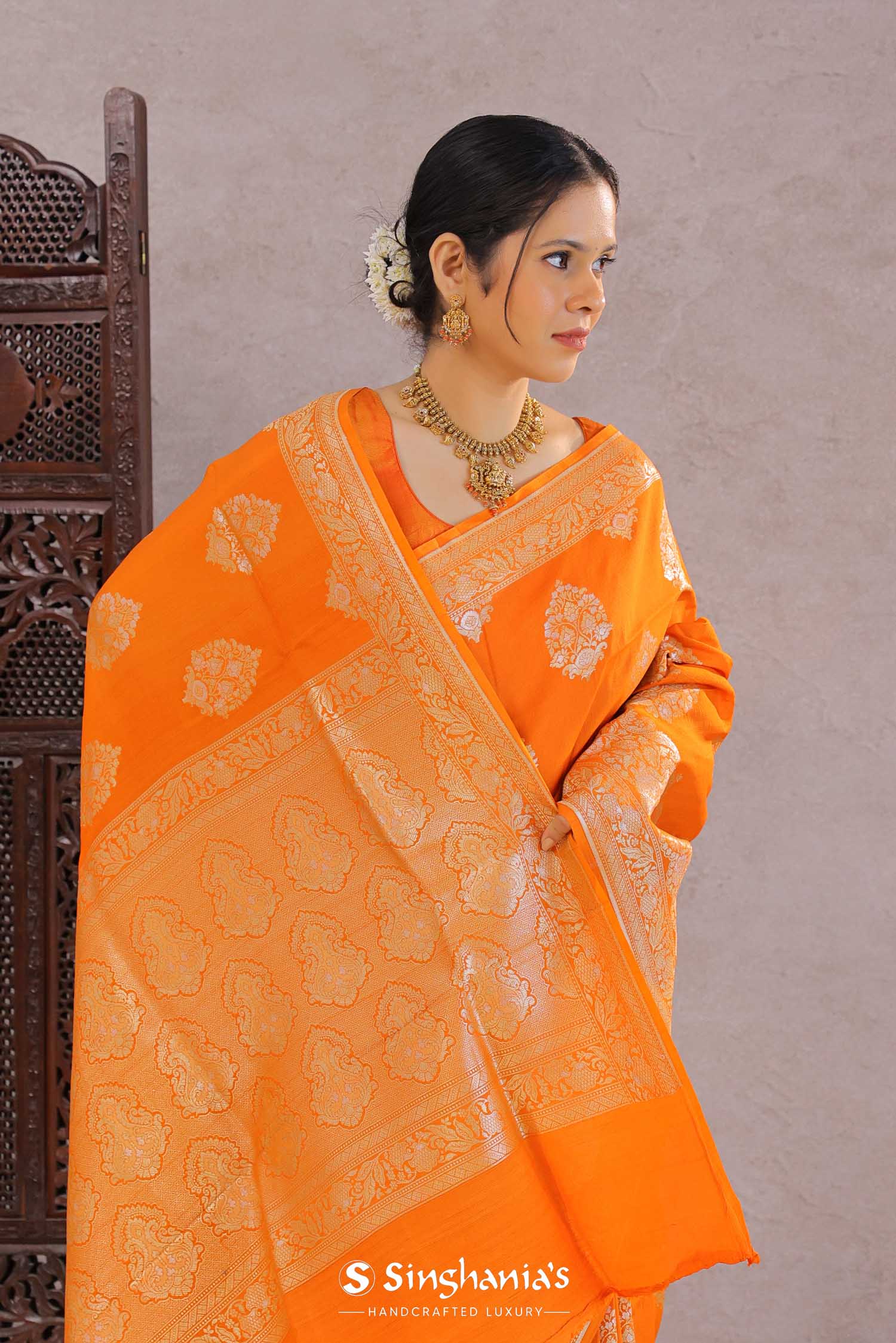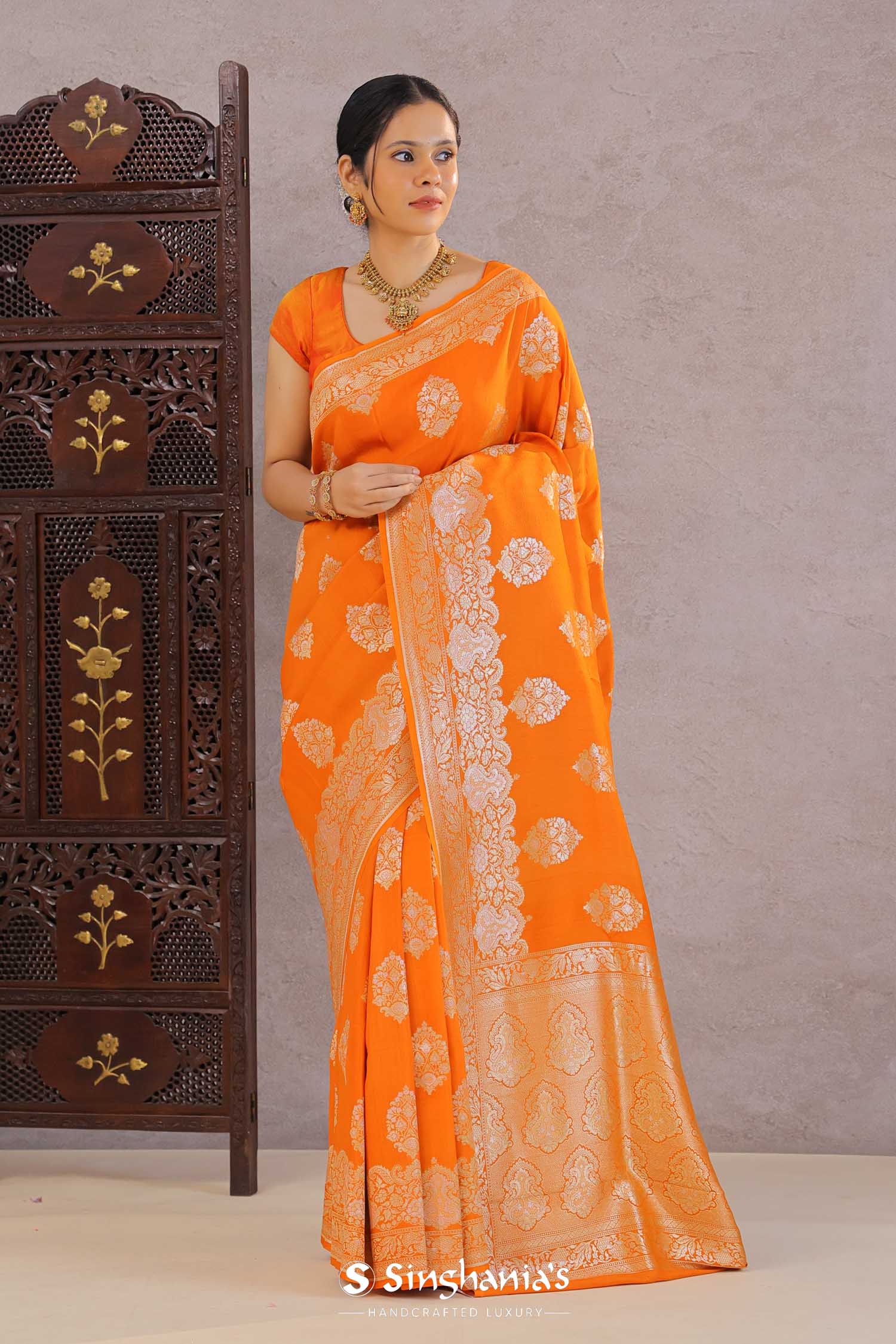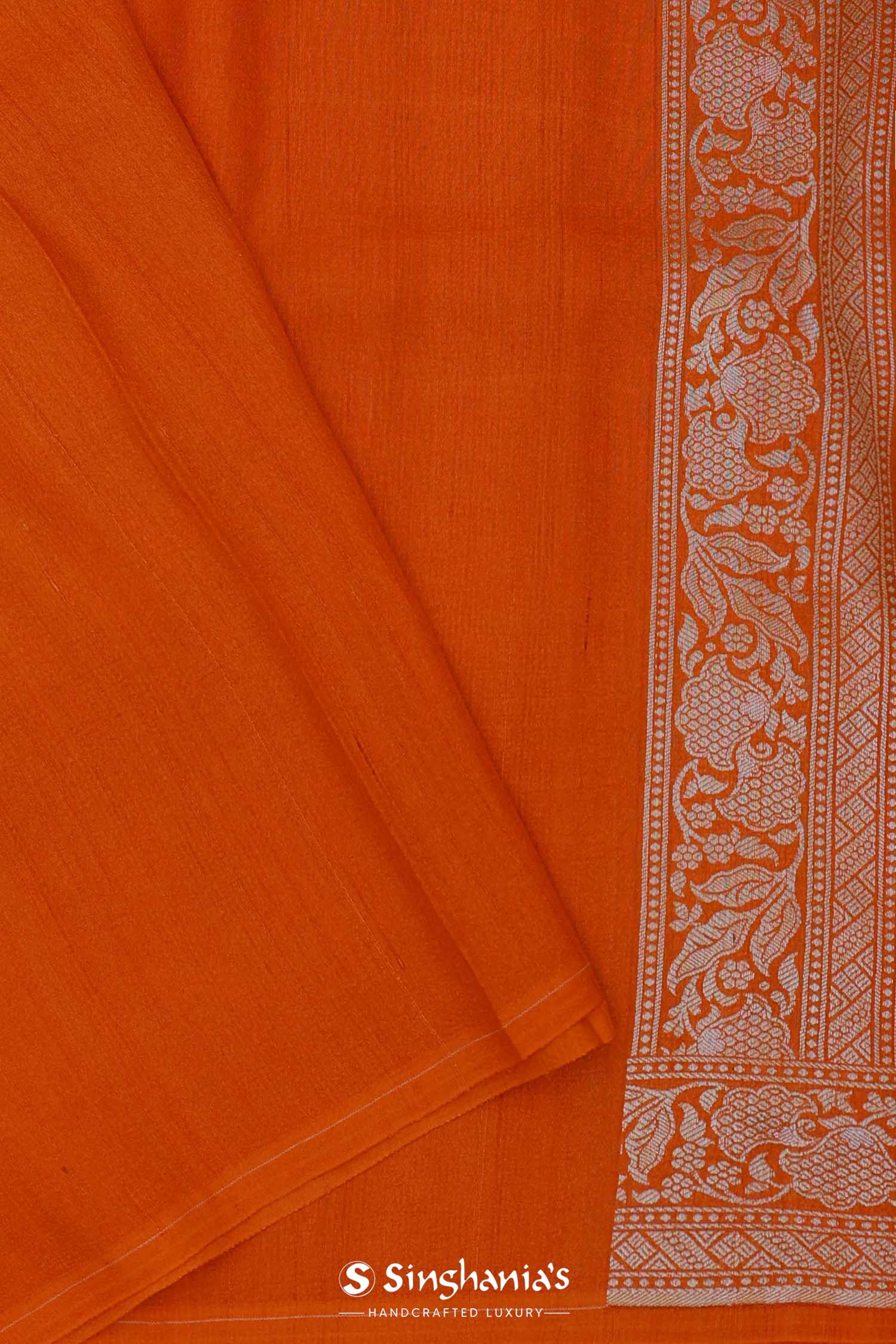 This elegant International orange munga tussar saree reflects grace and sophistication by the colours and the woven work on fabric by gold zari , adds extra charm to the overall look of the saree .Which is the perfect blend of traditional and contemporary style.