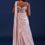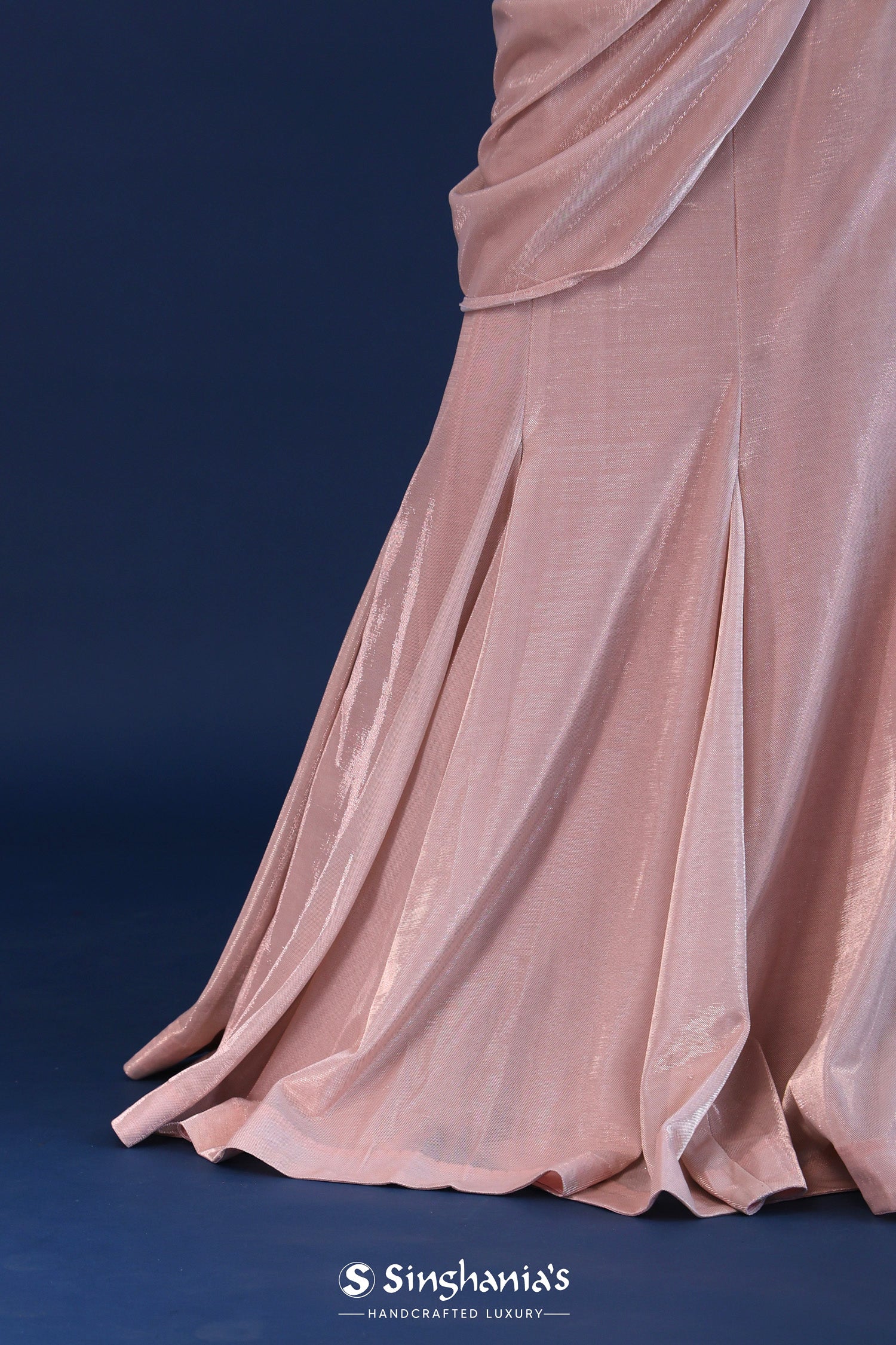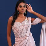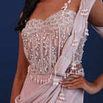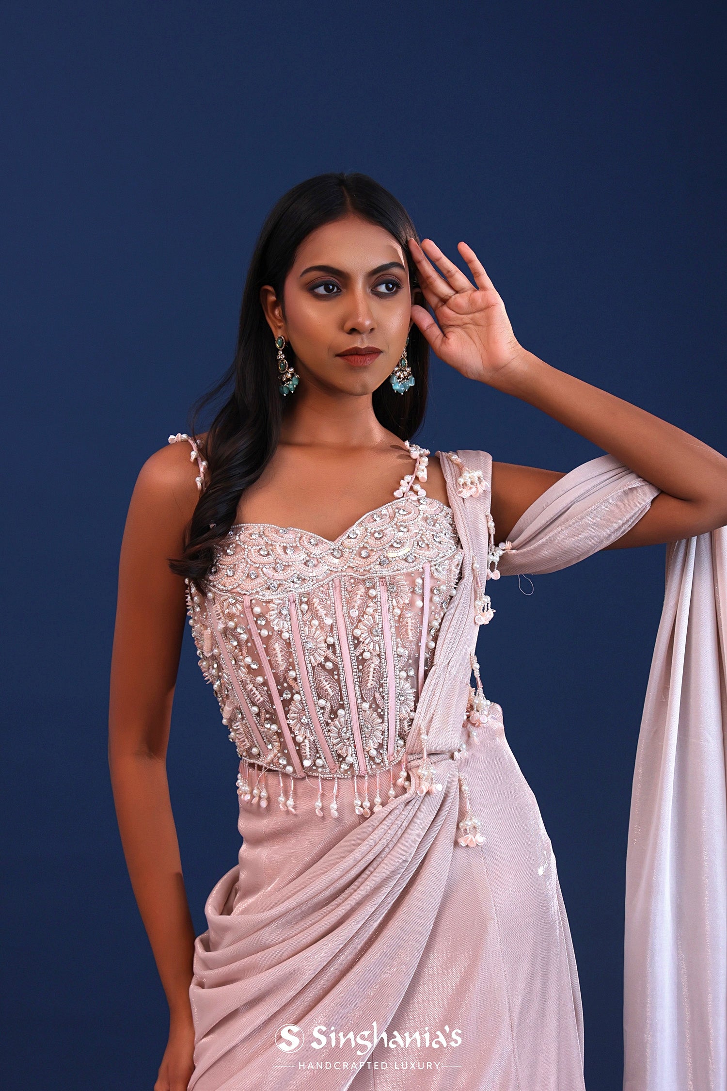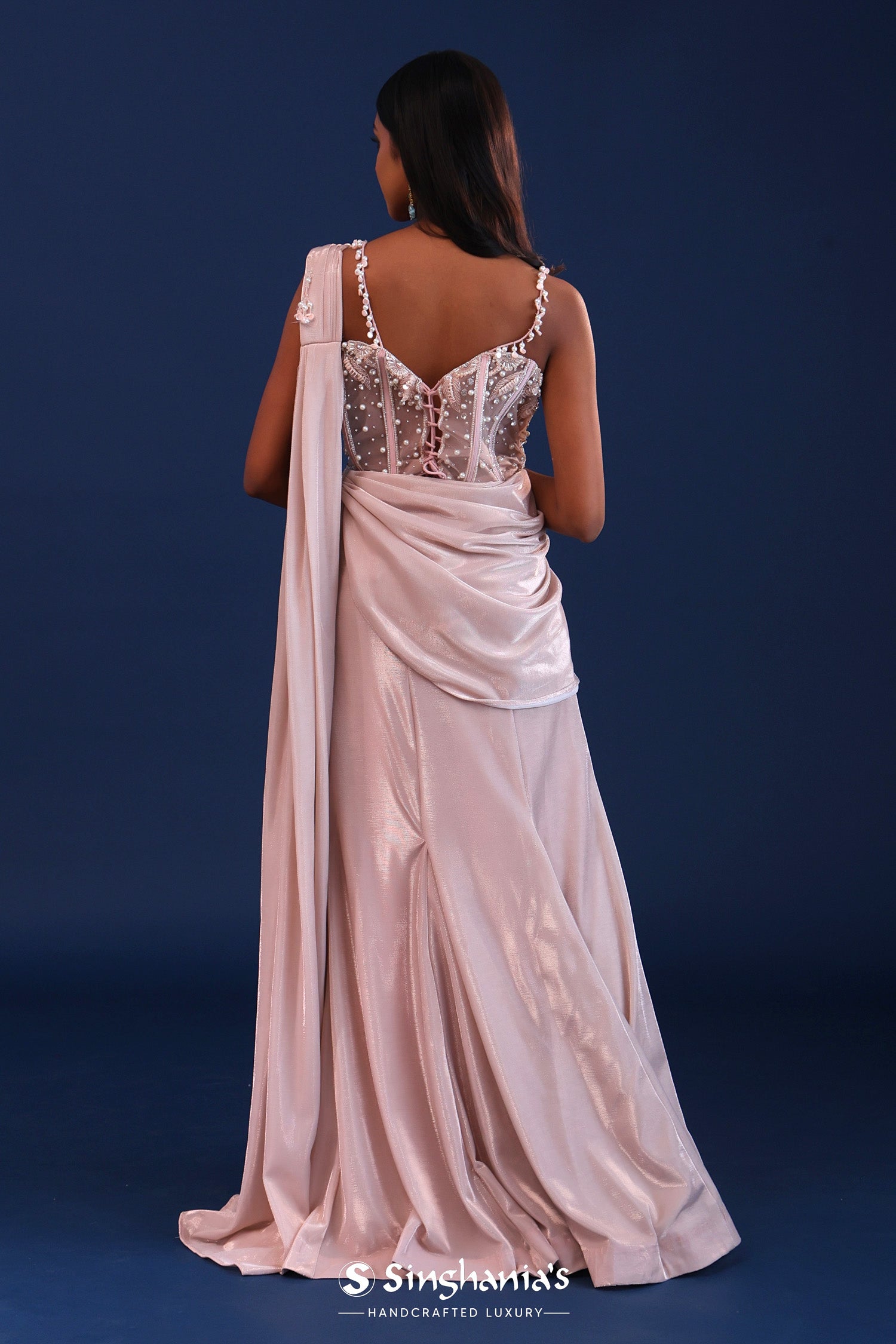 The light pastel pink soft shimmer drape saree with pearl work detached blouse for a beautiful combination of tradition with fashion.