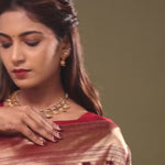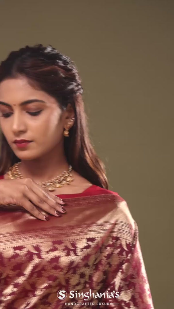 A maroon Banarasi saree with a golden zari border and an all-over leaf jaal woven in golden zari for a classic and regal style.