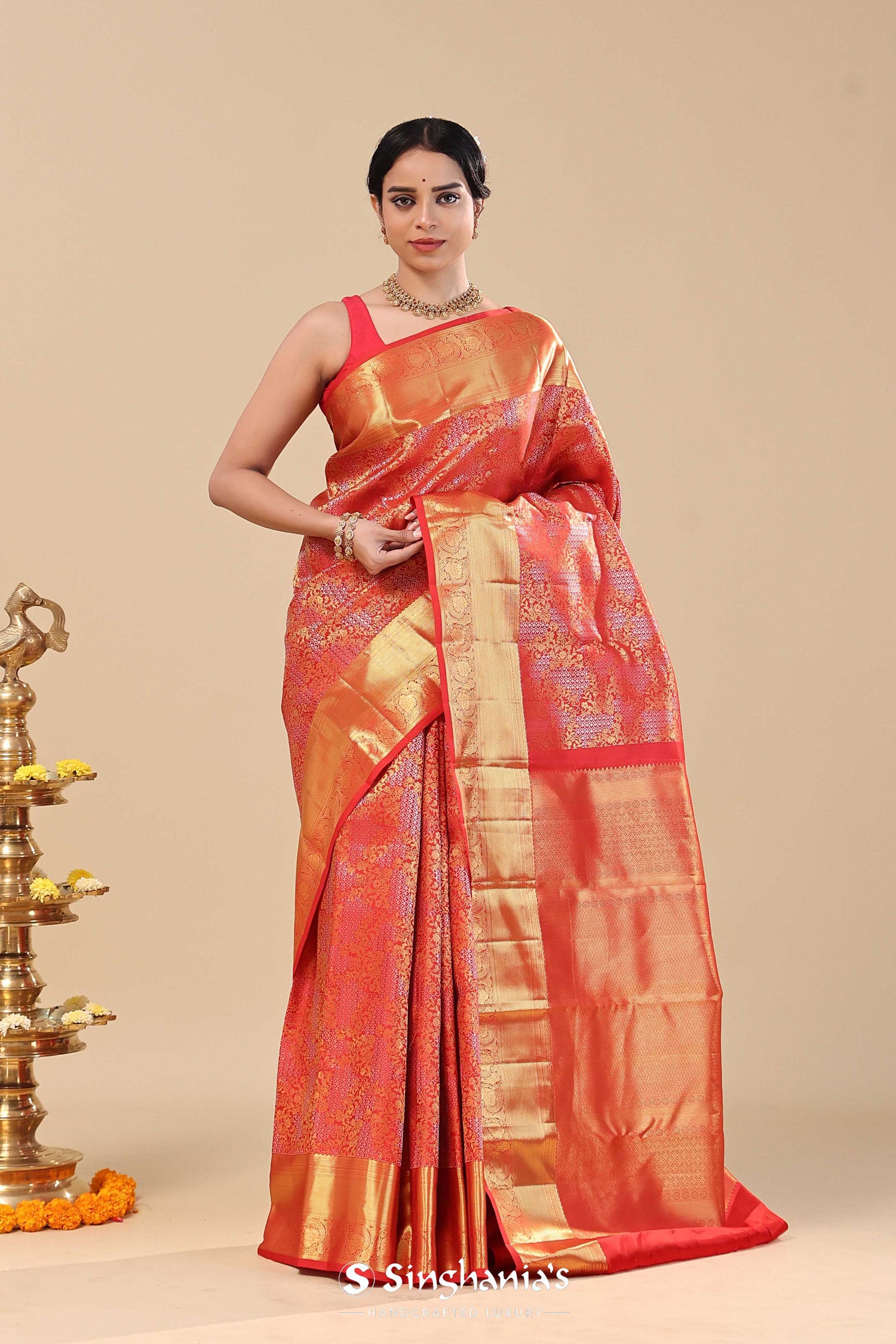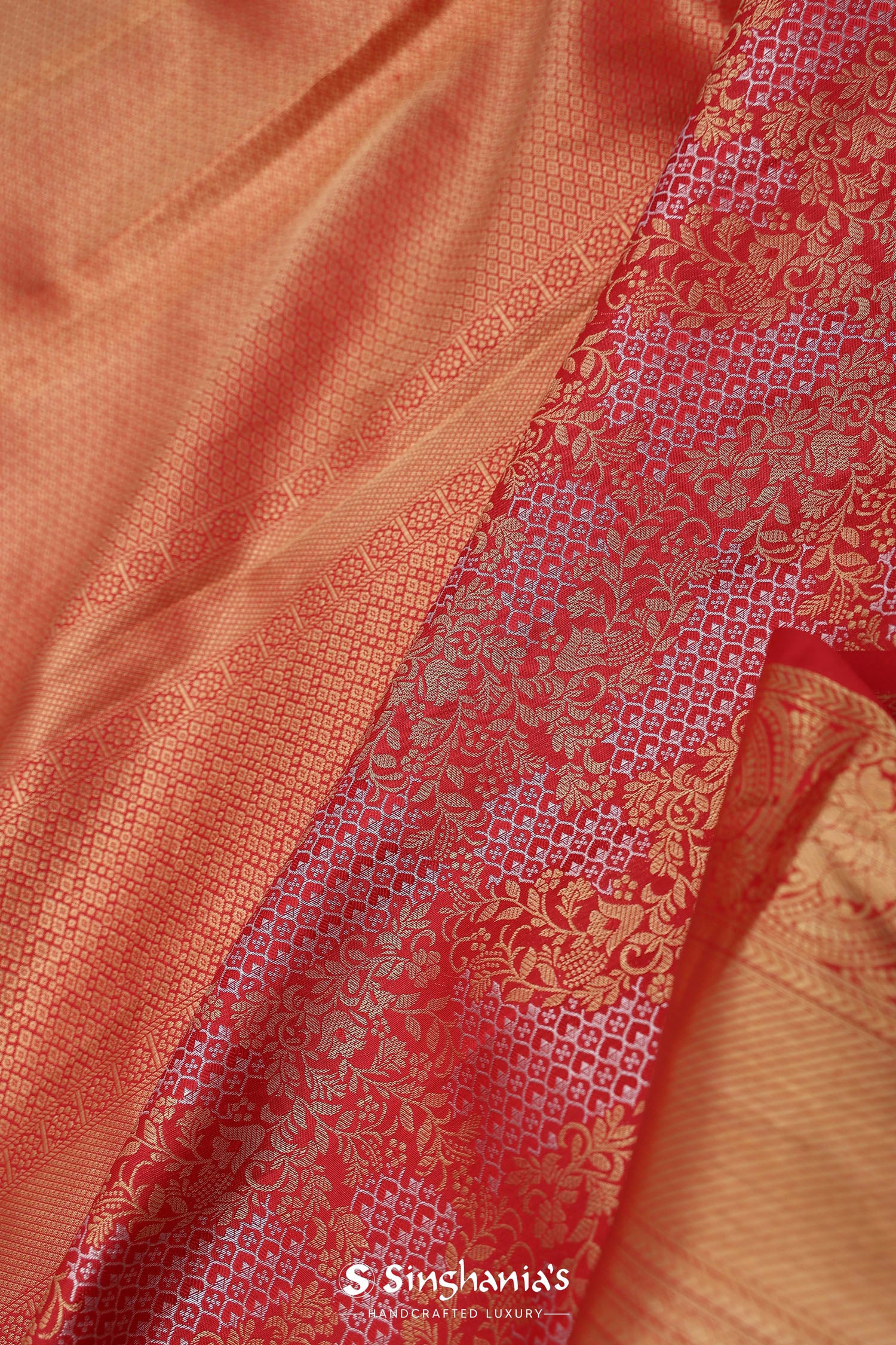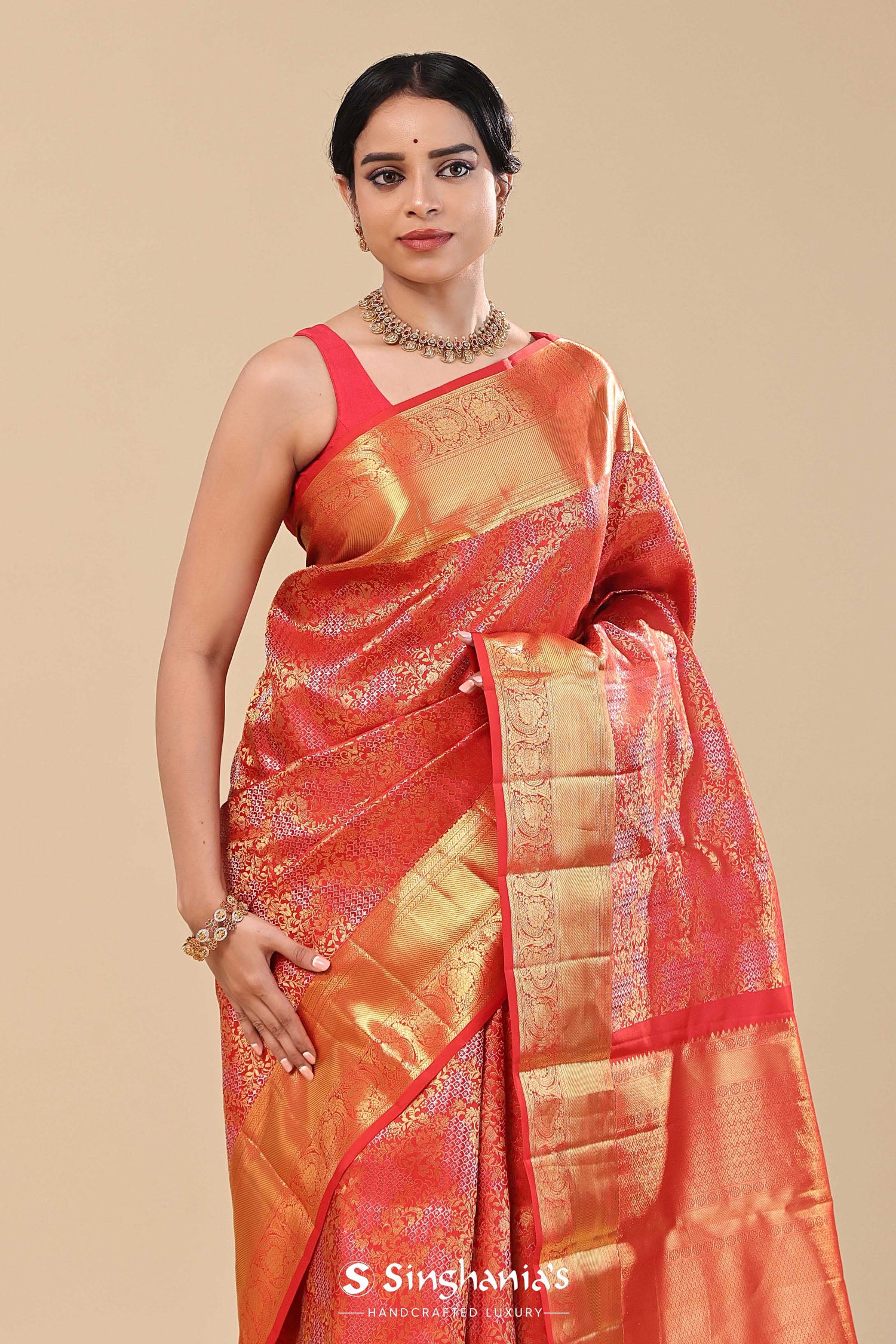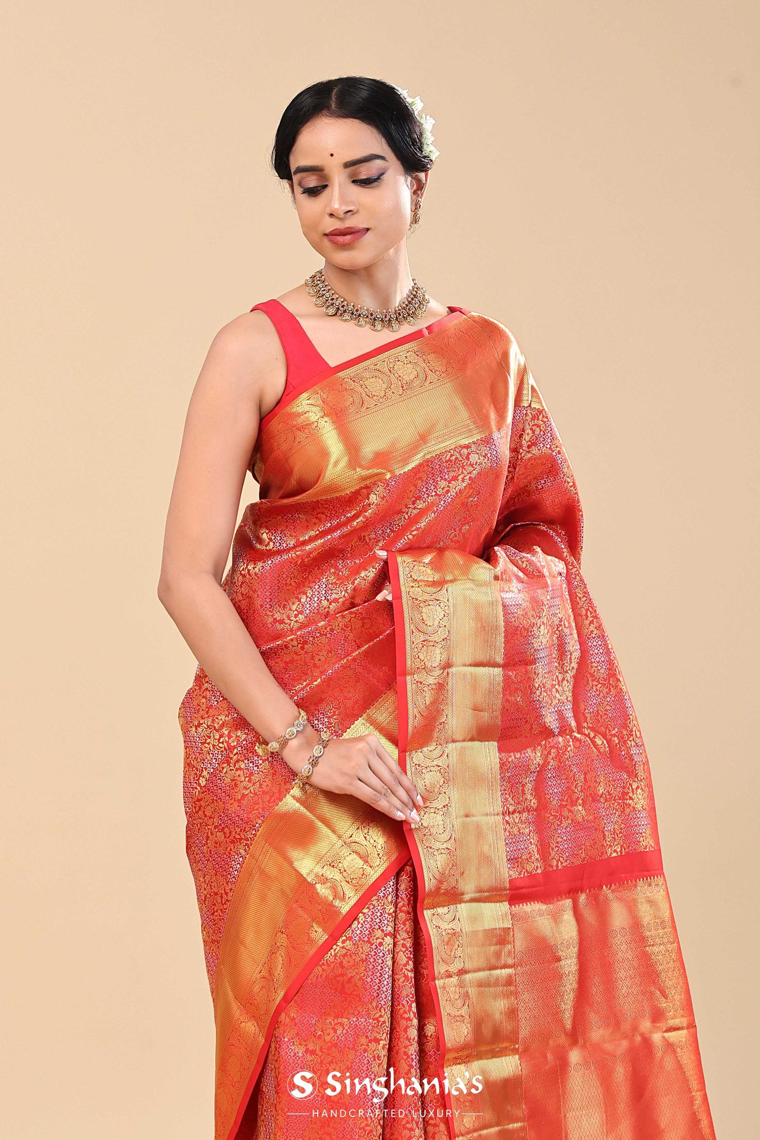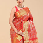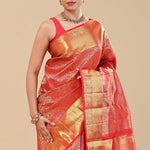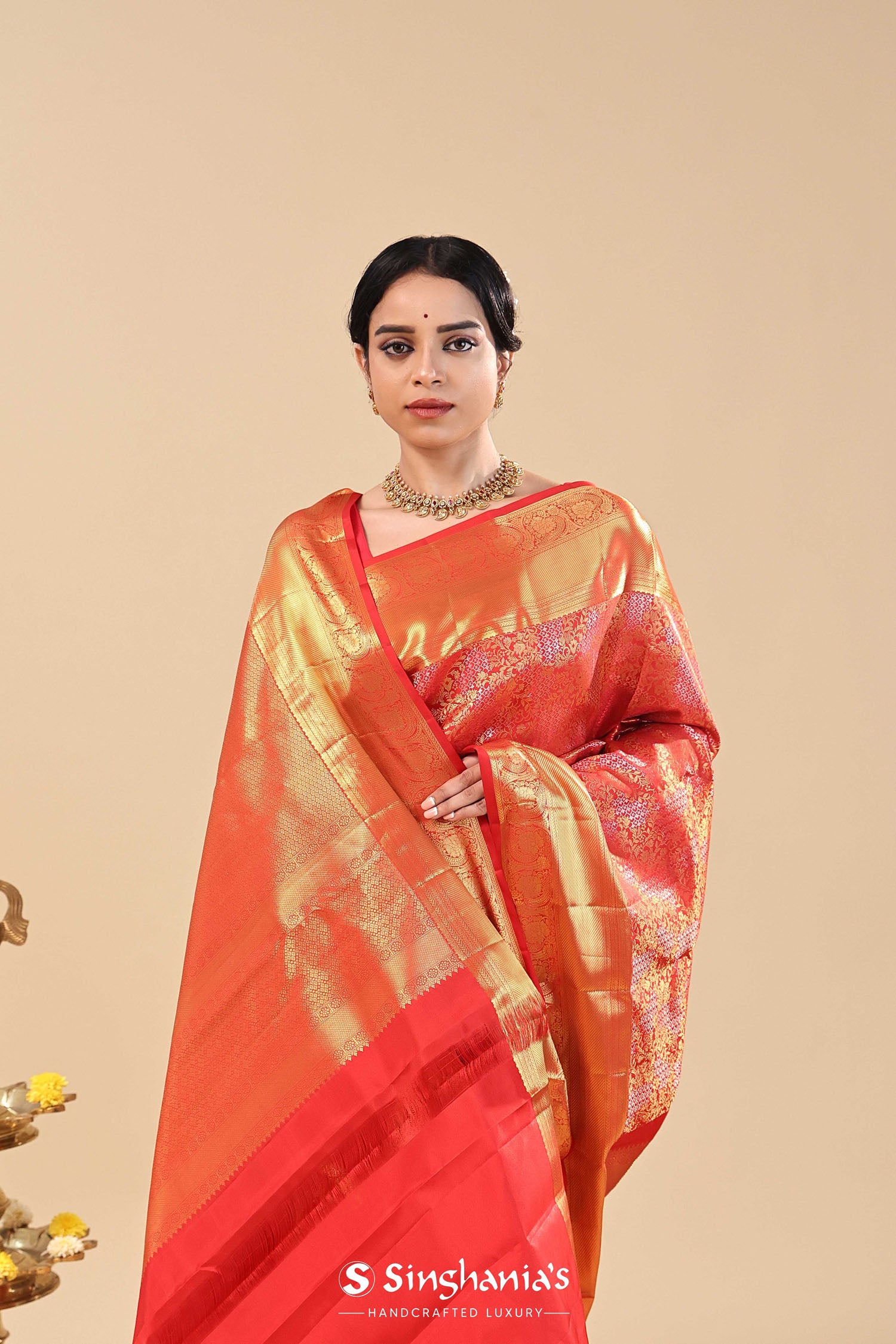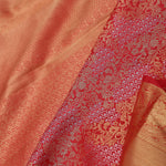 This Vibrant Orange kanjivaram saree with khadi border features intricate floral jaal with gold zari and repeating pattern with silver zari woven on entire body of the saree along with khadi border. Making it look royal and rich for your favourite occasion