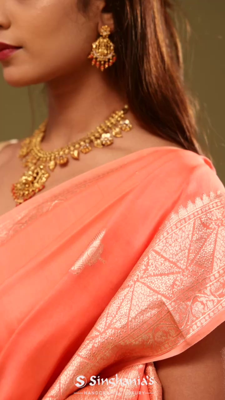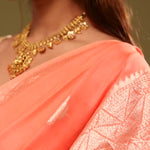 A breezy orange Kota saree with elegant golden zari-woven butta's spread across the saree along with temple border which makes it ideal for daily elegance and carefree ease.