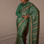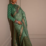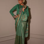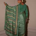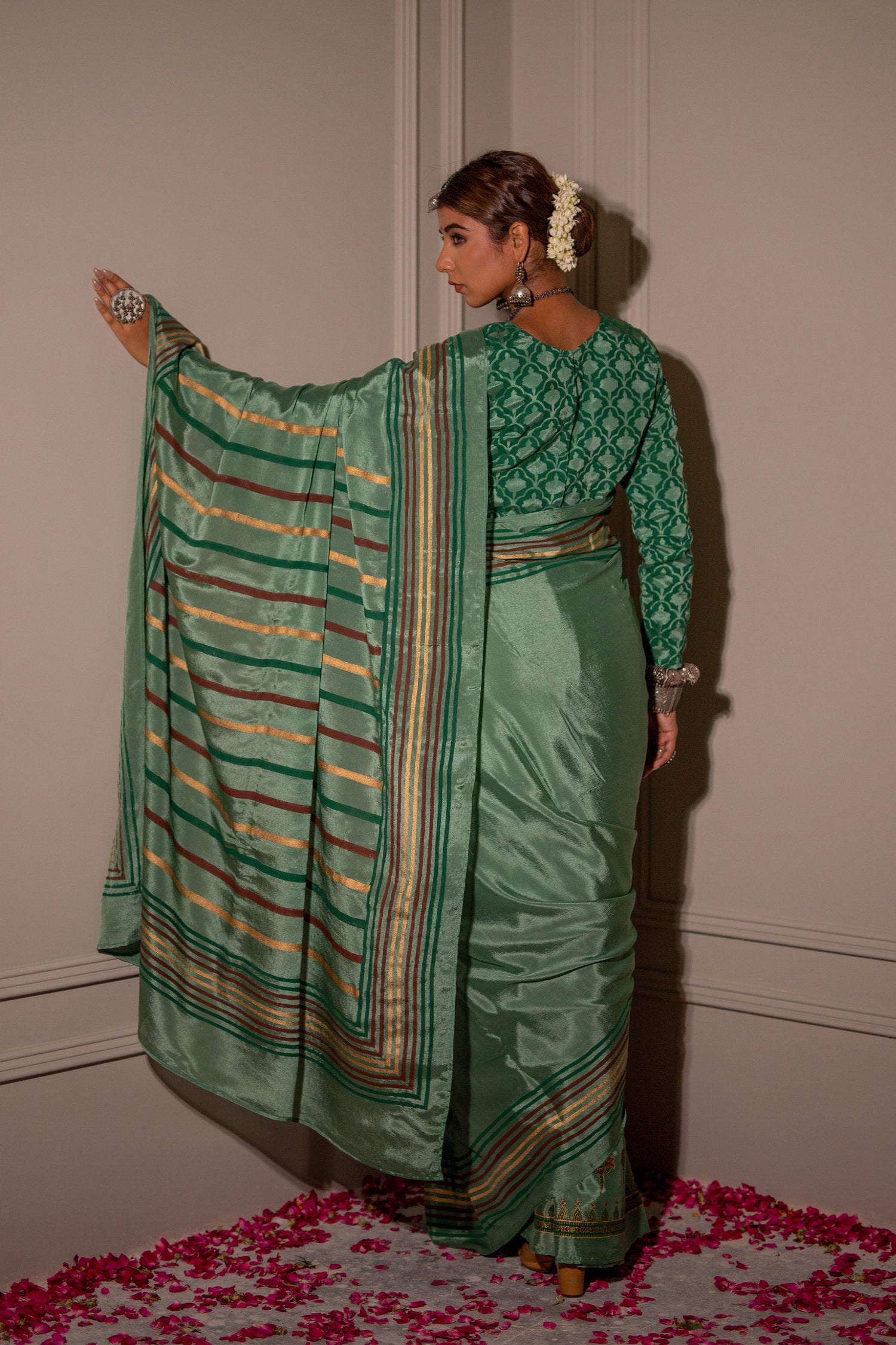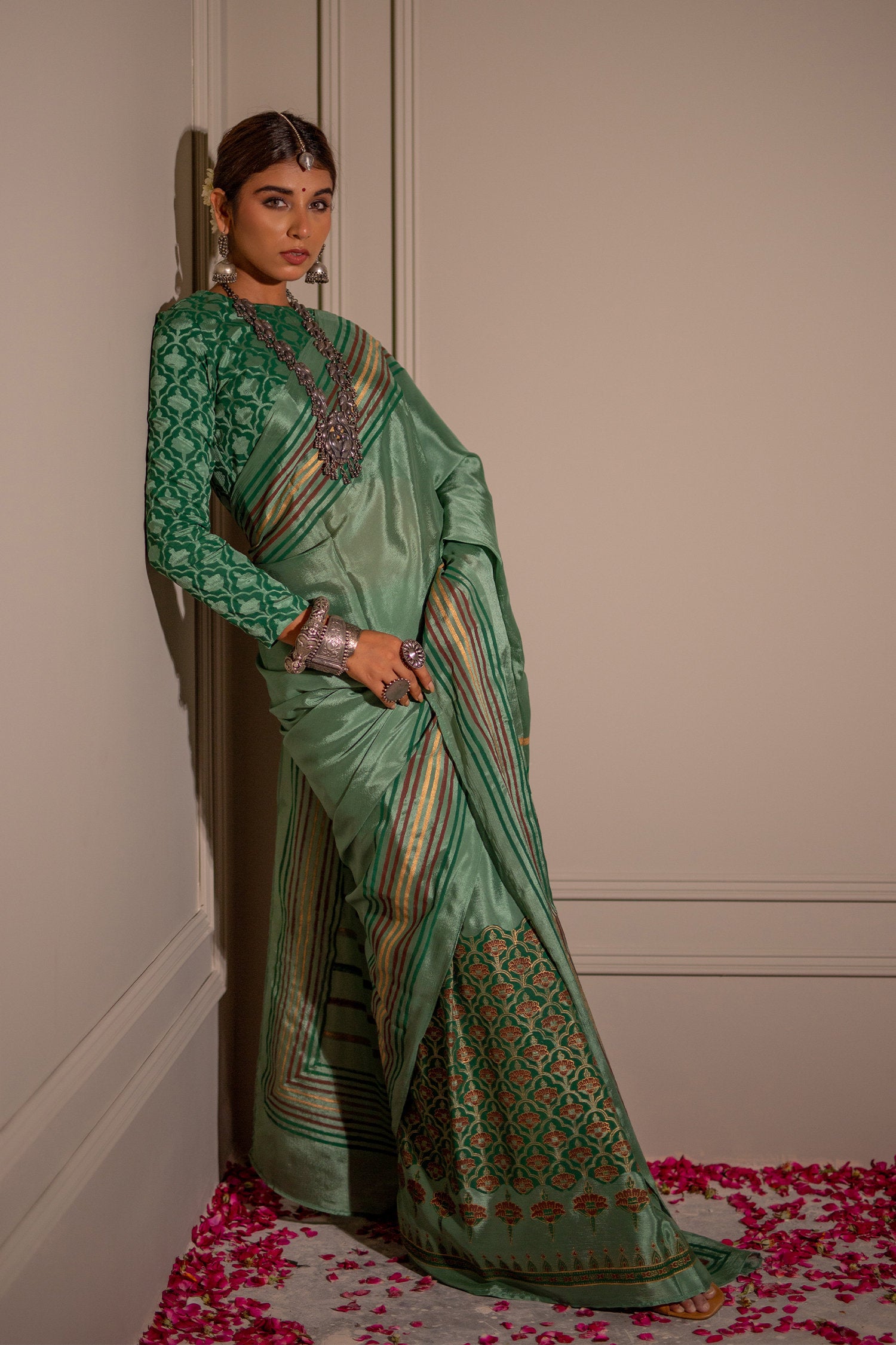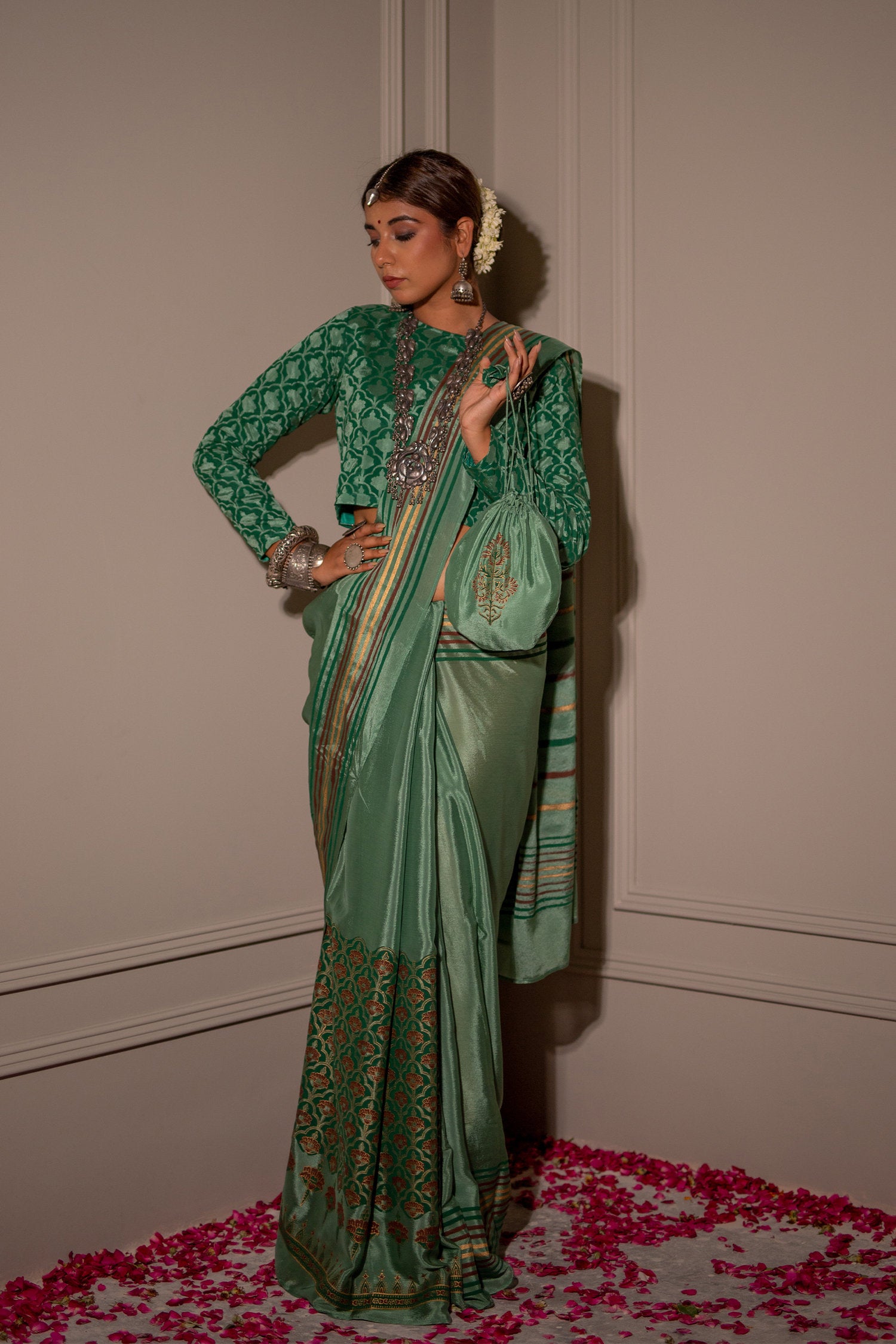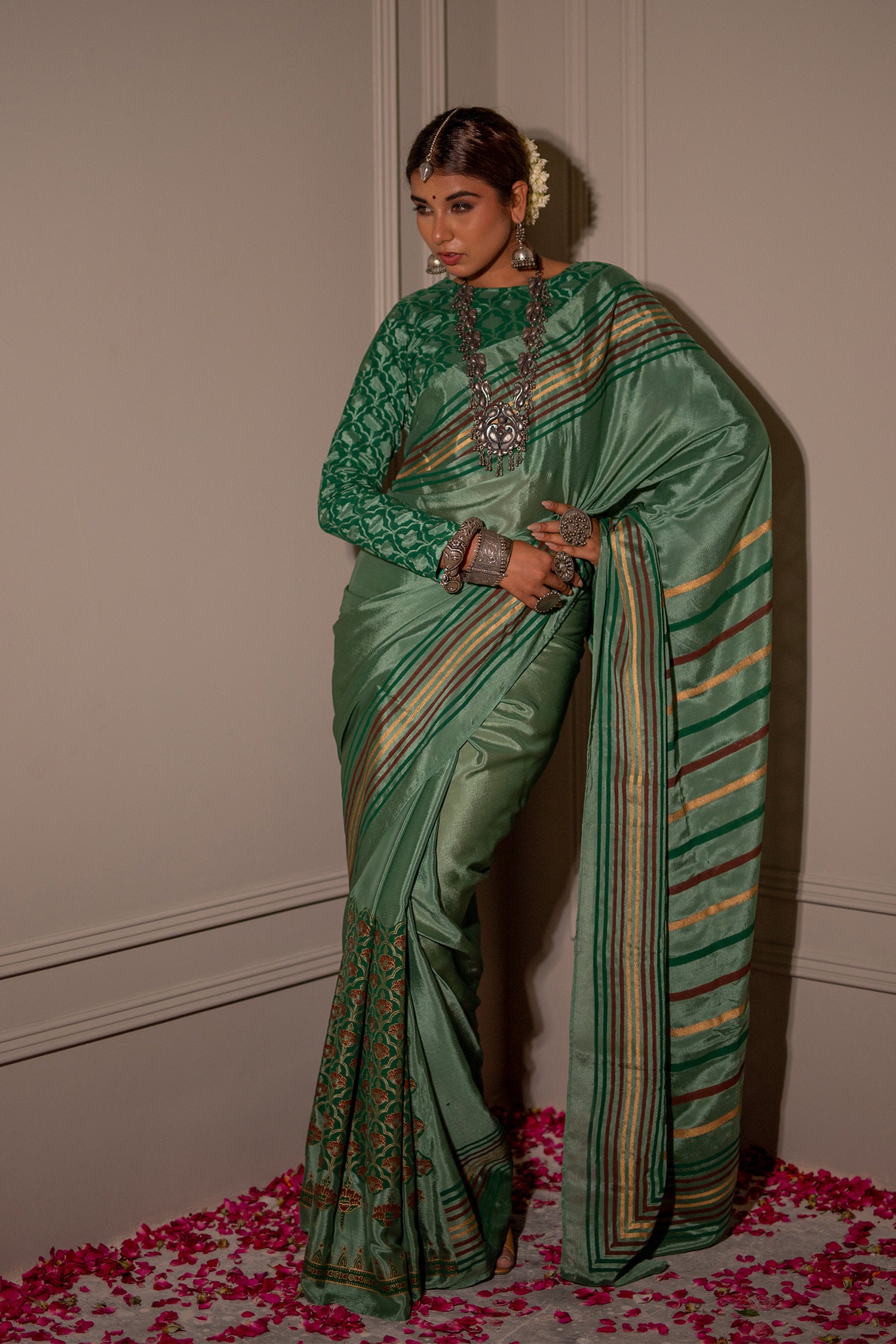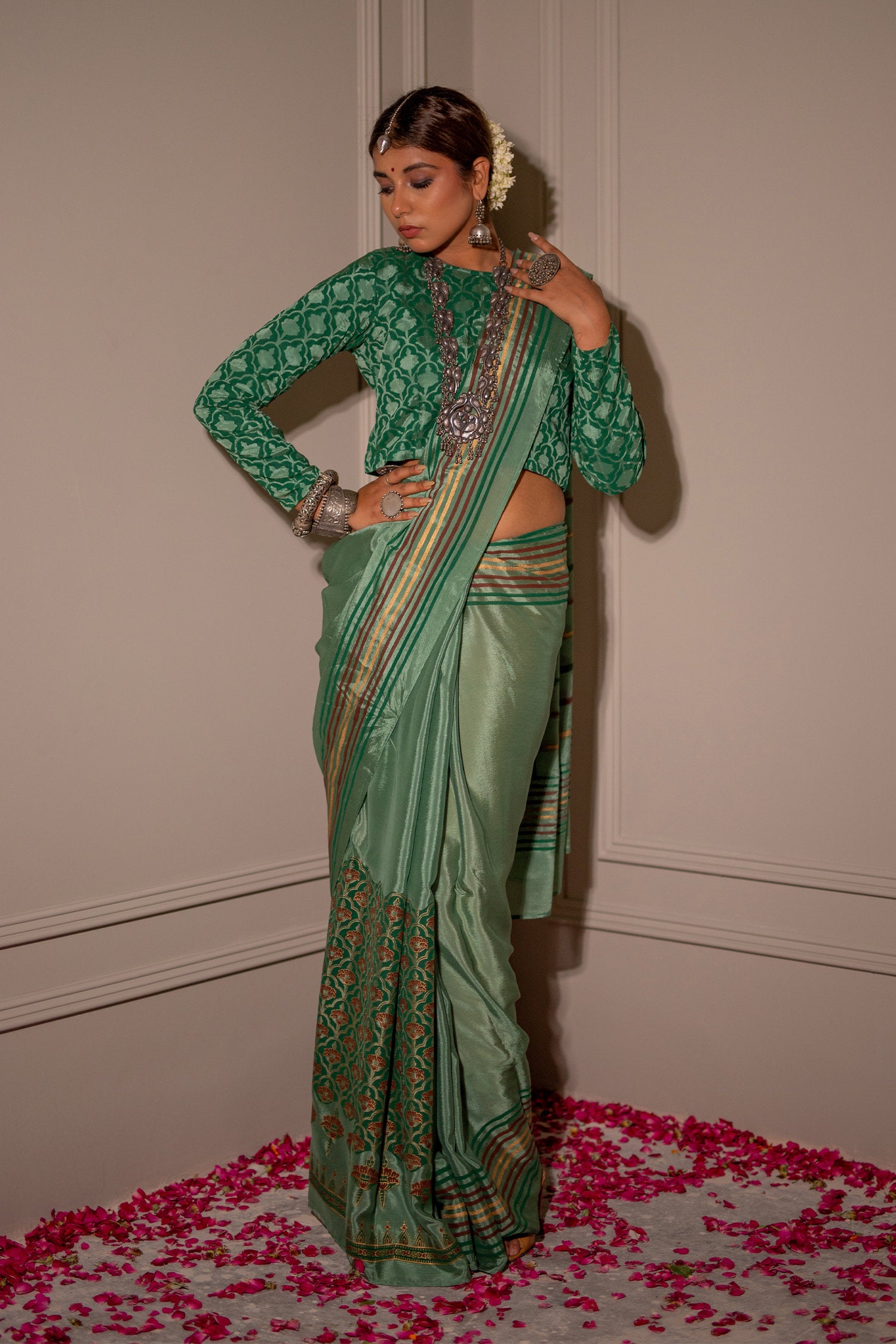 The pastel green hand blocked chinon saree set with chinon blouse for a beautiful look combined with style and tradition.