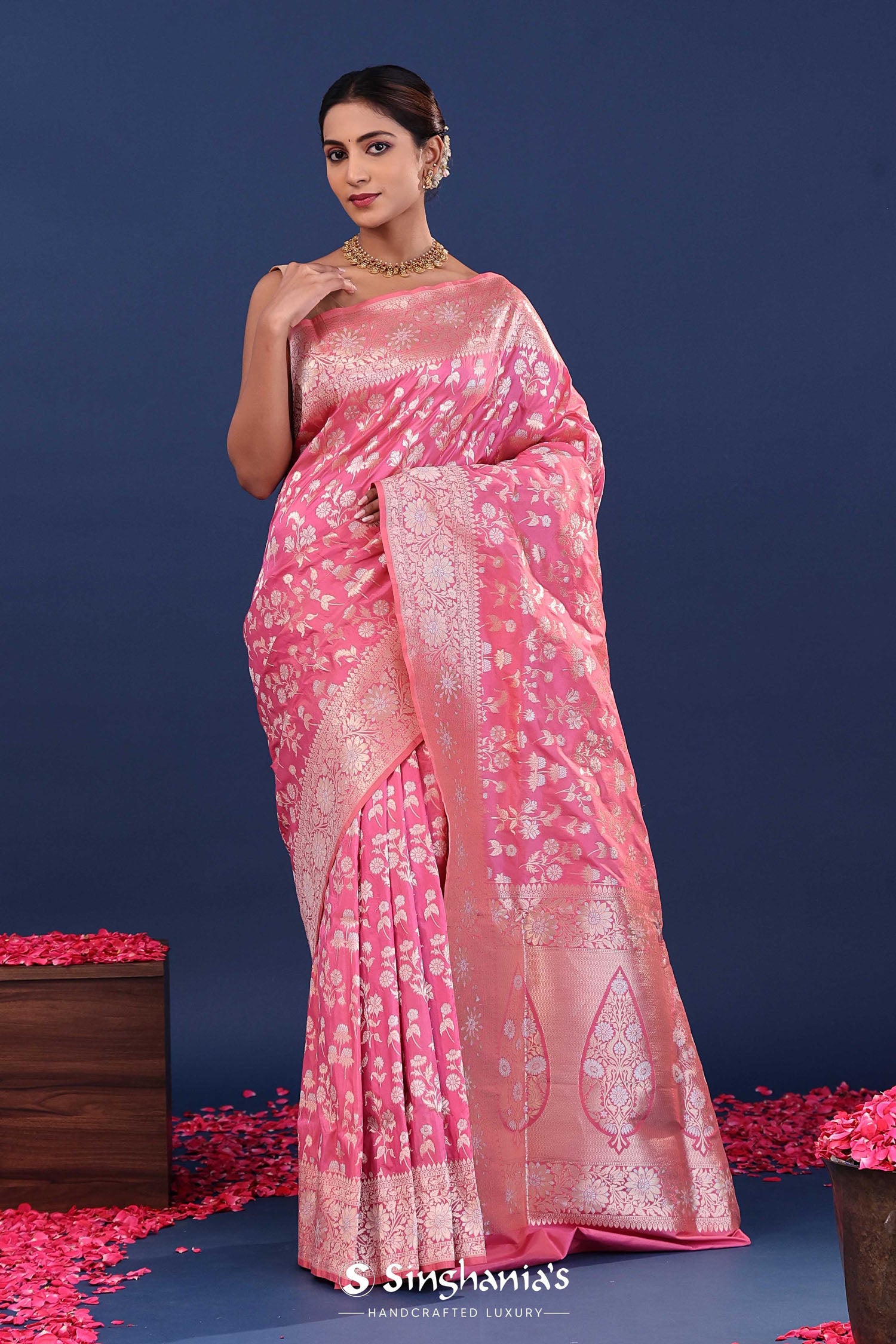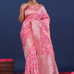 Raspberry rose banarasi saree features floral jaal woven with zari spread across the body along with floral self border is a ideal choice for any occasion.Making you satisfy with each drape.