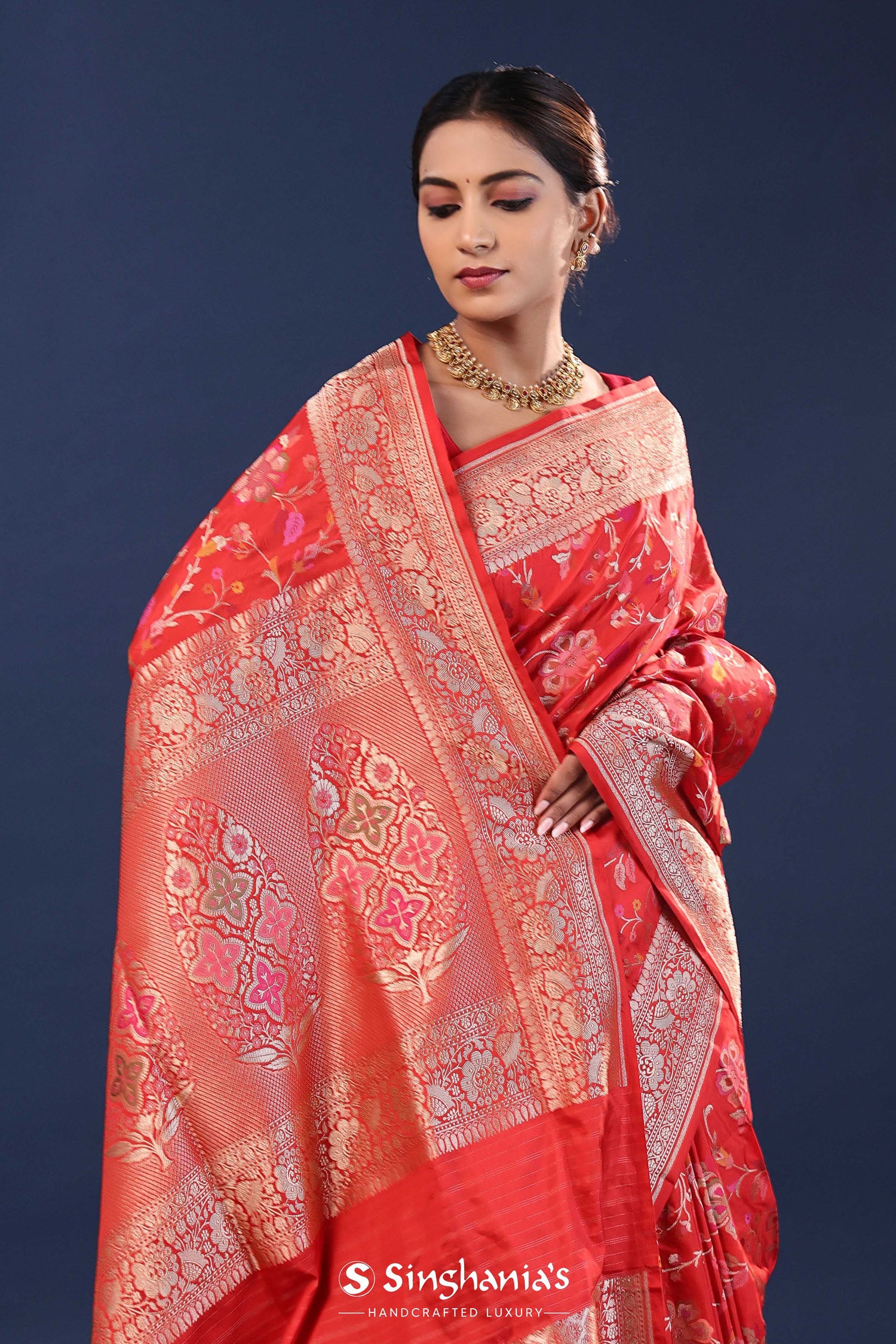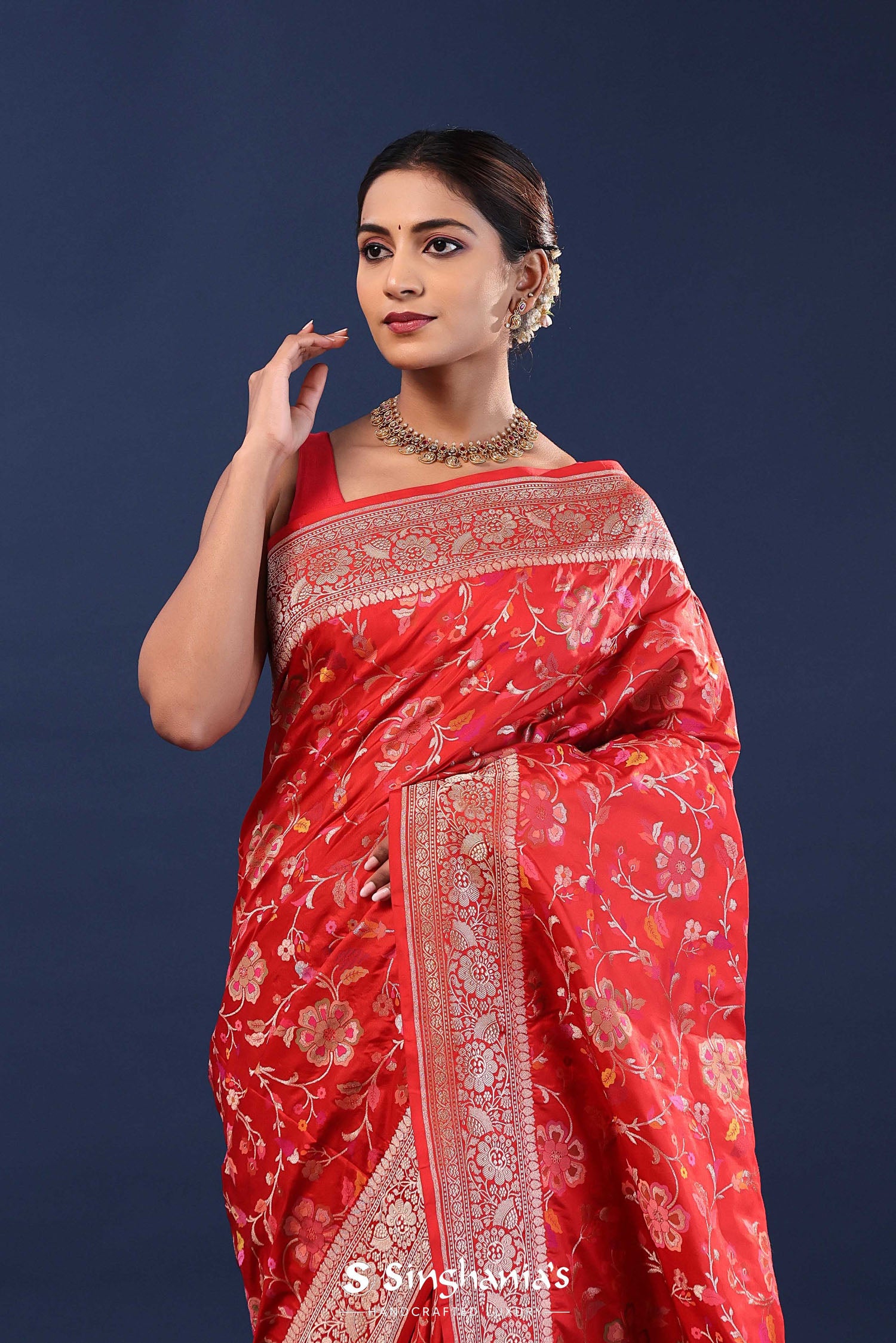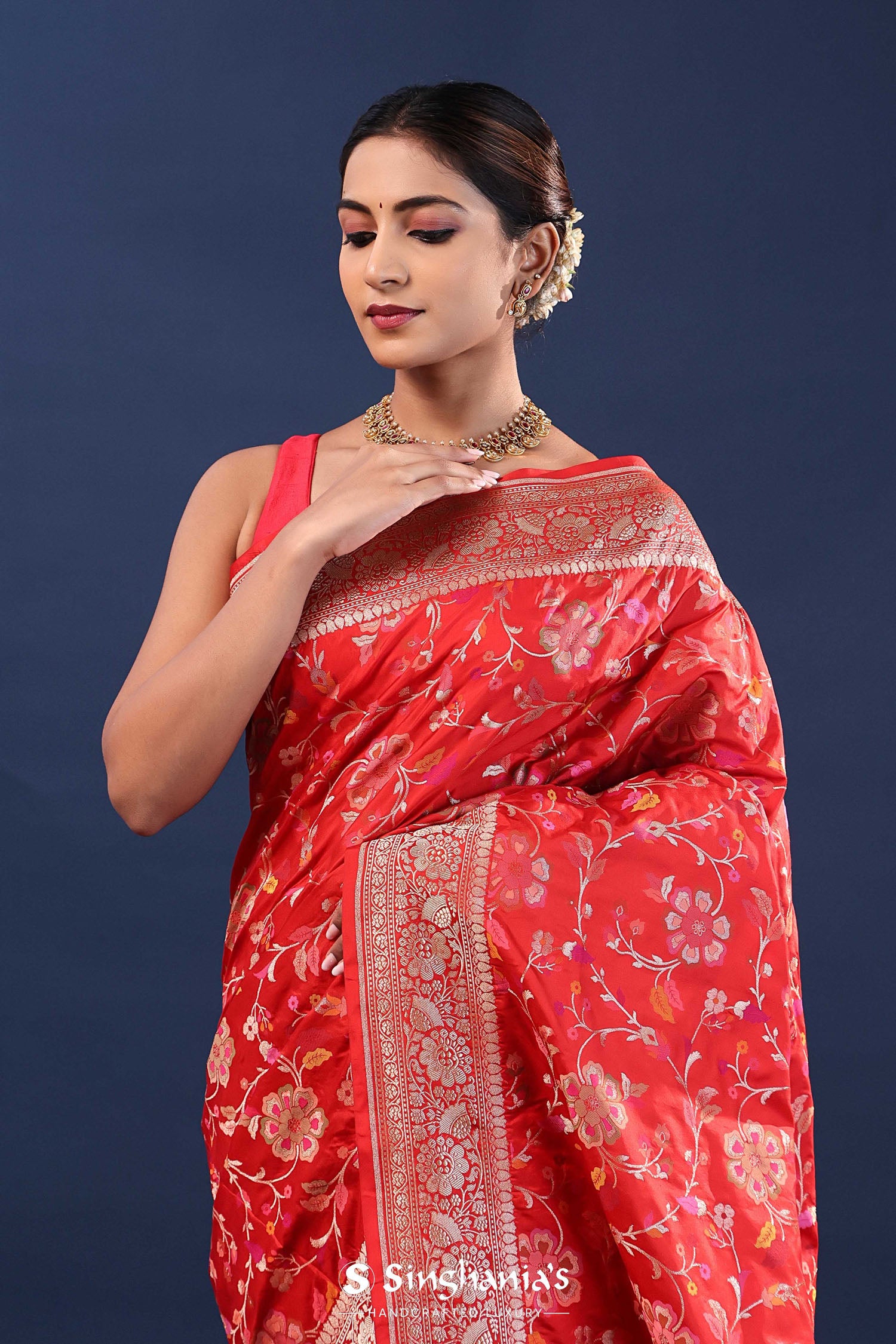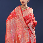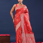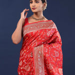 Red banarasi saree features meenakari floral design woven on entire body along with floral border with gold zari adds the finishing touch