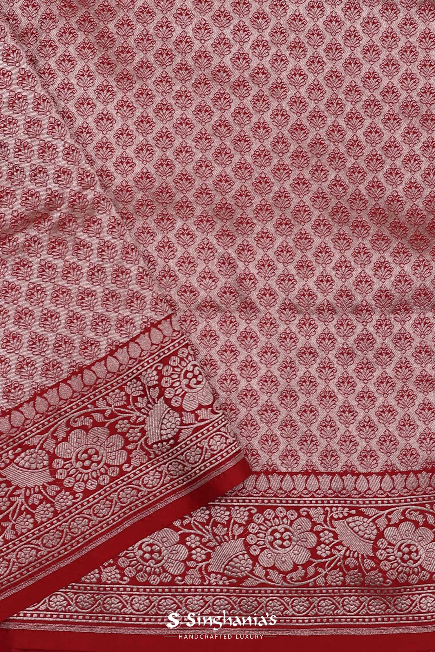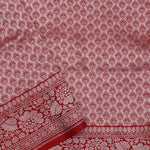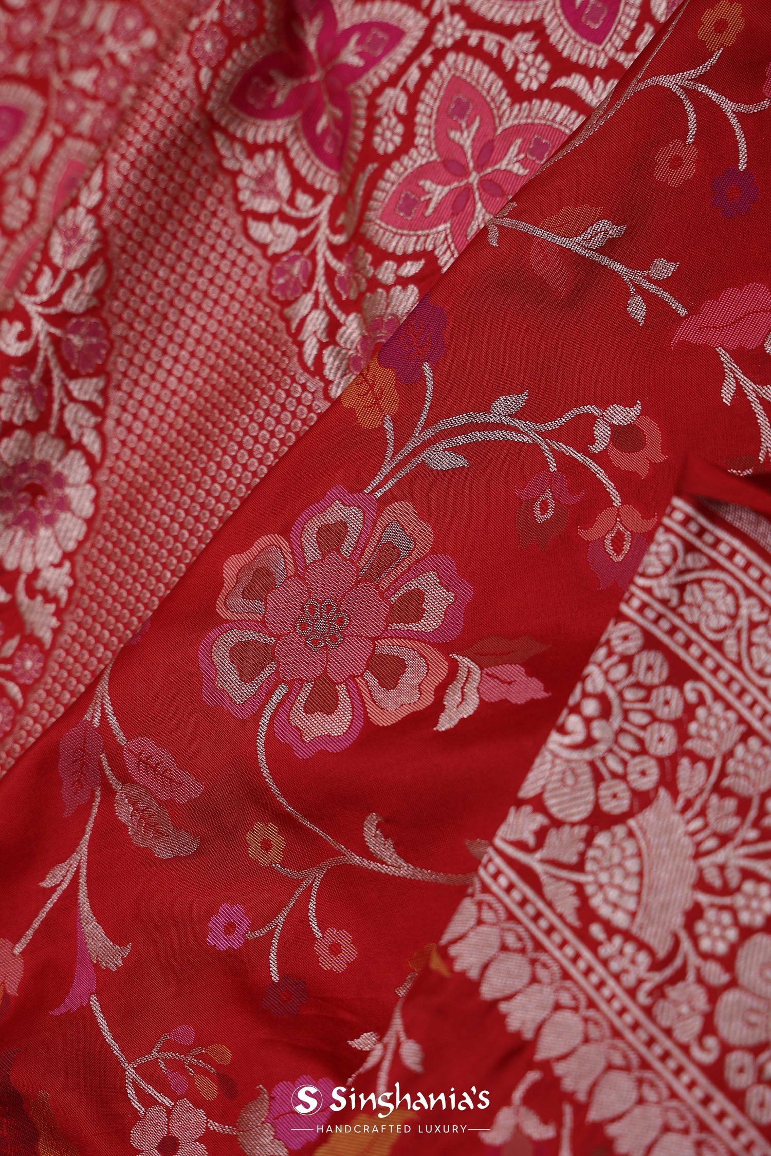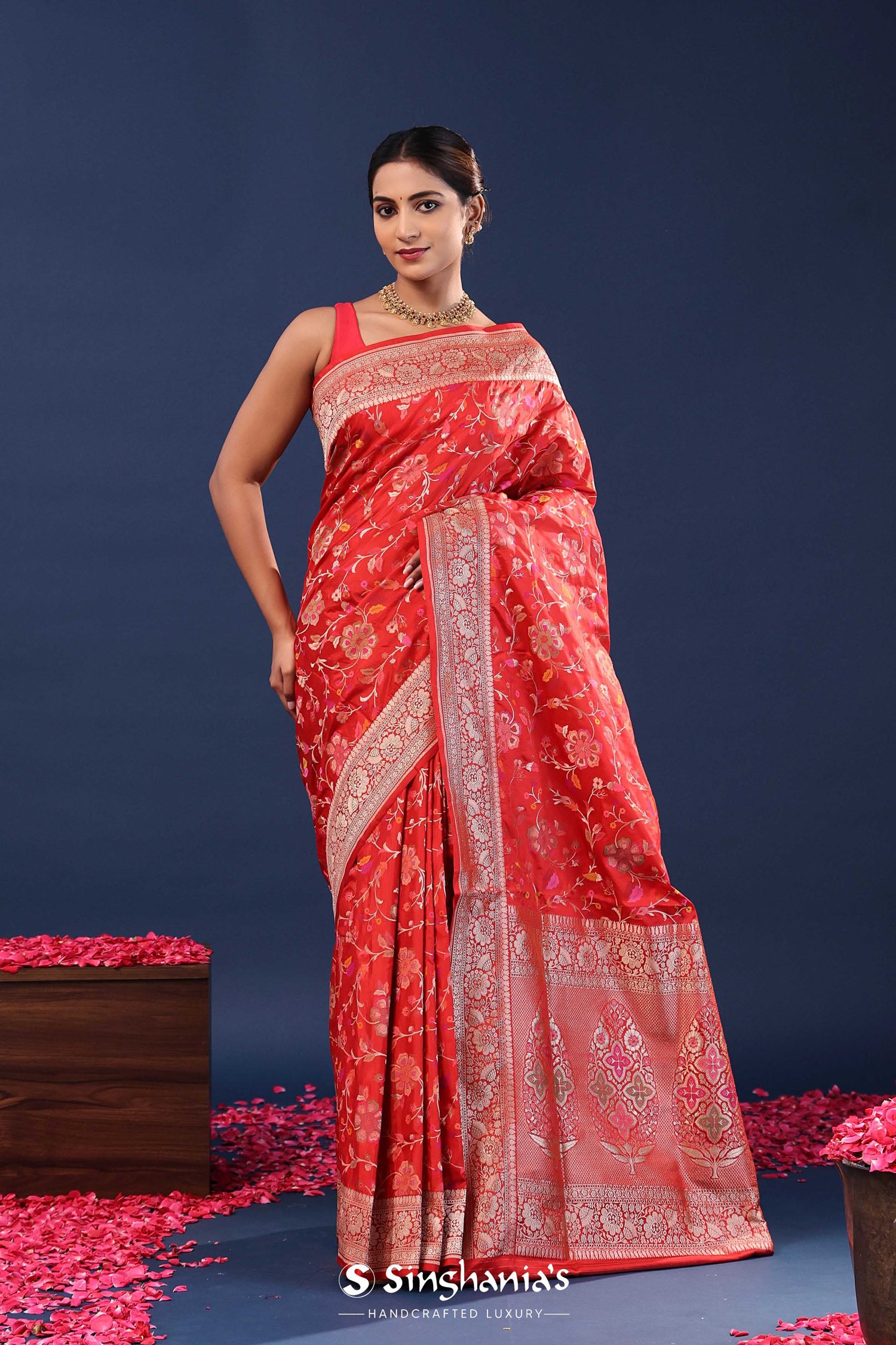 Red banarasi saree features meenakari floral design woven on entire body along with floral border with gold zari adds the finishing touch