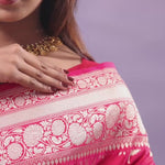 Red banarasi silk saree is decorated with self weaving and jaal design woven by gold zari throughout the fabric , which results in adding a shimmer appearance which reflects royal and timeless look.