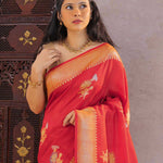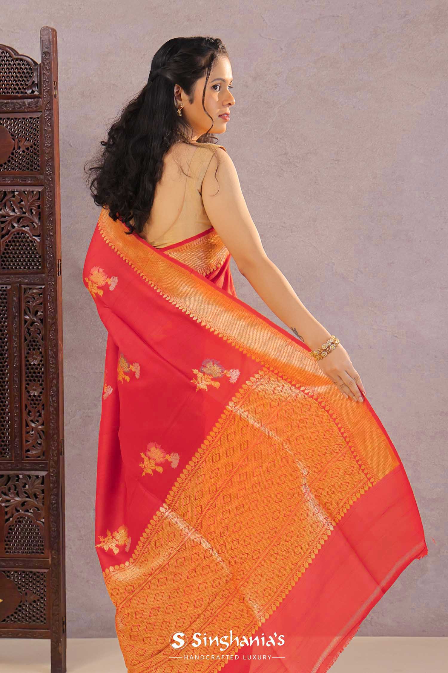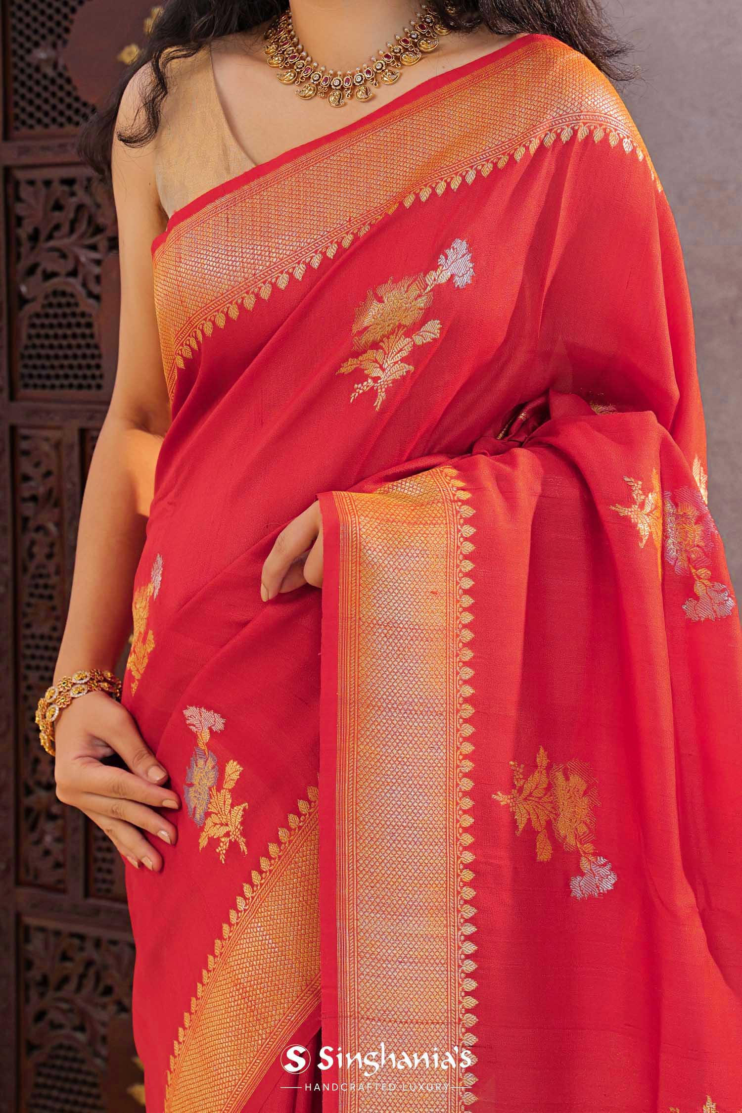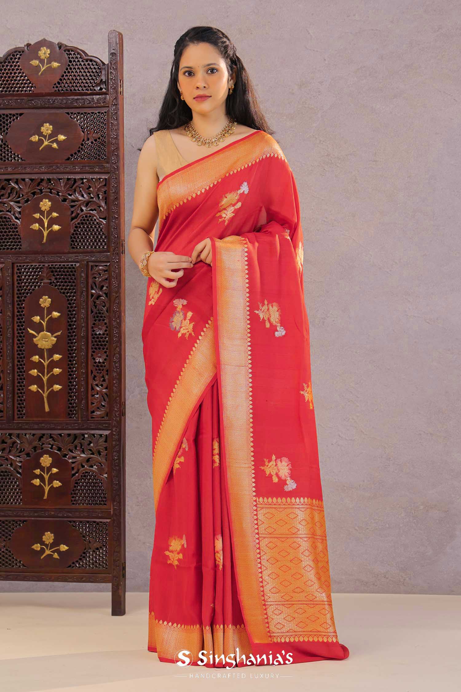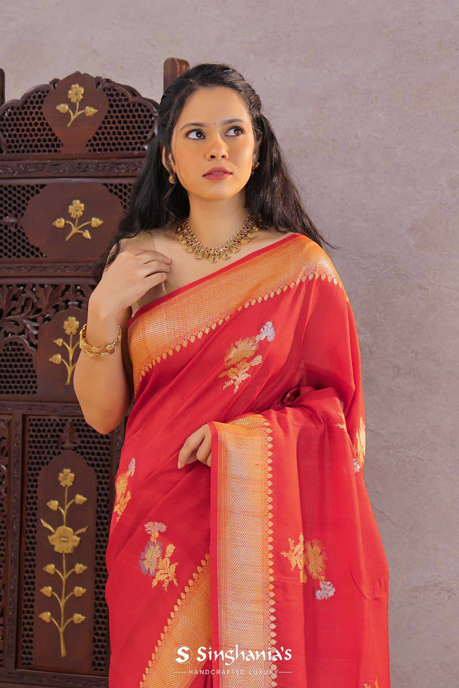 This Red munga tussar saree reflects grace and sophistication by the colour and the butta's woven on fabric , adds extra charm to the overall look of the saree .Which is the perfect blend of traditional and contemporary style.