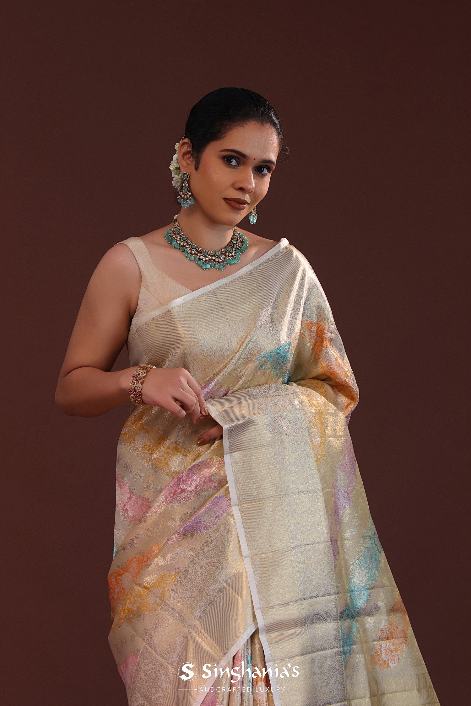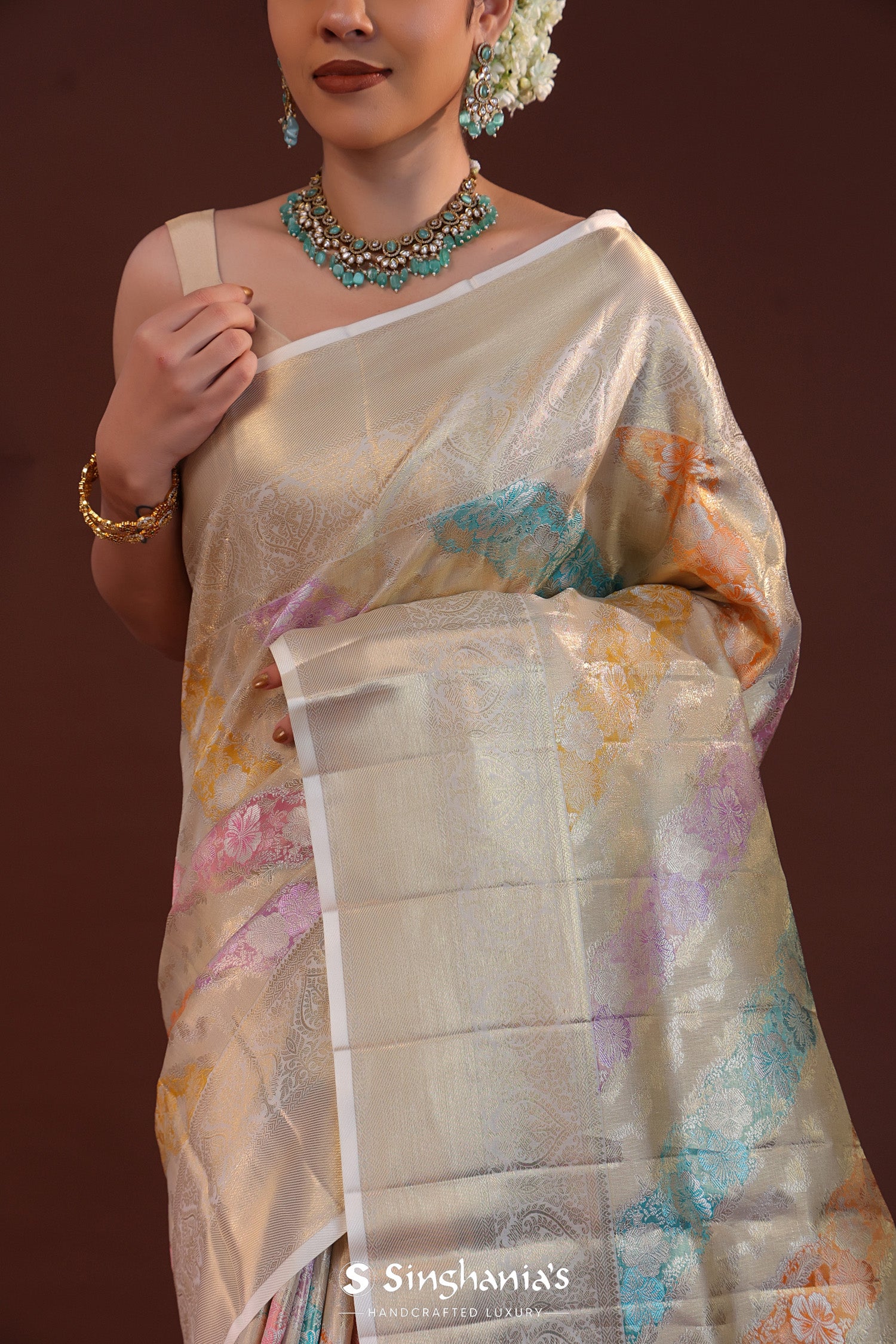 Silver kanjivaram tissue saree features floral woven patterns along with rangkat design complemented with silver zari border and unstitched blouse