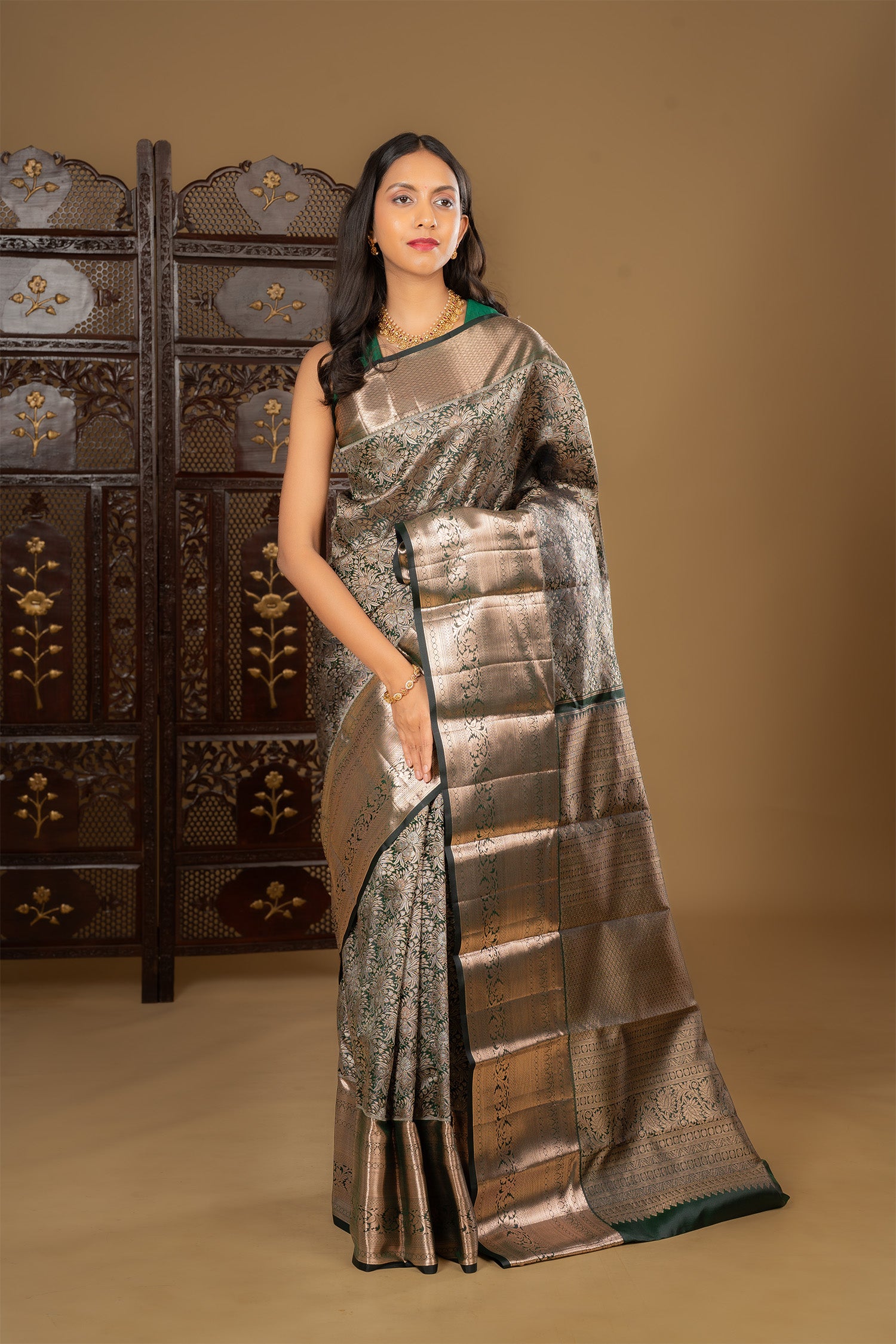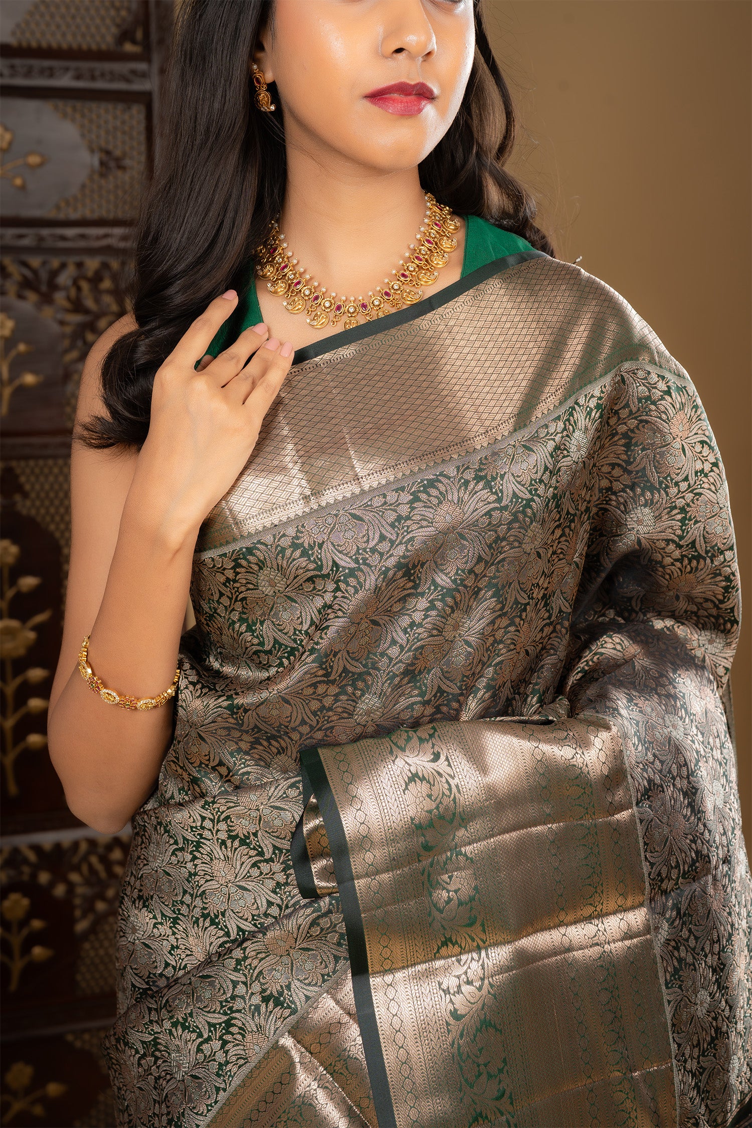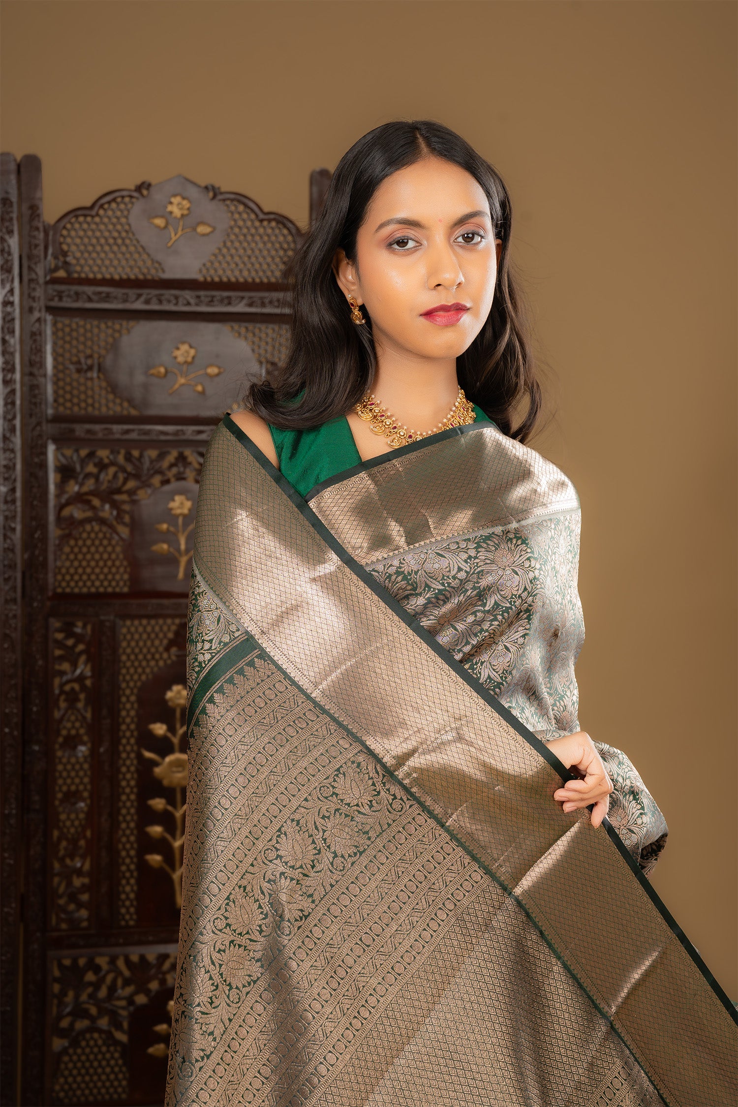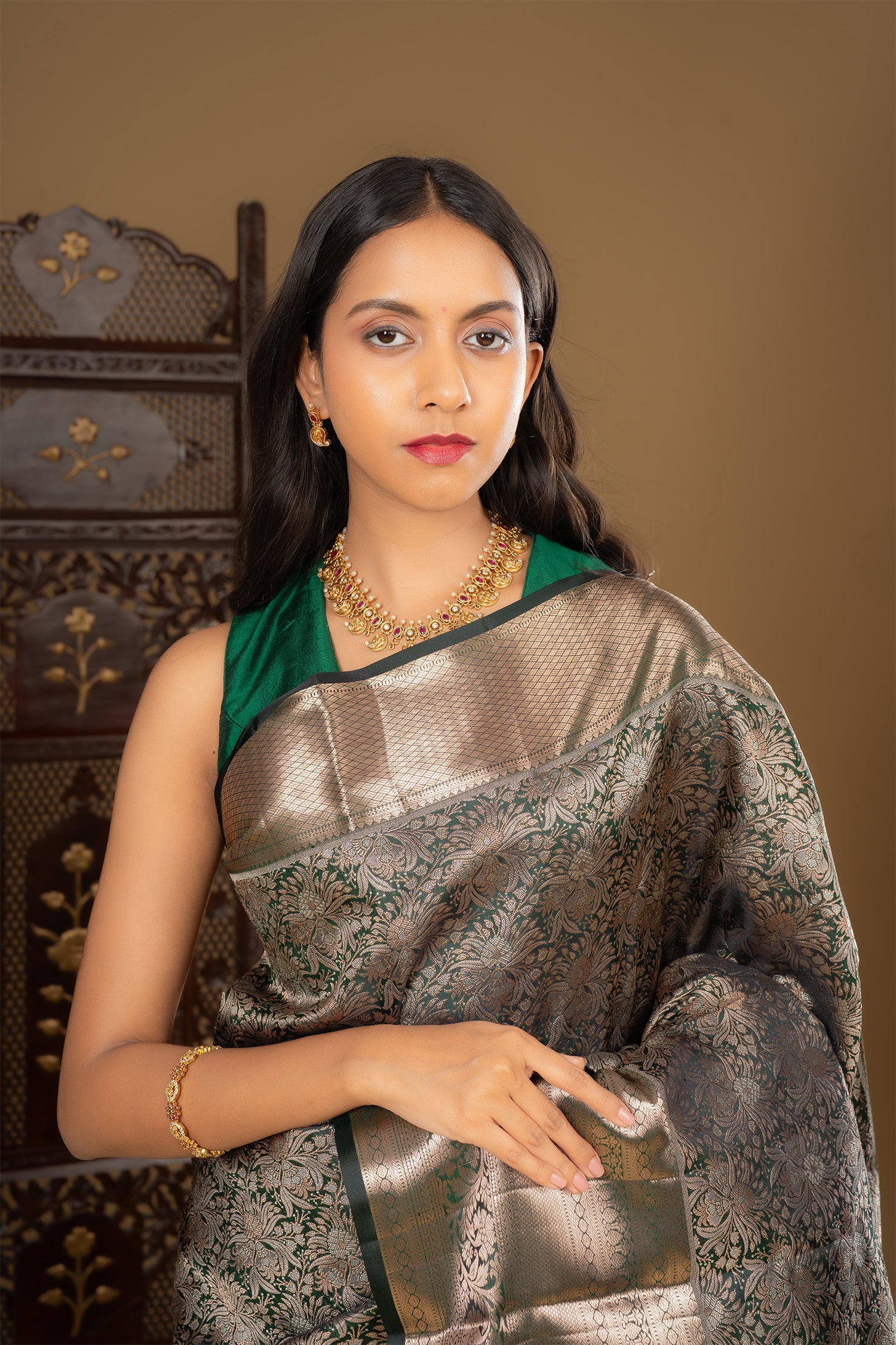 The silver tone dark green kanjivaram silk saree with rich gold and silver zari floral design all over with self border for an elegant look with grace.