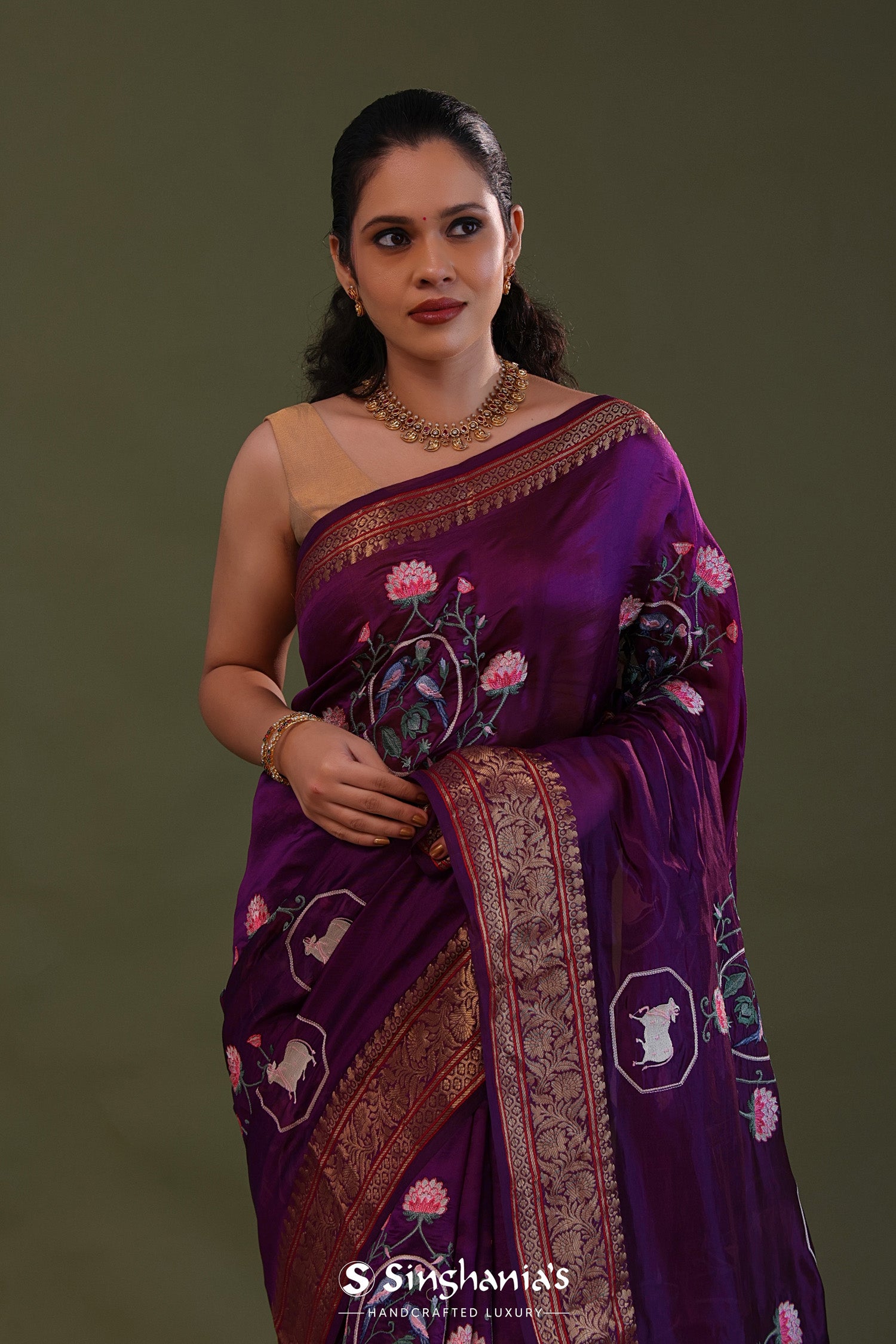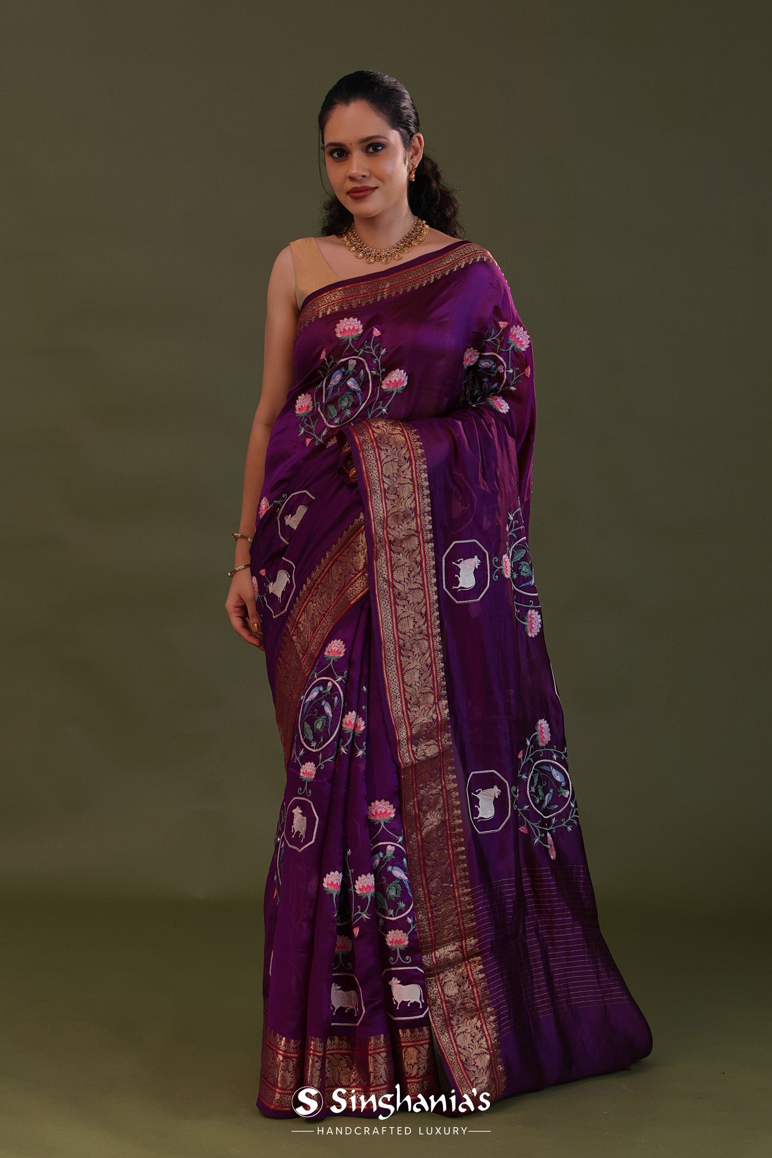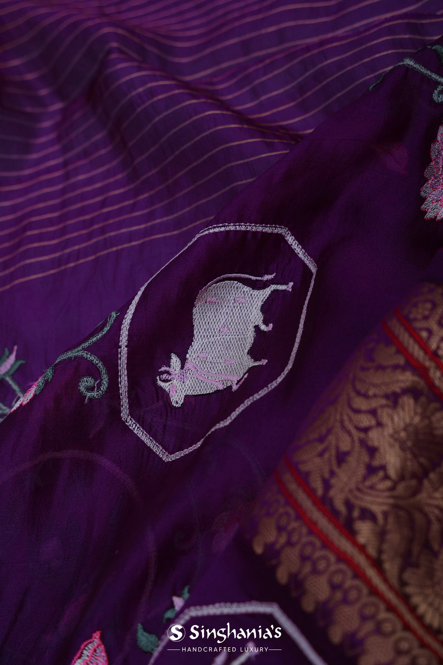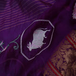 The embroidery work forming lotus , pichwai and avian figures scattered all over the body of the Very dark violet soft chanderi silk saree complemented with unstitched blouse