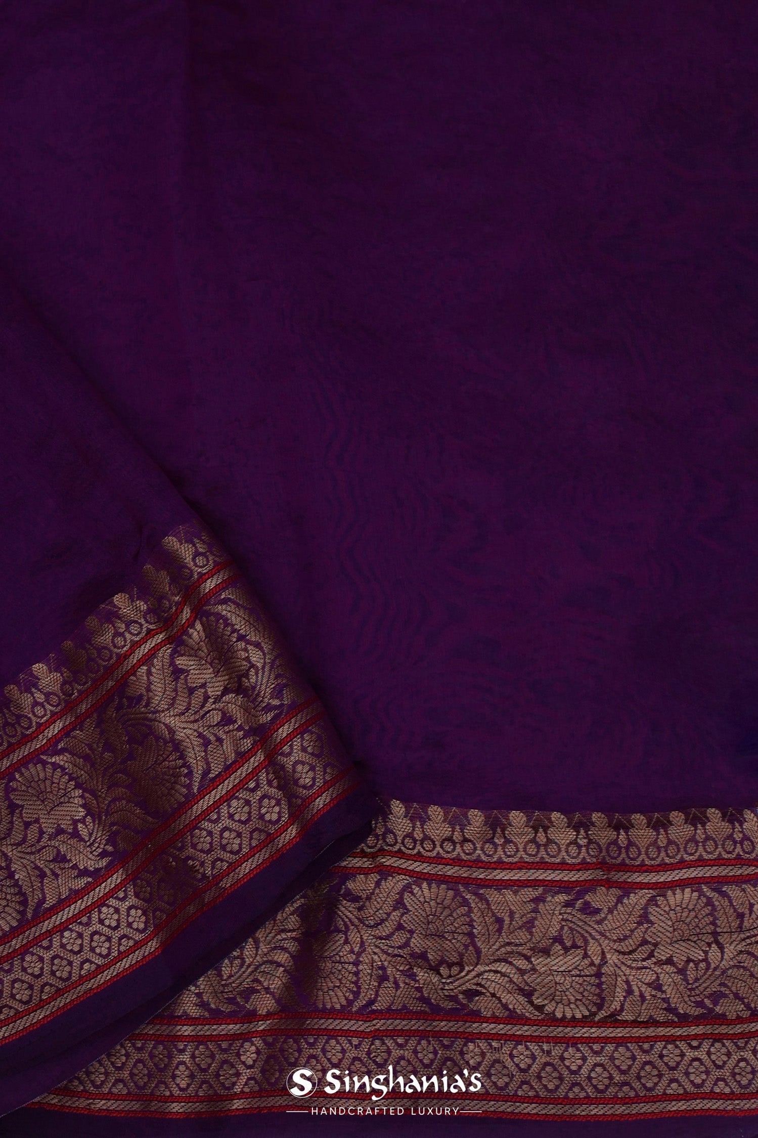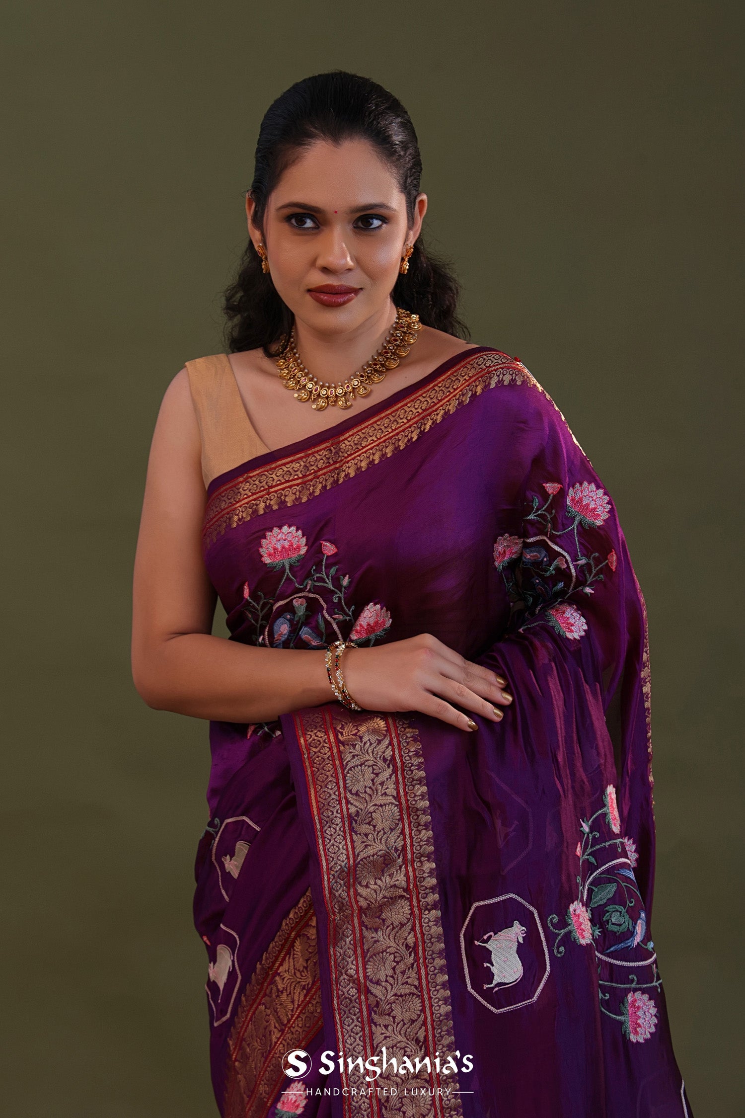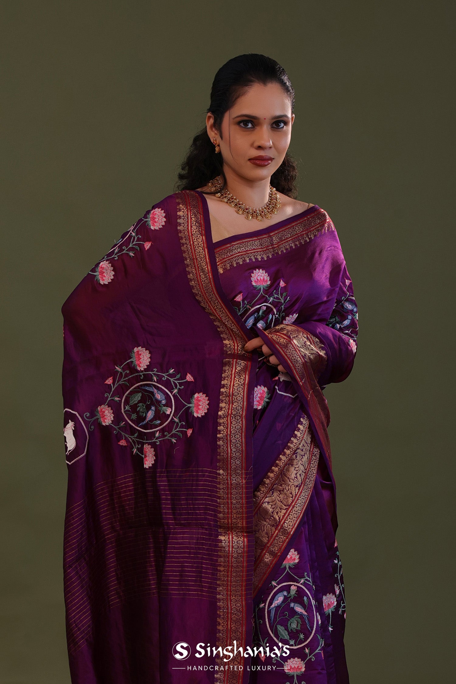 The embroidery work forming lotus , pichwai and avian figures scattered all over the body of the Very dark violet soft chanderi silk saree complemented with unstitched blouse