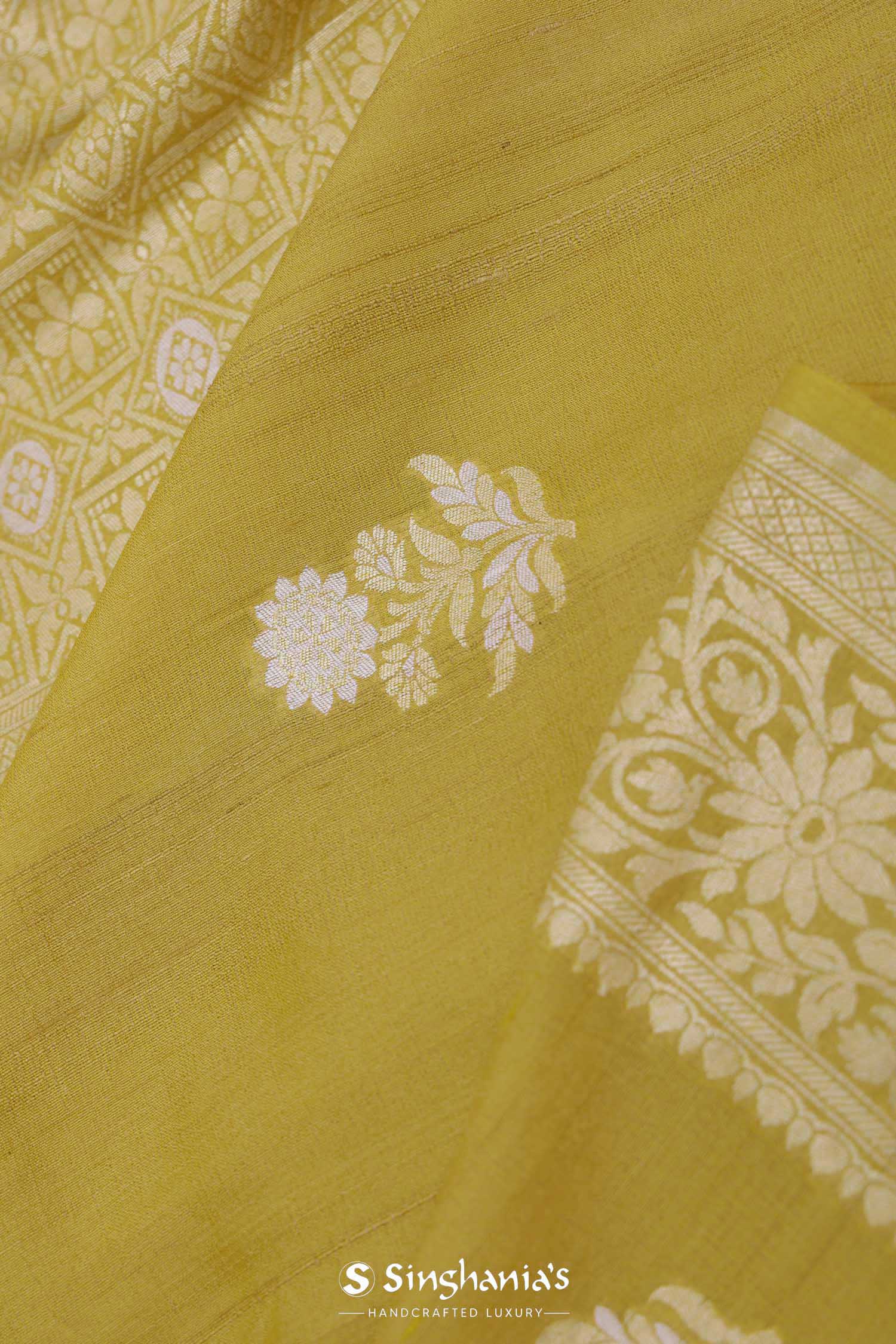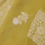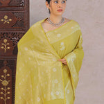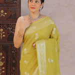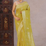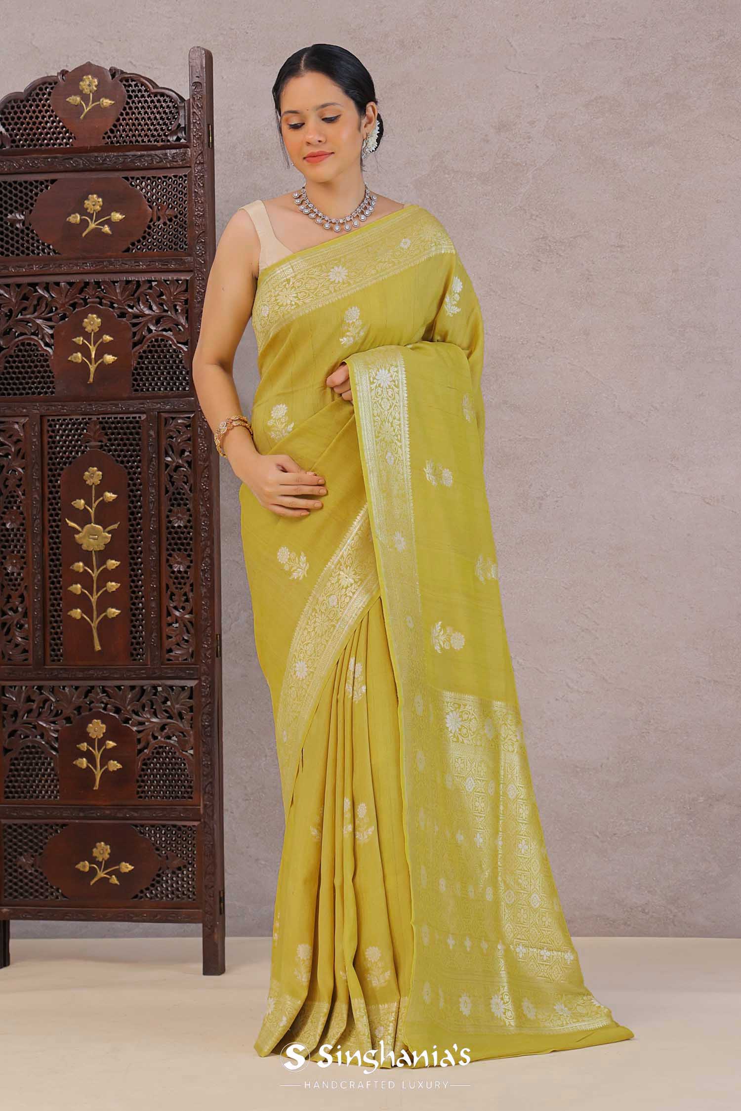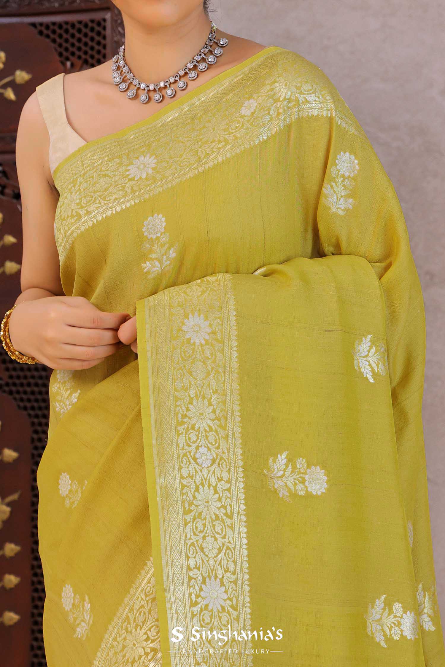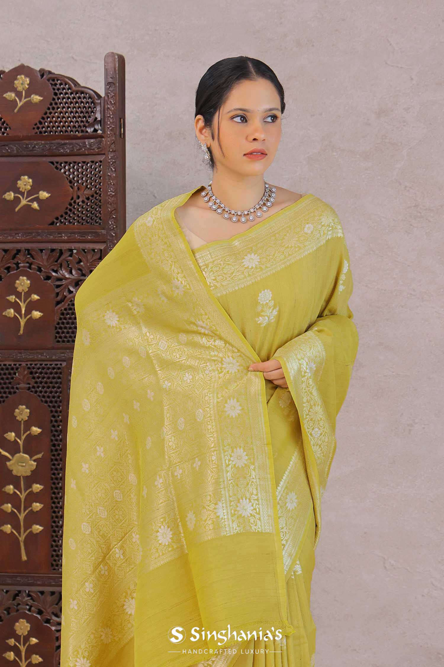 This Warm olive munga tussar saree features floral butti's woven on saree along with floral border which is the perfect blend of traditional and contemporary style.