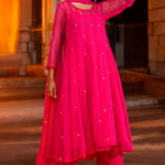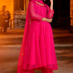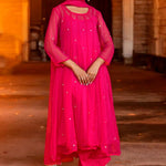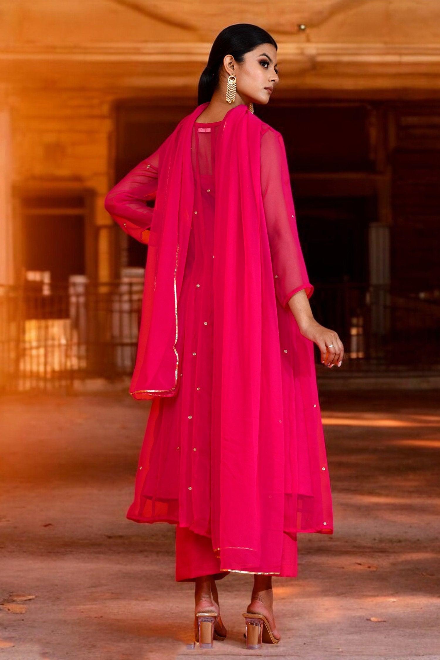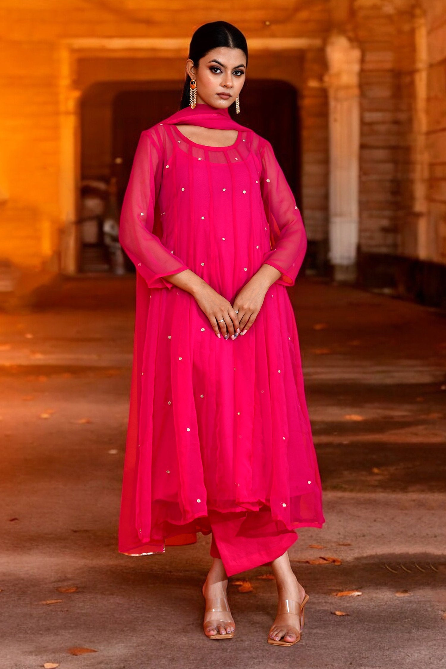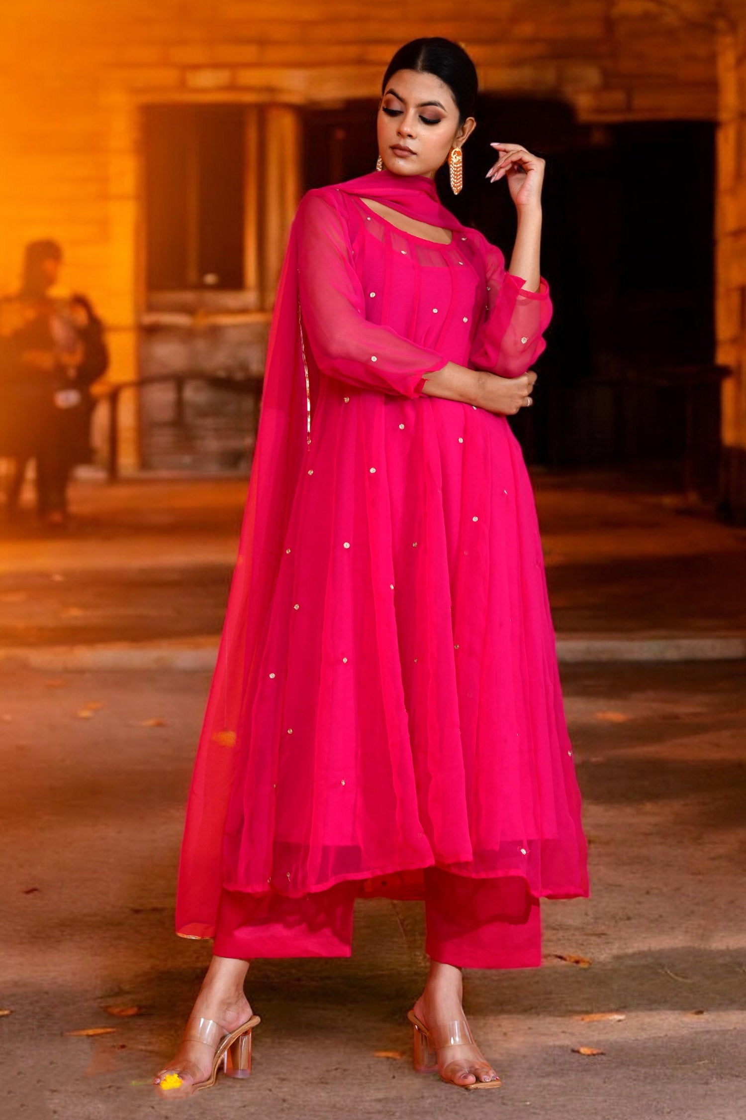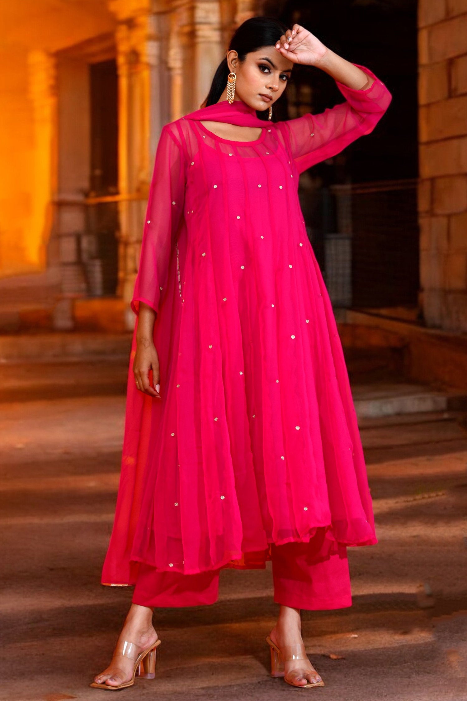 Amaranth pink georgette anarkali set features round neckline and sleeves upto mid-forearm length along with matching dupatta and pants making it best choice for formal and informal events