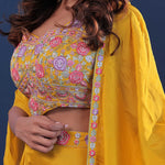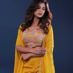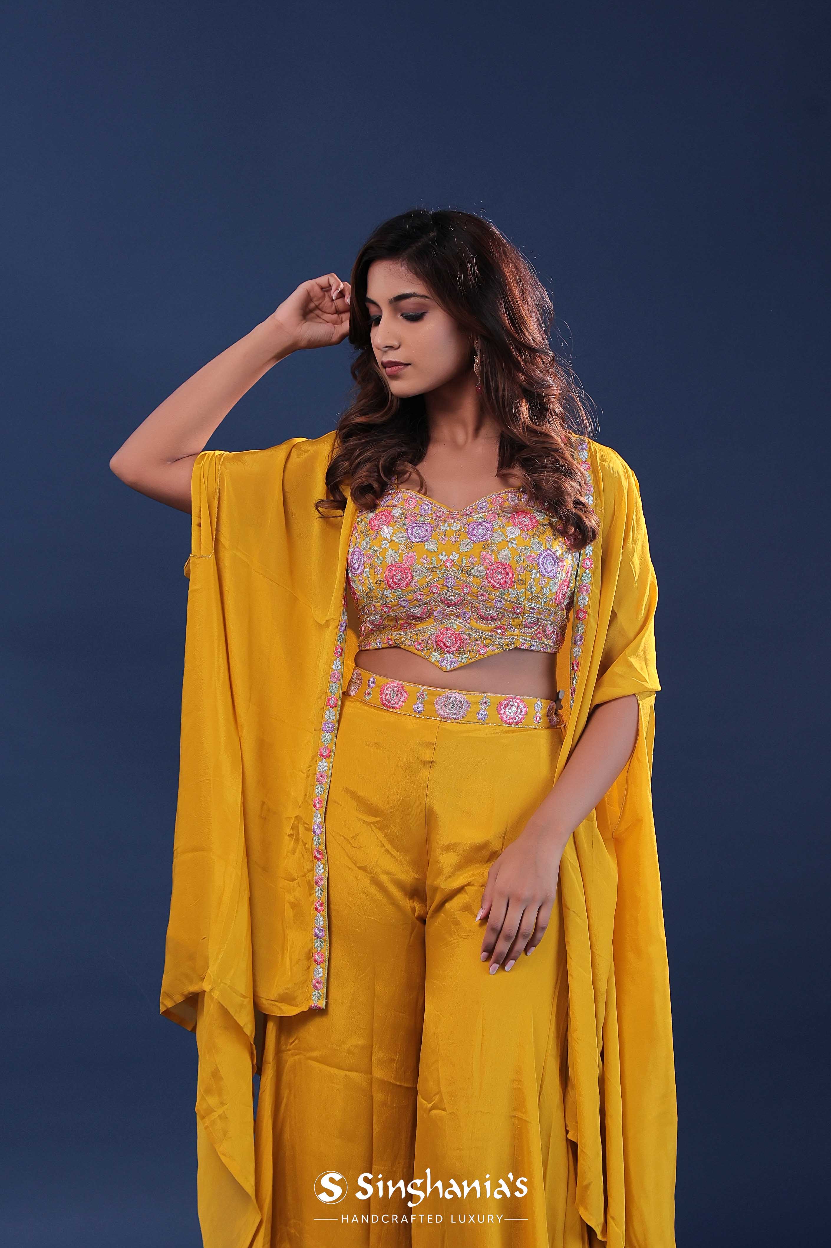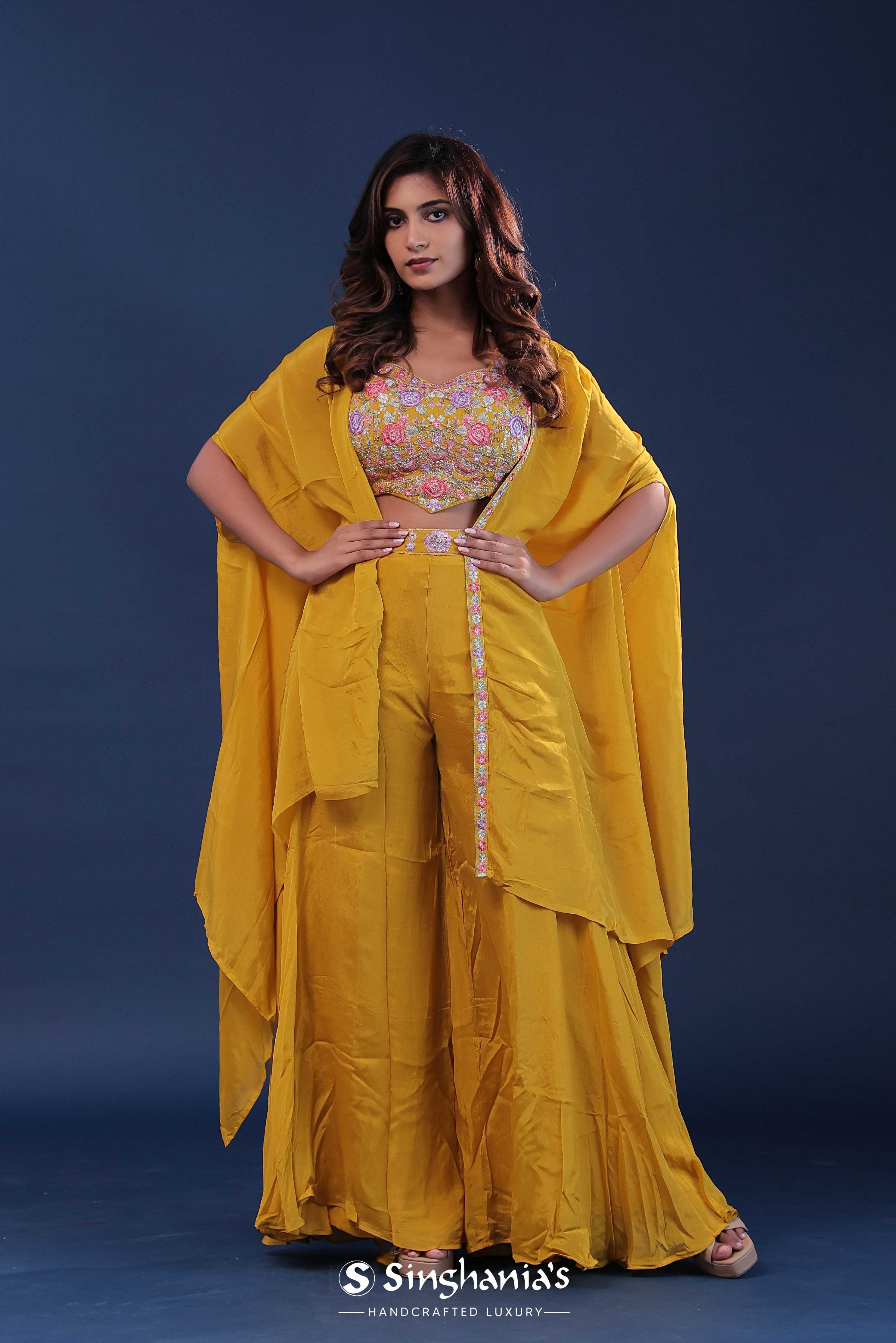 Amber yellow georgette indo-western set features georgette blouse adorned with colorfull floral embroidery.The matching palazzo pants and crepe jacket adds the finishing touch making it perfect for any occasions .