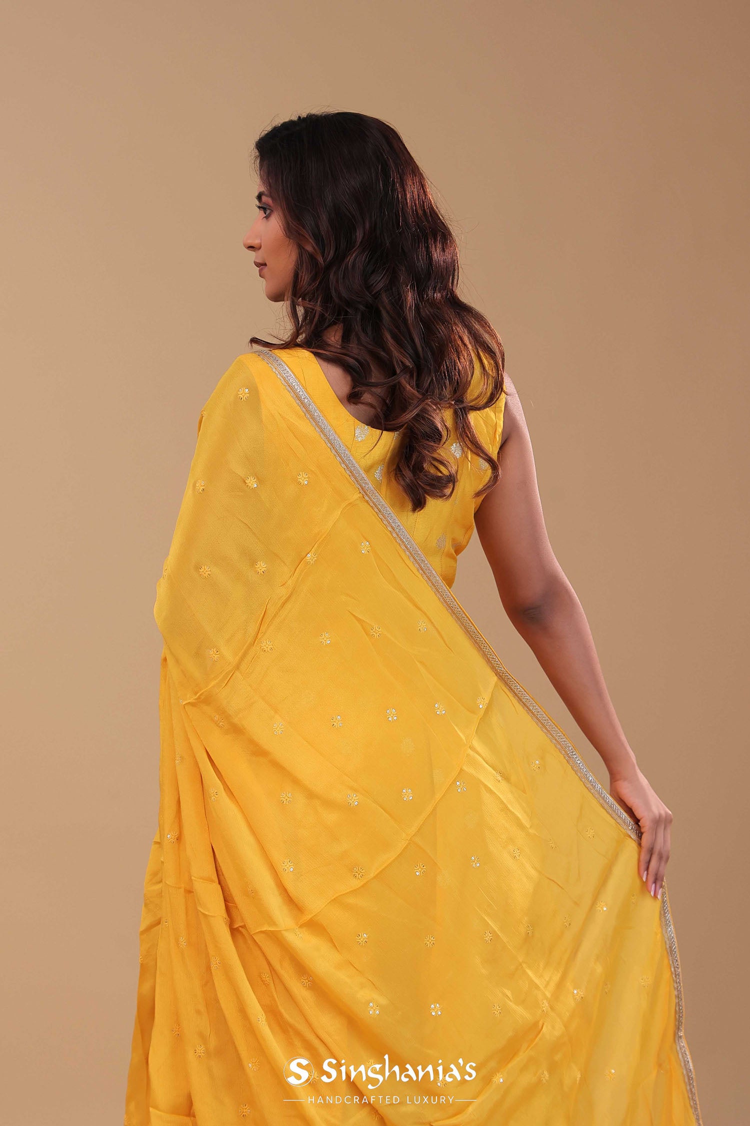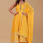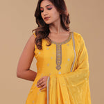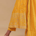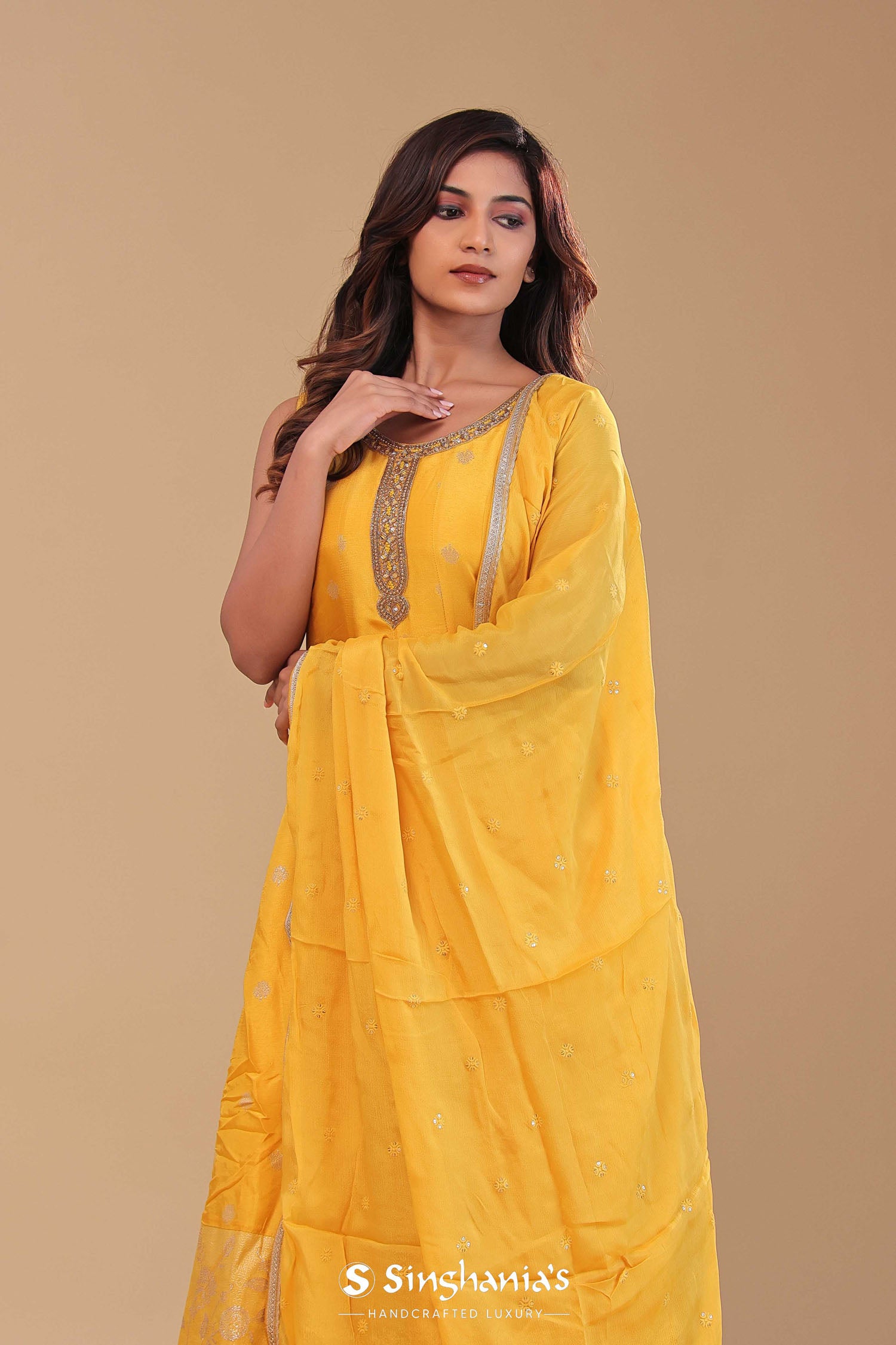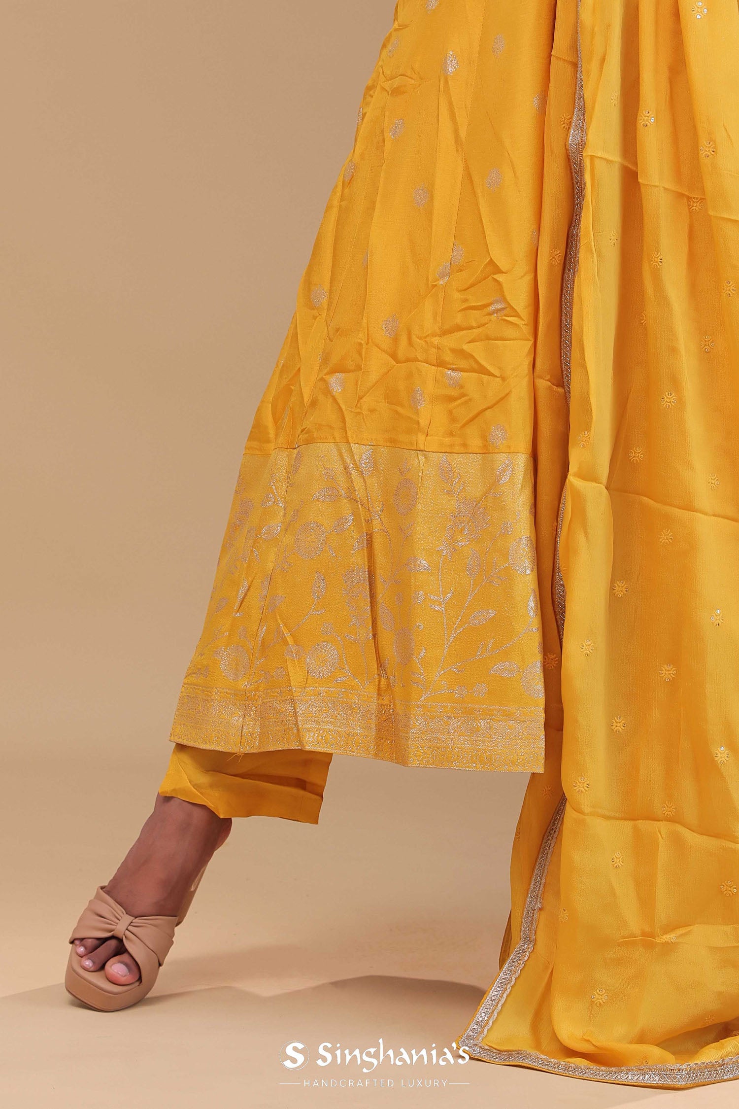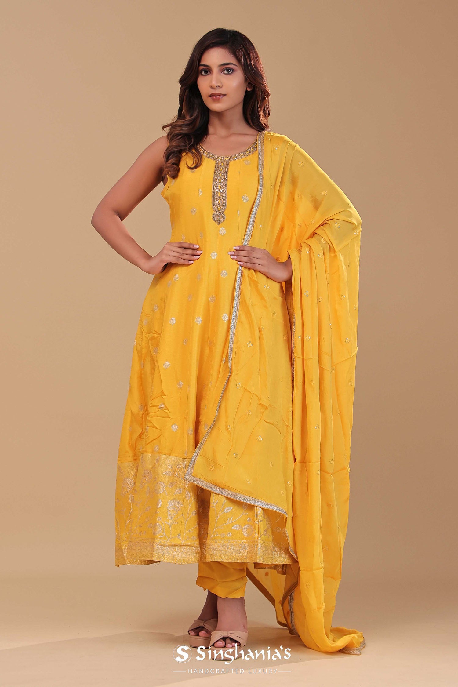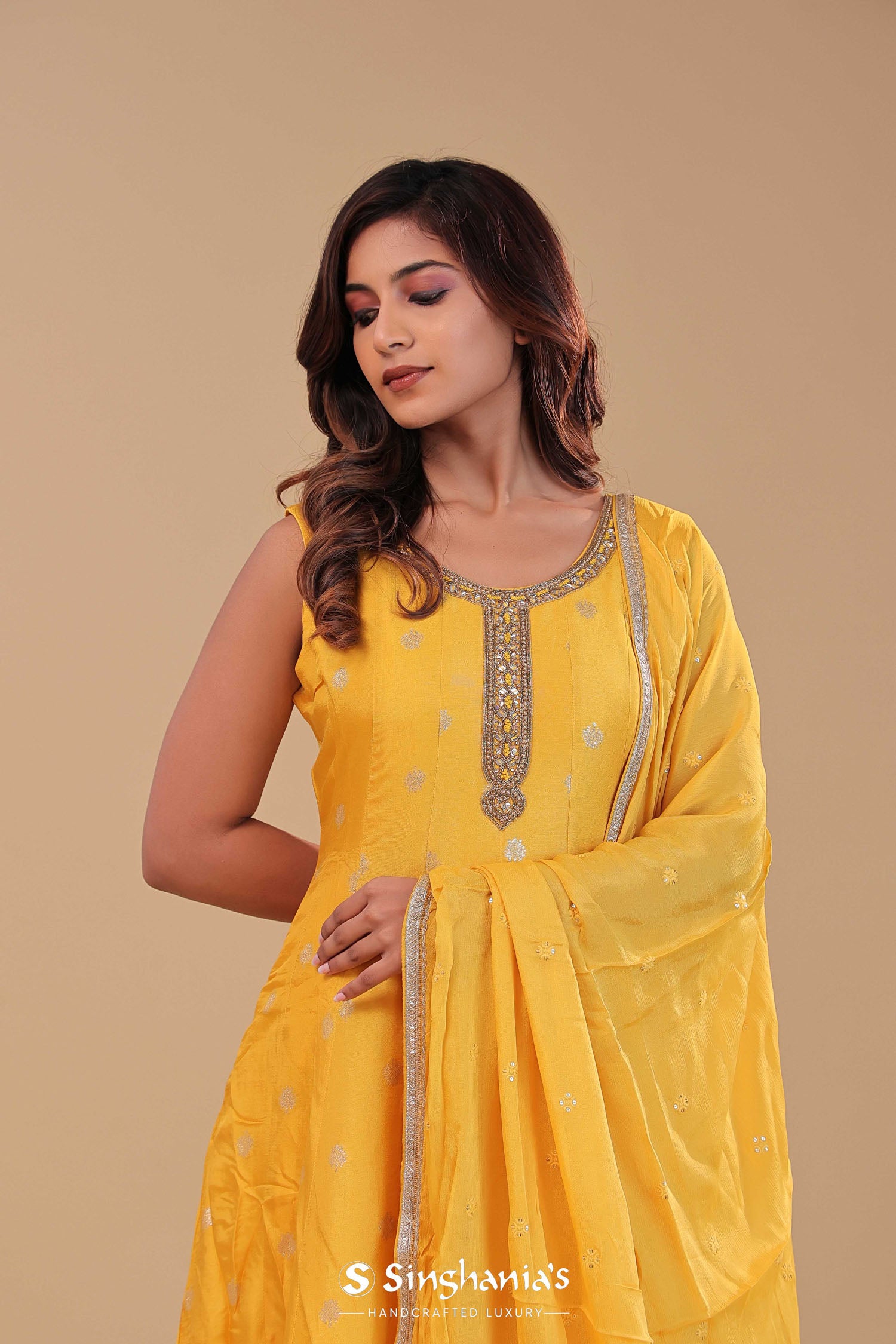 Amber yellow silk anarkali set features round neck anarkali with embroidery, woven butti's and self border. The embroidery butti's and small border adds the finishing touch to the entire garment