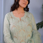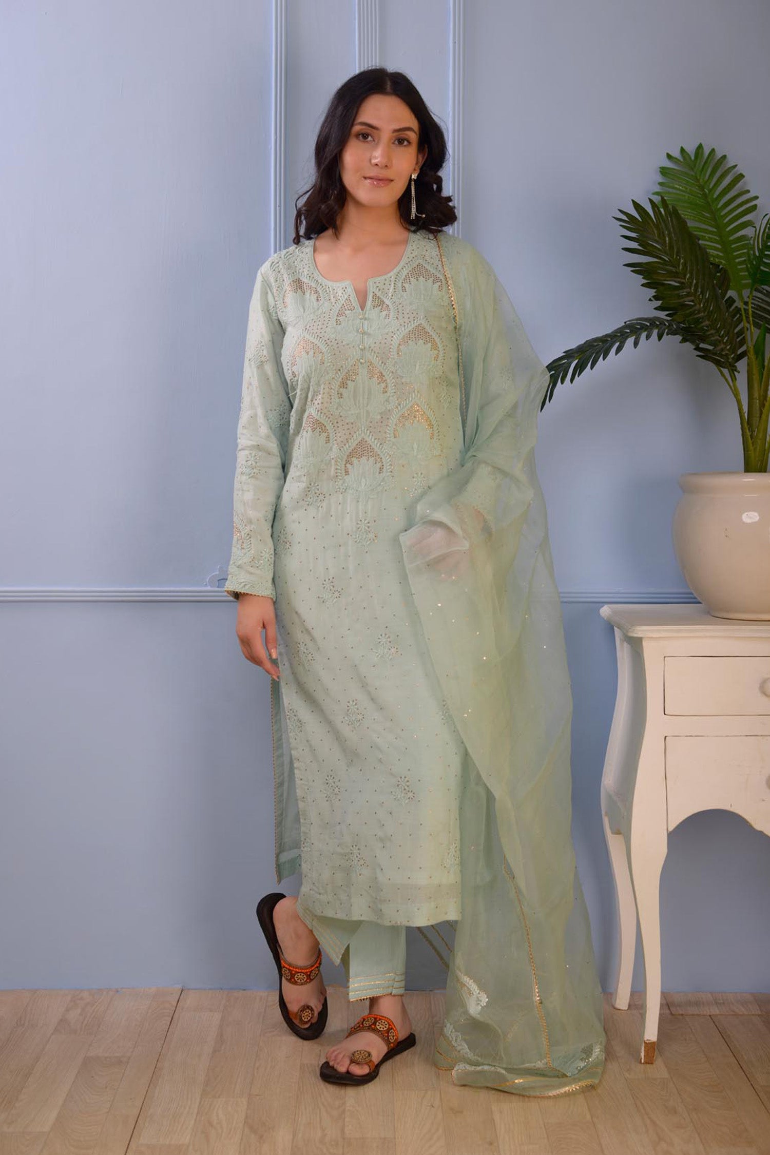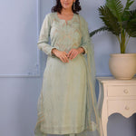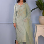 The cotton silk straight kurti set with floral design and the matching pants and dupatta for a casual yet dignified look along with the stylish comfort